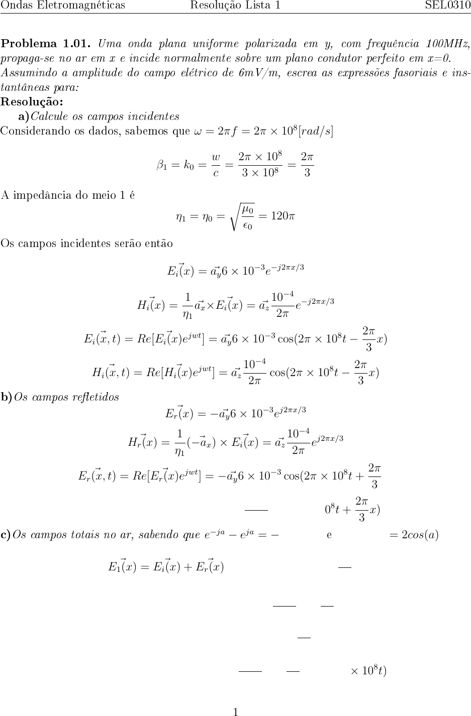 Ondas Eletromagnéticas Resolução Lista 1 SEL0310 Problema 1.01. Uma onda plana uniforme polarizada em y, com frequência 100MHz, propaga-se no ar em x e incide normalmente sobre um plano condutor perfeito em x=0. Assumindo a amplitude do campo elétrico de 6mV/m, escrea as expressões fasoriais e ins- tantâneas para: Resolução: a)Calcule os campos incidentes Considerando os dados, sabemos que ω = 2πf = 2π × 108[rad/s] β1 = k0 = w c = 2π × 108 3× 108 = 2π 3 A impedância do meio 1 é η1 = η0 = √ µ0 ε0 = 120π Os campos incidentes serão então ~Ei(x) = ~ay6× 10−3e−j2πx/3 ~Hi(x) = 1 η1 ~ax× ~Ei(x) = ~az 10−4 2π e−j2πx/3 ~Ei(x, t) = Re[ ~Ei(x)e jwt] = ~ay6× 10−3 cos(2π × 108t− 2π 3 x) ~Hi(x, t) = Re[ ~Hi(x)e jwt] = ~az 10−4 2π cos(2π × 108t− 2π 3 x) b)Os campos re�etidos ~Er(x) = −~ay6× 10−3ej2πx/3 ~Hr(x) = 1 η1 ( ~−ax)× ~Ei(x) = ~az 10−4 2π ej2πx/3 ~Er(x, t) = Re[ ~Er(x)e jwt] = −~ay6× 10−3 cos(2π × 108t+ 2π 3 x) ~Hr(x, t) = Re[ ~Hr(x)e jwt] = ~az 10−4 2π cos(2π × 108t+ 2π 3 x) c)Os campos totais no ar, sabendo que e−ja − eja = −j2sin(a) e e−ja + eja = 2cos(a) ~E1(x) = ~Ei(x) + ~Er(x) = −~ayj12× 10−3 sin( 2π 3 x) ~H1(x) = ~Hi(x) + ~Hr(x) = ~az 10−4 π cos( 2π 3 x) ~E1(x, t) = Re[ ~E1(x)e jwt] = ~ay12× 10−3 sin( 2π 3 x)sin(2π × 108t) ~H1(x, t) = Re[ ~H1(x)e jwt] = ~az 10−4 π cos( 2π 3 x) cos(2π × 108t) 1 Ondas Eletromagnéticas Resolução Lista 1 SEL0310 d)Determine o local mais próximo ao plano condutor onde o campo total é nulo Esse ponto pode ser encontrado em λ/2, portanto, para λ1 = 2π β1 x = −λ1 2 = − π β1 = − π 2π 3 = −3 2 [m] Problema 1.02. (slides) Uma onda plana uniforme em um meio sem perdas e com impedância η1 incide normalmente sobre uma interface com um outro meio sem perdas e de impedância intrínsica η2. Obtenha expressões para as densidades de potência média em ambos os meios. Resolução: Escrevendo os campos incidentes, re�etidos e transmitidos, temos: ~Ei(z) = ~axEi0e −jβ1z → ~Hi(z) = ~ay Ei0 η1 e−jβ1z ~Er(z) = ~axEr0e jβ1z → ~Hr(z) = ( ~−az)× ~Er(z) η1 = ~−ay Er0 η1 ejβ1z ~Et(z) = ~axEr0e −jβ2z → ~Ht(z) = (~az)× ~Et(z) η2 = ~ay Et0 η2 e−jβ2z Através das equações acima, aplicando as condições de contorno ~Ei(z = 0) + ~Er(z = 0) = ~Et(z = 0) e ~Hi(z = 0) + ~Hr(z = 0) = ~Ht(z = 0). Portanto R = ~Er0 ~Ei0 = η2 − η1 η2 + η1 −→ T = ~Et0 ~Ei0 = 2η2 η2 + η1 Para calcular a densidade de potência no meio 1, calcula-se o campo total. Assim ~E1(z) = ~Ei(z) + ~Er(z) = ~axEi0(e −jβ1z +Rejβ1z) = ~axEi0e −jβ1z(1 +Re2jβ1z) ~H1(z) = ~Hi(z) + ~Hr(z) = ~ay Ei0 η1 (e−jβ1z −Rejβ1z) = ~ay Ei0 η1 e−jβ1z(1−Re2jβ1z) A densidade de potência, através do vetor de Poynting do meio 1 é então Pav1 = 1 2 Re[ ~E1 × ~H∗1 ] = 1 2 Re[( ~axEi0e−jβ1z(1 +Re2jβ1z))× (~ay Ei0 η1 ejβ1z(1−Re−2jβ1z))] Pav1 = (~az) E2 i0 2η1 Re[(1 +Re2jβ1z)(1−Re2jβ1z)] = (~az) E2 i0 2η1 Re[(1−R2) +R(e2jβ1z − e−2jβ1z)] Pav1 = (~az) E2 i0 2η1 Re[(1−R2) + j2T sin(2β1z)] = (~az) E2 i0 2η1 (1−R2) Como no meio 2 só existem as ondas transmitidas Pav2 = 1 2 Re[ ~Et × ~H∗t ] = 1 2 Re[( ~axTEi0e−jβ2z)× (~ay TEi0 η2 ejβ2z)] 2 Ondas Eletromagnéticas Resolução Lista 1 SEL0310 Pav2 = ~az E2 i0 2η2 T 2 Como não há perdas no meio, a potência do meio 1 deve ser igual à do meio 2. Portanto Pav1 = Pav2 ⇒ 1−R2 = η1 η2 T 2 Problema 1.03. (Cheng Cap 8 Ex 22) Uma onda plana uniforme e senoidal se propaga pelo ar com a seguinte expressão fasorial para a intensidade do campo elétrico ~Ei(x, z) = ~ay10e −j(6x+8z) Essa onda incide em z=0 em um meio não magnético de constante relativa εr = 2, 5. Calcule: a) A frequência e o comprimento de onda dessa onda. Nesse exercício está sendo adotado o modo TE, como mostra a �gura 1. A constante de fase ~k = kx ~ax + kz ~az = 6 ~ax + 8~az. Assim, β = √ k2x + k2z = √ 62 + 82 = 10 rad/m λ = 2π β → λ = 0.628 [m] f = c λ → f = 4.78× 108 [Hz] ω = 2πf = 3× 109rad/s Figura 1: Figura para o exercício 1.03 b) Determine o ângulo de incidência. tan−−1(6 8 ) = 36.86◦ c) Escreva a expressão dos campos ~Ei(x, z, t) e ~Hi(x, z, t), mostrando a dependência temporal com o cosseno. ~Ei(x, z, t) = ~ay10 cos(3× 109t− 6x− 8z) 3 Ondas Eletromagnéticas Resolução Lista 1 SEL0310 ~Hi(x, z) = 1 η0 ~ani × ~Ei(x, z)→ ~ani = 0.6 ~ax + 0.8~az ~Hi(x, z) = 1 120π ( ~ax0.6 + ~az0.8)× (~ay10e −j(6x+8z)) ~Hi(x, z) = 1 120π (~az6− ~ax8)e −j(6x+8z) → ~Hi(x, z, t) = 1 120π (~az6− ~ax8) cos(3×109t−6x−8z) d) Determine os coe�cientes de re�exão e de transmissão. De acordo com a Lei de Snell, sin(θt) = sin(θi) √ ε1 ε2 = sin(36.86) √ 1 2.5 = 0.38→ θt = 22.3◦ Assim, através das fórmulas obtidas em aula η2 = η0 √ µ2 ε2 = 1 189.7π R = Er0 Ei0 = η2cos(θi)− η1cos(θt) η2cos(θi) + η1cos(θt) = −0.292 T = Et0 Ei0 = 2η2cos(θi) η2cos(θi) + η1cos(θt) = 0.707 e) Encontre os campos elétricos e magnéticos para as ondas re�etidas ~Er, ~Hr e transmi- tidas ~Et, ~Ht ~Er(x, z) = ~ayR× 10e−j(6x−8z) → ~Er(x, z) = −~ay2.92e−j(6x−8z) ~Er(x, z, t) = −~ay2.92 cos(3× 109t− 6x+ 8z) ~Hr(x, z) = 1 η0 (0.6 ~ax−0.8~az)×(−~ay)2.92e−j(6x−8z) → ~Hr(x, z) = 1 120π (−1.75~az−2.33 ~ax)e−j(6x−8z) ~Hr(x, z, t) = 1 120π (−1.75~az − 2.33 ~ax) cos(3× 109t− 6x+ 8z) Como o ângulo de transmissão é 22,3, sin 22.3 = 0.38 e cos(22.3) = 0.92. Assim, ~Et(x, z) = ~ayT × 10e−j(3.8x+9.2z) → ~Et(x, z) = ~ay7.07e −j(3.8x+9.2z) ~Et(x, z, t) = ~ay7.07 cos(3× 109t− 3.8x− 9.2z) ~Ht(x, z) = 1 η2 (0.38 ~ax+0.92~az)×(~ay)7.07e−j(3.8x+9.2z) → ~Ht(x, z) = 1 189.7π (2.68~az−6.5 ~ax)e−j(3.8x+9.2z) ~Ht(x, z, t) = 1 189.7π (2.68~az − 6.5 ~ax) cos(3× 109t− 3.8x− 9.2z) f)Determine o ânglulo de Brewster e o ângulo de incidência para ocorrer re�exão total (e