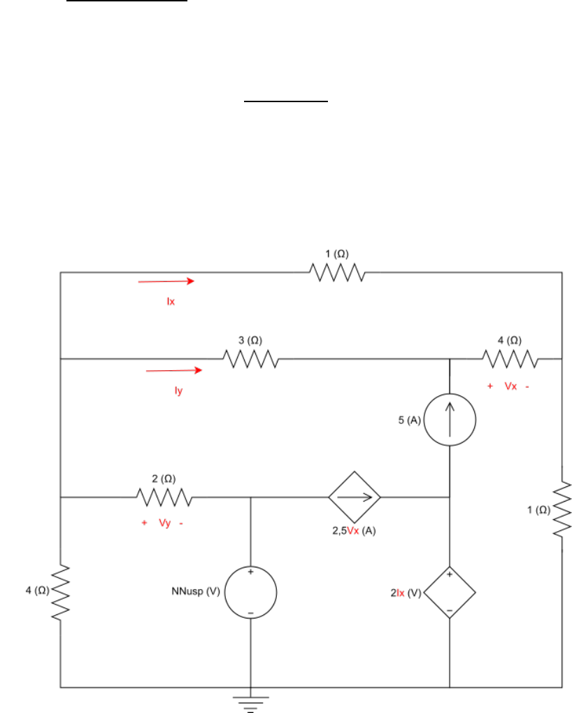 Circuitos Elétricos II – SEL0301 Exercício 01 – 14/04/2023 Professor: Mário Oleskovicz Aluno: __________________________________________ Nº USP: ______________ Exercício 1) Para o circuito mostrado abaixo, faça o que se pede. Observação: a solução deve considerar que a variável NNusp é igual aos dois últimos dígitos do seu número USP. Caso o final do seu número USP seja “00”, utilizar “50” para a resolução do exercício. a) Calcule os valores das variáveis Ix, Iy, Vx e Vy pelo método analítico. (0,2 pontos) b) Simule o circuito no PSPICE e resolva utilizando a análise “Bias Point Detail”. (0,2 pontos) c) Compare os resultados obtidos analiticamente e com a simulação, por meio de uma tabela. (0,1 pontos). Resolução Item 1.a) Orientações: aqui o aluno deve inserir o desenho e a resolução analítica do circuito (essa resolução pode ser feita à mão e digitalizada para inserção no pdf final a ser entregue, desde que seja feita de forma legível e organizada) Resolução Item 1.b) Orientações: aqui o aluno deve inserir a resolução no software PSPICE Deve ser inserido o desenho do circuito modelado no PSPICE, detalhando os valores de todos os componentes inseridos; Após a simulação, deve ser inserido outro desenho no relatório, contendo as tensões e/ou correntes calculadas pelo PSPICE, sendo destacadas as tensões e/ou correntes solicitadas no exercício; Deve ser inserido no relatório o conteúdo do arquivo de saída gerado pelo próprio PSPICE (Simulation Output File) sem qualquer manipulação manual do aluno (isso será verificado). Resolução Item 1.c) Orientações: o aluno deve confrontar os resultados obtidos com a resolução teórica e com o software PSPICE por meio, por exemplo, de uma tabela. Caso o aluno encontre diferenças, o motivo das mesmas deve ser esclarecido