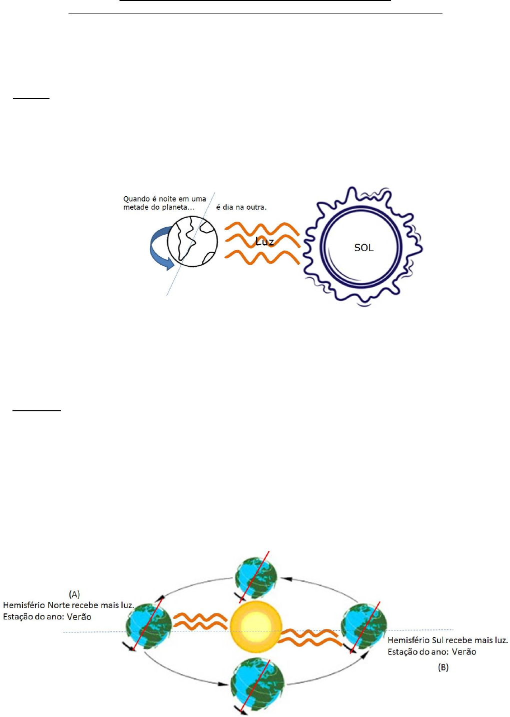 COLÉGIO PEDRO II – CAMPUS TIJUCA II - CIÊNCIAS – 6º ANO ATIVIDADE COMPLEMENTAR 4 – MOVIMENTOS DO PLANETA TERRA – Prof.ª Aline Nome: ___________________________________________________________Turma:____________ A Terra realiza dois movimentos de grande importância para nós: rotação e translação. A) Rotação: é o movimento que a Terra realiza em torno do próprio eixo, tendo como consequência a sucessão dos dias e das noites. Isso ocorre porque devido ao formato da Terra, nem todas as partes do nosso planeta serão iluminadas ao mesmo momento. Observe a imagem a seguir e pinte a metade iluminada pelo Sol com uma cor clara de forma a representar o dia e a outra metade com uma cor escura, representando a noite. Figura 1: Como consequência do movimento de rotação da Terra há a sucessão dos dias e noites. O período de rotação é de aproximadamente 24h. Observe que na figura 1 a Terra foi representada inclinada. Não é um erro, na verdade a Terra tem uma inclinação de aproximadamente 23,5o em relação ao seu eixo perpendicular. B) Translação: é o movimento que a Terra realiza ao redor do Sol. A Terra leva 365 dias e 6 horas para dar uma volta completa e esse período nós chamamos de ano. Para corrigir o nosso calendário com a órbita ao redor do Sol, a cada quatro anos é acrescentado um dia a mais no mês de fevereiro (ano bissexto). As estações do ano (primavera, verão, outono e inverno) são decorrentes do eixo inclinado da Terra e o movimento de translação. Esta inclinação faz com que a orientação da Terra em relação ao Sol mude continuamente enquanto a Terra gira em torno do Sol. Portanto, a luz do Sol não atinge igualmente os hemisférios Sul e Norte. Por isso quando é inverno no hemisfério norte, é verão no hemisfério sul. Observe a imagem a seguir. Figura 2: As estações do ano são consequência da inclinação do eixo da Terra e de seu movimento ao redor do Sol. Observando a figura 2, qual a estação do ano no hemisfério Sul quando a Terra está no ponto A? Se você respondeu inverno, acertou. No ponto A o hemisfério Sul se inclina para longe do Sol, recebendo menos energia. Vamos repetir o raciocínio observando a Terra no ponto B. Qual a estação do ano no hemisfério Norte? Novamente a resposta é inverno. Desta vez é o hemisfério Norte que está inclinado para longe do Sol, recebendo menos energia. Verificando! 1. Qual o movimento que a Terra realiza é responsável pela sucessão dos dias e das noites? __________________ 2. Qual a duração desse movimento? ____________________________________________________________ 3. Qual o nome do movimento que a Terra realiza em torno do Sol?_____________________________________ 4. Qual a duração desse movimento? ____________________________________________________________ 5. A inclinação do eixo da Terra junto com o movimento em torno do Sol é responsável pelas ____________________________________________________. Sugestões de vídeos https://www.youtube.com/watch?v=aMT9MoVC8x8 https://www.youtube.com/watch?v=Qejc-mAObgw&t=134s https://www.youtube.com/watch?v=aMT9MoVC8x8 https://www.youtube.com/watch?v=Qejc-mAObgw&t=134s
