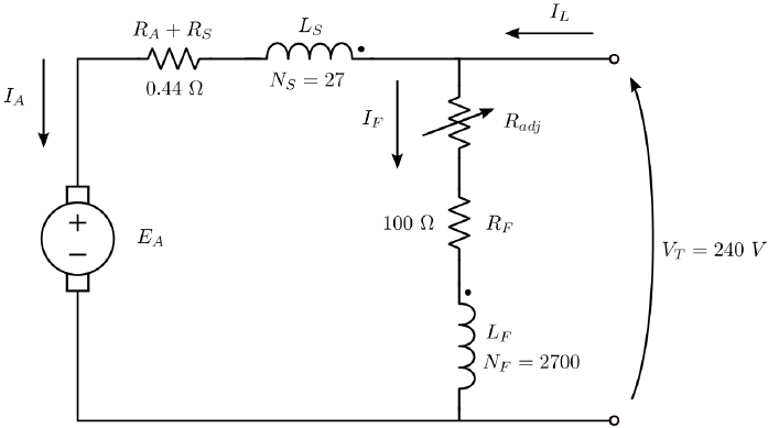 Atividade de Ponto Extra - 8 SEL0329 - Conversão Eletromecânica de Energia Entrega: início da próxima aula Questão 1) Um motor de corrente contínua possui os seguintes dados: • Potência mecânica nominal = 15 HP; • Tensão nominal de armadura Vt = 240 V; • Velocidade nominal de rotação ω = 1200 RPM; • Corrente nominal de entrada IL = 55 A Esse motor é ligado na configuração composto cumulativo, como esquematizado na figura 2. A curva de magnetização do motor se encontra em 1. Se a resistência adicional é ajustada em Radj = 175 Ω, responda: (1.a) Qual é a velocidade em vazio do motor? (Resp.: 1063 RPM); (1.b) Qual é a velocidade a plena carga do motor? (Resp.: 895 RPM ) (1.c) Qual é o torque induzido a plena carga do motor? (Resp.: 125 N.m−1) Figura 1: Circuito magnético equivalente do motor em estudo. 1 0 0.1 0.2 0.3 0.4 0.5 0.6 0.7 0.8 0.9 1 1.1 1.2 1.3 1.4 0 20 40 60 80 100 120 140 160 180 200 220 240 260 280 300 Curva de magnetização do motor Te ns ão g er ad a ( V ) Corrente de campo (A) Figura 2: Curva de magnetização do motor em estudo, a uma velocidade de 1200 rotacões por minuto. 2