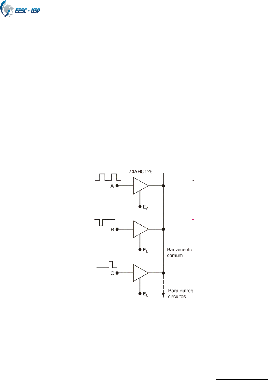 Departamento de Engenharia Elétrica e de Computação SEL 0415 – IINNTTRROODD.. ÀÀ OORRGGAANNIIZZAAÇÇÃÃOO DDEE CCOOMMPPUUTTAADDOORREESS 3a. LISTA DE EXERCÍCIOS : EXERCÍCIOS SOBRE TRISTATE, COLETOR ABERTO E TOTEM-POLE:AULA 3 1.1. Quais os três possíveis estados de saída de um CI tristate? 1.2. Por que as saídas das portas com configuração totem- pole não podem ser ligadas juntas? 1.3. Em que as saídas a coletor aberto diferem da totem-pole? 1.4. Por que as saídas a coletor aberto necessitam de um resistor pull-up? 1.5. Quais condições são necessárias para permitir a transmissão do sinal C ao longo do barramento da Figura 1? Figura1 Buffers tri-state usados para conectarem vários sinais a um barramento 1.6. Considere que 3 dispositivos de entrada com saída TTL padrão, devem ser conectados a um microprocessador 64 linhas de endereços e de 8 bits de duto de dados, e que cada dispositivo deve transmitir dados de 1 bit na linha D0 do microprocessador. Usando portas “tri-state” e decodificadores, faça o hardware de maneira a garantir que a comunicação ocorra sem conflito na transmissão dos dados. OBS: considere que cada dispositivo ocupa uma posição no espaço de endereço do microprocessador. O endereço de cada dispositivo é de livre escolha.