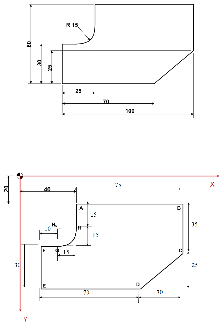 Escola de Engenharia de São Carlos-USP Departamento de Engenharia Mecânica SEM350 – Manufatura Assistida por Computador EXERCÍCIO 01 1. Escolha um ponto para a origem do sistema de coordenadas no perfil da peça dada a seguir (zero-peça). Em seguida, defina um sentido hipotético de usinagem e identifique cada ponto da trajetória da ferramenta (final de cada linha). 2. Faça o mesmo para a peça abaixo, considerando a origem (zero-peça) já previamente escolhida abaixo.