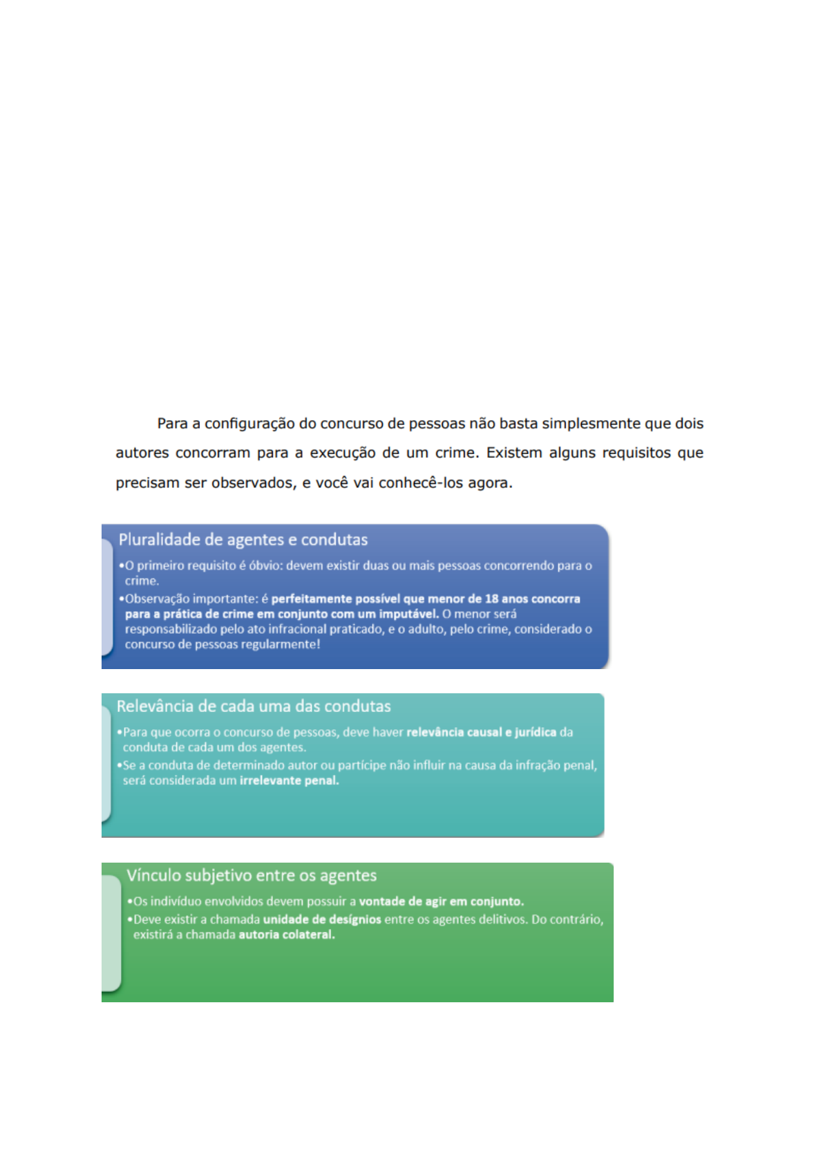 1- A teoria do domínio do fato funciona como uma ratio para aferir a existência do nexo de causalidade entre o crime e o agente e serve de fundamento para considerar que houve participação no crime em razão da posição de gestor, diretor ou sócio administrador de empresa ou organização. V ou F ? Explique. R: Falso. A teoria do domínio do fato não traz o partícipe, mas sim o coautor. 2. Para a configuração do concurso de agentes, é necessária a pluralidade de participantes e de condutas, a relevância causal de cada conduta e a unidade de tipificação penal, sendo dispensável liame subjetivo. V ou F ? Explique. R: Falsa. Haja vista que o Liame subjetivo ou vínculo subjetivo é um dos requisitos para a configuração do concurso de agentes. 3. Quanto ao concurso de pessoas, o Código Penal adota, como regra, a teoria unitária ou monista e, excepcionalmente, a teoria pluralista. V ou F ? Explique. R: Verdadeira. O Código Penal brasileiro adota, como regra, a teoria monista ou unitária, que considera que todos- autores, coautores e participes- respondem pelo mesmo crime. A teoria pluralista, por sua vez, considera que para uma pluralidade de agentes haverá uma pluralidade de crimes. 4. João é servidor público do Estado de Santa Catarina. Vendo que sua repartição conta com computadores modernos, muito valiosos no mercado, acerta com José, seu amigo, que usualmente pratica roubos e furtos (o qual se sabe já ter sido condenado, com pena extinta há um ano pelo seu cumprimento), a subtração dos referidos computadores para posterior revenda. No dia combinado, João, valendo-se do acesso facilitado à repartição pública, ingressa no local, permite a entrada de José, e ambos subtraem, para si, cerca de 10 computadores portáteis. Considerando a situação narrada, sobre o concurso de pessoas, José responderia por qual crime? Explique. R: João e José deverão responder por peculato, ainda que apenas João seja servidor público, pois esta circunstância é elementar do tipo. O peculato é considerado crime próprio, ou seja, somente pode ser cometido por funcionário público (CP, art. 327 e §§). Essa qualidade exigida, configurando elementar do tipo, comunica-se, em caso de concurso, aos demais participantes, ainda que particulares, desde que haja ingressado na esfera de seu conhecimento, nos termos do art. 30 do CP. 5. Gerald, Harold, Arnold, Sid e Eugene se reúnem de forma permanente e estável, por alguns meses, planejando roubos a determinados bancos. Ultimada essa fase, deflagram a execução do roubo, com emprego de simulacros de armas de fogo, sendo certo que Harold, Arnold, Sid e Eugene ingressam no estabelecimento bancário, realizando a rendição das pessoas e a coleta do dinheiro em espécie, ao passo que Gerald permanece com um veículo de fuga ligado, na porta do banco. Quando da fuga, são cercados pela polícia, dentro do carro, no quarteirão imediatamente posterior, ainda em posse dos simulacros e do dinheiro arrecadado. Os agentes vão responder por quais crimes? R: Associação Criminosa e Roubo qualificado. Existem crimes cujas penas são exasperadas, mediante a previsão de qualificadoras ou causas de aumento da pena, quando praticados em concurso de pessoas. É o que ocorre, entre outros casos, no furto (CP, art. 155, § 4º, inciso IV), no roubo (CP, art. 157, § 2º, inciso II) e na extorsão (CP, art. 158, § 1º, 1ª parte). No caso narrado, os agentes serão responsabilizados por roubo majorado pelo concurso de pessoas e associação criminosa, em concurso material, não ocorrendo bis in idem (dupla punição pelo mesmo fato), pois a pluralidade de pessoas é aferida em momentos distintos. Além disso, os crimes são autônomos e independentes entre si, ofendem bens jurídicos diversos e consumam-se em momentos diferentes. A associação criminosa é delito contra a paz pública e, por outro lado, o roubo desponta como crime contra o patrimônio. 6. Júlio, recém-habilitado para a condução de veículos automotores, pegou emprestado o carro de seu pai, Pedro, para ir a um evento. Pouco tempo depois, ao tentar fazer uma ultrapassagem, Júlio invadiu a calçada, atropelou e matou uma criança que se encontrava parada em um ponto de ônibus. Acerca dessa situação hipotética e de aspectos legais a ela pertinentes, assinale a opção correta. Alternativas A)Pedro não poderá ser responsabilizado pela conduta de Júlio, porque o ordenamento jurídico pátrio não admite o concurso de pessoas nos delitos culposos. Errada. Crimes culposos admitem concurso de pessoas. B)Pedro deverá ser responsabilizado pela sua conduta negligente, na condição de partícipe. C)Os crimes culposos admitem a coautoria e a participação, porém, na hipótese em apreço, Pedro não deverá ser responsabilizado, pois sua conduta não deu causa ao resultado. Errada. Crime culposo admite coautoria, mas não admite participação. D)O ordenamento jurídico brasileiro não admite a participação em crime culposo, e Pedro não poderá ser responsabilizado, porquanto não violou nenhum dever jurídico apto a gerar consequências penais. Correta. E)Pedro e Júlio são igualmente coautores do homicídio culposo, porquanto deram causa ao resultado em razão da falta do dever de cuidado objetivo, presente na conduta de ambos. 7. Jerônimo, motoboy autónomo, conduz sua motocicleta sem as placas de identificação, para fazer a entrega de pizza a um cliente, quando é flagrado em uma blitz policial, resta apurado que o veículo pertencia & Pizzaria Massa Italiana, cujo proprietário retirara as placas, com o objetivo de não ser multado em decorrência de eventuais infrações de trânsito cometidas pelos entregadores do restaurante. Diante do caso narrado, é correto afirmar que Jerônimo praticou crime de adulteração de sinal identificador de veículo? Explique Se Jerônimo não tem ciência ele não pode ser responsabilizado. Quem praticou a conduta é o d