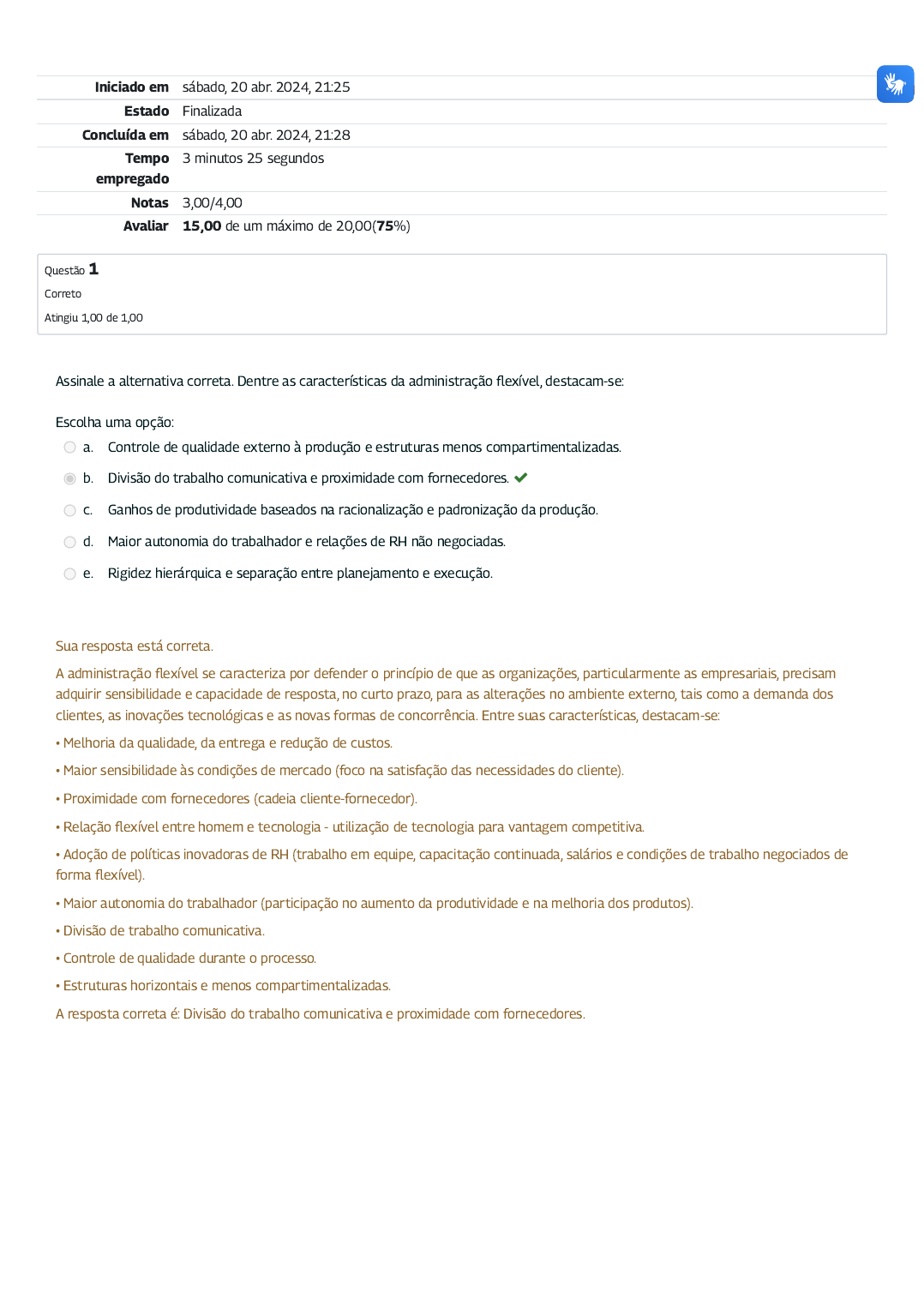 Iniciado em sábado, 20 abr. 2024, 21:25 Estado Finalizada Concluída em sábado, 20 abr. 2024, 21:28 Tempo empregado 3 minutos 25 segundos Notas 3,00/4,00 Avaliar 15,00 de um máximo de 20,00(75%) Questão 1 Correto Atingiu 1,00 de 1,00 Assinale a alternativa correta. Dentre as características da administração �exível, destacam-se: Escolha uma opção: a. Controle de qualidade externo à produção e estruturas menos compartimentalizadas. b. Divisão do trabalho comunicativa e proximidade com fornecedores. c. Ganhos de produtividade baseados na racionalização e padronização da produção. d. Maior autonomia do trabalhador e relações de RH não negociadas. e. Rigidez hierárquica e separação entre planejamento e execução. Sua resposta está correta. A administração �exível se caracteriza por defender o princípio de que as organizações, particularmente as empresariais, precisam adquirir sensibilidade e capacidade de resposta, no curto prazo, para as alterações no ambiente externo, tais como a demanda dos clientes, as inovações tecnológicas e as novas formas de concorrência. Entre suas características, destacam-se: • Melhoria da qualidade, da entrega e redução de custos. • Maior sensibilidade às condições de mercado (foco na satisfação das necessidades do cliente). • Proximidade com fornecedores (cadeia cliente-fornecedor). • Relação �exível entre homem e tecnologia - utilização de tecnologia para vantagem competitiva. • Adoção de políticas inovadoras de RH (trabalho em equipe, capacitação continuada, salários e condições de trabalho negociados de forma �exível). • Maior autonomia do trabalhador (participação no aumento da produtividade e na melhoria dos produtos). • Divisão de trabalho comunicativa. • Controle de qualidade durante o processo. • Estruturas horizontais e menos compartimentalizadas. A resposta correta é: Divisão do trabalho comunicativa e proximidade com fornecedores. Questão 2 Correto Atingiu 1,00 de 1,00 É uma característica da gestão tradicional ou por função: Escolha uma opção: a. Tomada de decisão compartilhada b. Responsabilização c. Divisão do trabalho d. Estruturas verticalizadas e. Redução de �uxos Sua resposta está correta. A Gestão Tradicional é uma estrutura baseada em divisões hierárquicas (por caixas). Nesse modelo, as organizações geralmente constituem um conjunto de unidades funcionais verticalizadas, ou seja, isoladas e operando com pouquíssima interação. A imagem mais comum nesse caso é a da torre de caixinhas, que muitos associam com centralização e morosidade na tomada das decisões. Características da Gestão Tradicional: • Compartimentação (silos). • Subotimização do todo. • Impede o contato interdepartamental e interfuncional. • Gestão lenta e pesada (não consegue acompanhar o novo ritmo tecnológico e gerencial). • Estruturas verticalizadas. • Estruturas gerenciais e processos de trabalho desenhados há décadas. • Esforços centrados para tarefas, pessoas ou estruturas. A resposta correta é: Estruturas verticalizadas Questão 3 Incorreto Atingiu 0,00 de 1,00 Questão 4 Correto Atingiu 1,00 de 1,00 De acordo com a classi�cação dos processos por níveis e tipos, marque a única alternativa incorreta: Escolha uma opção: a. Os processos críticos podem di�cultar ou impedir a realização dos objetivos estratégicos quando não são gerenciados de forma adequada. b. Os processos �nalísticos estão diretamente relacionados aos fundamentos estratégicos da organização: missão, visão de futuro e objetivos estratégicos. c. Macroprocessos estão diretamente relacionados com fornecedores e clientes. d. Processos de apoio estão diretamente relacionados à gestão dos recursos internos da organização (atividades-meio). e. Subprocessos são processos técnicos que compõem as atividades-�m da organização, diretam ente envolvidos no atendimento às necessidades dos clientes ou usuários. Sua resposta está incorreta. A única alternativa incorreta é a letra "E", já que sua descrição refere-se aos Processos Finalísticos, e não ao nível Subprocessos. Os subprocessos são conjuntos de atividades inter-relacionadas ou interativas, que transformam insumos (entradas) em produtos ou serviços (saídas), necessárias e su�cientes para a execução dos processos. A quantidade de subprocessos depende da complexidade de cada processo. Em um nível mais detalhado, as atividades de um subprocesso são desmembradas em tarefas. A resposta correta é: Subprocessos são processos técnicos que compõem as atividades-�m da organização, diretam ente envolvidos no atendimento às necessidades dos clientes ou usuários. Marque a alternativa que apresenta o conceito correto: Escolha uma opção: a. Problema é uma referência de comparação ou o nível de desempenho desejado e em relação ao qual um processo pode ser avaliado. b. Normalização são as especi�cações que de�nem claramente como o cliente deseja receber o produto ou o serviço de seu fornecedor. c. O padrão é a diferença entre a situação desejada (proposta) e a situação do momento (atual). d. Requisitos do cliente devem ser compreendidos como o processo de formulação e aplicação de regras para atingir o desenvolvimento ordenado de uma atividade especí�ca, para o benefício e com a cooperação de todos os envolvidos. e. Produtos (bens ou serviços) são as saídas dos insumos (entradas) transformados, ou o resultado �nal especí�co das atividades realizadas, podendo ser oferecido para satisfazer a um desejo ou necessidade. Sua resposta está correta. Os produtos (bens ou serviços) são as saídas dos insumos (entradas) transformados, ou o resultado �nal especí�co das atividades realizadas, podendo ser oferecido para satisfazer a um desejo ou necessidade. A resposta correta é: Produtos (bens ou serviços) são as saídas dos ins