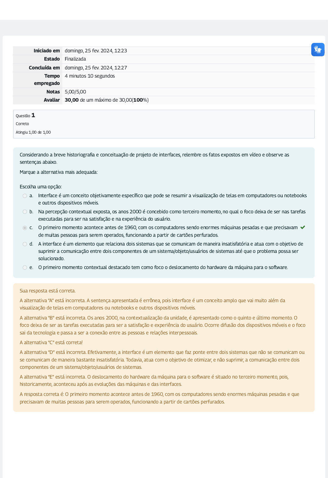Iniciado em domingo, 25 fev. 2024, 12:23 Estado Finalizada Concluída em domingo, 25 fev. 2024, 12:27 Tempo empregado 4 minutos 10 segundos Notas 5,00/5,00 Avaliar 30,00 de um máximo de 30,00(100%) Questão 1 Correto Atingiu 1,00 de 1,00 Considerando a breve historiogra�a e conceituação de projeto de interfaces, relembre os fatos expostos em vídeo e observe as sentenças abaixo. Marque a alternativa mais adequada: Escolha uma opção: a. Interface é um conceito objetivamente especí�co que pode se resumir a visualização de telas em computadores ou notebooks e outros dispositivos móveis. b. Na percepção contextual exposta, os anos 2000 é concebido como terceiro momento, no qual o foco deixa de ser nas tarefas executadas para ser na satisfação e na experiência do usuário. c. O primeiro momento acontece antes de 1960, com os computadores sendo enormes máquinas pesadas e que precisavam de muitas pessoas para serem operados, funcionando a partir de cartões perfurados. d. A interface é um elemento que relaciona dois sistemas que se comunicam de maneira insatisfatória e atua com o objetivo de suprimir a comunicação entre dois componentes de um sistema/objeto/usuários de sistemas até que o problema possa ser solucionado. e. O primeiro momento contextual destacado tem como foco o deslocamento do hardware da máquina para o so�ware. Sua resposta está correta. A alternativa “A” está incorreta. A sentença apresentada é errônea, pois interface é um conceito amplo que vai muito além da visualização de telas em computadores ou notebooks e outros dispositivos móveis. A alternativa “B” está incorreta. Os anos 2000, na contextualização da unidade, é apresentado como o quinto e último momento. O foco deixa de ser as tarefas executadas para ser a satisfação e experiência do usuário. Ocorre difusão dos dispositivos móveis e o foco sai da tecnologia e passa a ser a conexão entre as pessoas e relações interpessoais. A alternativa “C” está correta! A alternativa “D” está incorreta. Efetivamente, a interface é um elemento que faz ponte entre dois sistemas que não se comunicam ou se comunicam de maneira bastante insatisfatória. Todavia, atua com o objetivo de otimizar, e não suprimir, a comunicação entre dois componentes de um sistema/objeto/usuários de sistemas. A alternativa “E” está incorreta. O deslocamento do hardware da máquina para o so�ware é situado no terceiro momento, pois, historicamente, aconteceu após as evoluções das máquinas e das interfaces. A resposta correta é: O primeiro momento acontece antes de 1960, com os computadores sendo enormes máquinas pesadas e que precisavam de muitas pessoas para serem operados, funcionando a partir de cartões perfurados. Questão 2 Correto Atingiu 1,00 de 1,00 As interfaces se adaptam a diversos dispositivos e formatos de plataforma. Posto isso, considere os estilos de interação em diferentes dispositivos para analisar as sentenças abaixo. Marque a alternativa que representa adequadamente a interface baseada em linhas de comando. Escolha uma opção: a. Utiliza os elementos de formulário para lançamento de dados em sistemas em alta frequência, sendo bastante utilizada em call centers, sistemas bancários e órgãos do governo. É uma interface simples e de fácil utilização, especí�ca para determinadas atuações. b. São sistemas que requerem de seus usuários aprendizado prévio e curva de aprendizagem razoável para a utilização satisfatória da máquina. c. Pode ser baseada em conversação ou baseada em gestos. d. Interfaces de linhas de comando tem como principais características em sua utilização: a facilidade intuitiva nos comandos e manuseio acessível aos usuários. e. Possui duas características importantes: a necessidade de um dispositivo apontador, como um mouse ou uma caneta touch para clicar ou arrastar; e a relação que ela possui com as imagens e a sua importância. Sua resposta está correta. A alternativa “A” está incorreta. Essa sentença se refere à interface baseada em formulário. A alternativa “B” está correta! A alternativa “C” está incorreta. Essa sentença se refere à interface baseada na linguagem natural. Exemplos: conversação (texto ou voz) ou gestos (videogames). A alternativa “D” está incorreta. Essas características apresentadas se referem à interface baseada em janelas. A alternativa “E” está incorreta. Essa sentença se refere à interfaces baseadas em janelas, sendo a tradicional do Windows. A resposta correta é: São sistemas que requerem de seus usuários aprendizado prévio e curva de aprendizagem razoável para a utilização satisfatória da máquina. Questão 3 Correto Atingiu 1,00 de 1,00 Na análise de qualidade do uso, criada por Jacob Nielsen, foi elaborada uma das principais ferramentas de mensuração de análise de interface, chamada de Heurísticas de Nielsen. Marque a alternativa mais adequada que contemple as orientações que o designer precisa prestar atenção quando está desenvolvendo uma interface: Escolha uma opção: a. Deve introduzir texto com linguagem rebuscada, pois comprova seriedade. b. Possuir interface pouco intuitiva ou preditiva, objetivando aguçar a curiosidade do usuário. c. Promover ao usuário espaços ausentes de orientação em situações incomuns, assim fomenta a criticidade do usuário. d. Inconsistências no uso de padrões. e. O design deve ser estético e simples, com informação su�ciente para que o usuário consiga completar a tarefa. Sua resposta está correta. A alternativa “A” está incorreta. Não é interessante quando a parte textual está tão elaborada/rebuscada, pois �ca carregada de informação, confundindo o usuário. A alternativa “B” está incorreta. A interface precisa ser intuitiva o bastante para o usuário executar o comando ou �uxo de forma instintiva. A alternativa “C” está incorreta. Nas jornadas 