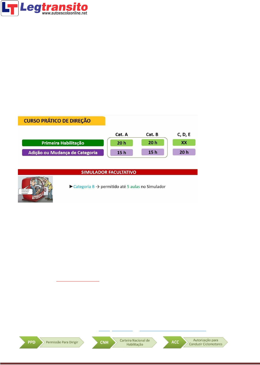 Prof. Ronaldo Cardoso | e-mail: contato@autoescolaonline.net | Canww.YouTube.com/LegTransito 1 PROCESSO de HABILITAÇÃO 1. Pré-requisitos ao candidato à habilitação: ► Ser penalmente imputável – Pessoa que possa ser responsabilizada perante a Lei Penal; ► Saber ler e escrever - Não se exige grau de escolaridade, basta que saiba ler e escrever; ► Possuir documento de identificação - RG, Carteira de Trabalho, Passaporte ou outro documento com foto; ► Possuir CPF. Obs. O processo de habilitação tem duração de 12 meses, a contar da data de cadastro no sistema BINCO (Base Índice de Condutores) e no RENACH (Registro Nacional de Carteiras de Habilitação). 2. Etapas do Processo de Habilitação: ► Avaliação Psicológica e Exames de aptidão Física e Mental; ► Curso Teórico Técnico (45 horas-aula) e Exame Teórico (70% de aproveitamento para aprovação) ► Curso Prático de Direção (20 horas-aula categoria inicial A ou B ou) e Exame de Direção. 3. ACC - Autorização para Conduzir Ciclomotores (Cinquentinhas): a. Curso Teórico com 20 horas-aula e Prova Teórica com 15 questões → mínimo 60% para aprovação. b. Curso Prático de Direção com 5 horas-aula e Prova de Direção, em motopista, conforme categoria A. Obs. Em caso de reprovação em qualquer exame, a marcação poderá ser feita após 5 dias e se reprovado pela segunda vez, poderá refazer o curso referente à etapa na qual foi reprovado → o exame pode ser realizado em ciclomotor próprio. 4. LADV – Licença e Aprendizagem e Direção Veicular: ► Documento emitido ao candidato aprovado na primeira e segunda etapa do processo de habilitação - necessário para treinamento da prática veicular. Obs. O candidato que for flagrado treinando em desacordo com a legislação de trânsito, além das sanções previstas pelo CTB, terá sua LADV suspensa por 6 meses. MACETE: Suspensa começa com “S” e Seis meses também. 5. Em qual categoria começar: ► O candidato poderá requerer as categorias A, B ou A e B simultaneamente, bem como a ACC. Obs. Ao candidato aprovado em todas as etapas do processo, será conferida a PPD ou ACC provisória, com validade de 1 ano. Caso seja reprovado, poderá repetir o exame a qualquer tempo (na ACC o prazo para reexame é de 5 dias). Obs. O portador da PPD ou d a ACC Provisória, poderá solicitar a habilitação definitiva, após 1 ano, desde que não tenha cometido nenhuma infração de natureza grave, gravíssima ou reincidência em infrações médias. mailto:contato@autoescolaonline.net Prof. Ronaldo Cardoso | e-mail: contato@autoescolaonline.net | Canww.YouTube.com/LegTransito 2 6. Outros tipos de veículos e suas definições: ► CICLOMOTOR: Veículo automotor de 2 ou 3 rodas, cuja cilindrada não exceda a 50 cm3, ou elétrico com máximo de 4 kW, e velocidade máxima de 50 km/h → popular “cinquentinha”. ► MOTONETA: Veículo automotor de 2 rodas conduzido por condutor em posição sentada. ► MOTOCICLETA: Veículo automotor de 2 rodas conduzido por condutor em posição montada. ► TRICICLO: Veículo com estrutura mecânica similar às motocicletas, dotado de três rodas dispostas simetricamente, com motor de propulsão com cilindrada superior a 50 cm3, conduzido por condutor e posição montada ou sentada. ► QUADRICICLO: Veículo automotor com estrutura mecânica similar às motocicletas, possuindo eixo dianteiro e traseiro, dotado de quatro rodas, com massa em ordem de marcha NÃO superior a 400kg, ou 550kg no caso do veículo destinado ao transporte de cargas e potência máxima NÃO superior a 15kW. ► BICICLETA ELÉTRICA: Veículo de duas rodas, impulsionado por um motor elétrico cuja potência não exceda a 350 Watts, velocidade máxima de 25 km/h, funcionamento do motor somente ao pedalar e NÃO possui acelerador. ► VEÍCULO AUTOPROPELIDO: Equipamento de mobilidade individual NÃO equiparado ao ciclomotor ou bicicleta elétrica. Velocidade máxima de 6 km/h para circular entre pedestres ou 20 km/h em ciclovias. Equipado com velocímetro, campainha e sinalização noturna; dimensões NÃO superiores a de uma cadeira de rodas. 7. Renovação da Habilitação: ► Consiste em ser aprovado nos exames físico e mental (e psicológico se EAR), observando os seguintes prazos: a. De 10 em 10 anos, para condutores com menos de 50 anos de idade; b. De 5 em 5 anos, para condutores com idade entre 50 e 69 anos; c. De 3 em 3 anos, para condutores com 70 anos ou mais; d. A critério do médico avaliador, os prazos podem ser reduzidos, em razão de alguma anormalidade. Obs. Para os condutores habilitados nas categorias C, D ou E é necessário passar por exame toxicológico. 8. Para que serve cada categoria de habilitação e quais os prazos de troca entre elas. mailto:contato@autoescolaonline.net Prof. Ronaldo Cardoso | e-mail: contato@autoescolaonline.net | Canww.YouTube.com/LegTransito 3 9. Veículo utilizado para fazer exame em cada uma das categorias e ACC: 10. Habilitação para atividades remuneradas: a. TRANSPORTE COLETIVO DE PASSAGEIROS: ► Categoria D ou E; ► Mínimo de 21 anos de idade; ► Curso de transporte coletivo de passageiros; ► Não ter cometido mais de uma infração gravíssima nos últimos 12 meses; ► Não estar sob efeito de Suspensão ou Cassação da CNH. b. TRANSPORTE ESCOLAR: ► Categoria D ou E; ► Mínimo de 21 anos de idade; ► Curso de transporte escolar; ► Não ter cometido mais de uma infração gravíssima nos últimos 12 meses; ► Não estar sob efeito de Suspensão ou Cassação da CNH. Obs. O veículo para este tipo de atividade deve possuir: Faixa amarela de 40 cm de largura; Registro como veículo de passageiros; Inspeção de segurança, semestral; Cinto para todos os ocupantes; Luzes de posição; Tacógrafo. c. OPERADOR DE MÁQUINAS: ► Categoria C, D ou E; ► Mínimo de 21 anos de idade; Obs. Não é exigida habilitação para operar estes veículos em canteiros de obras (fora da vi
