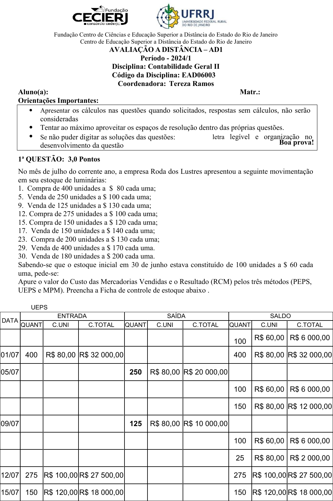 Fundação Centro de Ciências e Educação Superior a Distância do Estado do Rio de Janeiro Centro de Educação Superior a Distância do Estado do Rio de Janeiro AVALIAÇÃO A DISTÂNCIA – AD1 Período - 2024/1 Disciplina: Contabilidade Geral II Código da Disciplina: EAD06003 Coordenadora: Tereza Ramos Aluno(a): Matr.: Orientações Importantes: Boa prova! 1ª QUESTÃO: 3,0 Pontos No mês de julho do corrente ano, a empresa Roda dos Lustres apresentou a seguinte movimentação em seu estoque de luminárias: 1. Compra de 400 unidades a $ 80 cada uma; 5. Venda de 250 unidades a $ 100 cada uma; 9. Venda de 125 unidades a $ 130 cada uma; 12. Compra de 275 unidades a $ 100 cada uma; 15. Compra de 150 unidades a $ 120 cada uma; 17. Venda de 150 unidades a $ 140 cada uma; 23. Compra de 200 unidades a $ 130 cada uma; 29. Venda de 400 unidades a $ 170 cada uma. 30. Venda de 180 unidades a $ 200 cada uma. Sabendo-se que o estoque inicial em 30 de junho estava constituído de 100 unidades a $ 60 cada uma, pede-se: Apure o valor do Custo das Mercadorias Vendidas e o Resultado (RCM) pelos três métodos (PEPS, UEPS e MPM). Preencha a Ficha de controle de estoque abaixo . UEPS DATA ENTRADA SAÍDA SALDO QUANT C.UNI C.TOTAL QUANT C.UNI C.TOTAL QUANT C.UNI C.TOTAL 100 R$ 60,00 R$ 6 000,00 01/07 400 R$ 80,00 R$ 32 000,00 400 R$ 80,00 R$ 32 000,00 05/07 250 R$ 80,00 R$ 20 000,00 100 R$ 60,00 R$ 6 000,00 150 R$ 80,00 R$ 12 000,00 09/07 125 R$ 80,00 R$ 10 000,00 100 R$ 60,00 R$ 6 000,00 25 R$ 80,00 R$ 2 000,00 12/07 275 R$ 100,00 R$ 27 500,00 275 R$ 100,00 R$ 27 500,00 15/07 150 R$ 120,00 R$ 18 000,00 150 R$ 120,00 R$ 18 000,00 Apresentar os cálculos nas questões quando solicitados, respostas sem cálculos, não serão consideradas Tentar ao máximo aproveitar os espaços de resolução dentro das próprias questões. Se não puder digitar as soluções das questões: desenvolvimento da questão letra legível e organização no 17/07 150 R$ 120,00 R$ 18 000,00 100 R$ 60,00 R$ 6 000,00 25 R$ 80,00 R$ 2 000,00 275 R$ 100,00 R$ 27 500,00 23/07 200 R$ 130,00 R$ 26 000,00 200 R$ 130,00 R$ 26 000,00 29/07 200 R$ 130,00 R$ 26 000,00 200 R$ 100,00 R$ 20 000,00 400 100 R$ 60,00 R$ 6 000,00 25 R$ 80,00 R$ 2 000,00 75 R$ 100,00 R$ 7 500,00 30/07 75 R$ 100,00 R$ 7 500,00 25 R$ 80,00 R$ 2 000,00 80 R$ 60,00 R$ 4 800,00 180 20 R$ 60,00 R$ 1 200,00 CMV = R$ 108 300,00 RCM =R$ 1200.00 MPM DATA ENTRADA SAÍDA SALDO QUANT C.UNI C.TOTAL QUANT C.UNI C.TOTAL QUANT C.UNI C.TOTAL 100 R$ 60,00 R$ 6 000,00 01/07 400 R$ 80,00 R$ 32 000,00 500 R$ 76,00 R$ 38 000,00 05/07 250 R$ 76,00 R$ 19 000,00 250 R$ 76,00 R$ 19 000,00 09/07 125 R$ 76,00 R$ 9 500,00 125 R$ 76,00 R$ 9 500,00 12/07 275 R$ 100,00 R$ 27 500,00 400 R$ 92,50 R$ 37 000,00 15/07 150 R$ 120,00 R$ 18 000,00 550 R$ 100,00 R$ 55 000,00 17/07 150 R$ 100,00 R$ 15 000,00 400 R$ 100,00 R$ 40 000,00 23/07 200 R$ 130,00 R$ 26 000,00 600 R$ 110,00 R$ 66 000,00 29/07 400 R$ 110,00 R$ 44 000,00 200 R$ 110,00 R$ 22 000,00 30/07 180 R$ 110,00 R$ 19 800,00 20 R$ 110,00 R$ 2 200,00 CMV = R$ 107 300,00 RCM = R$ 2 200,00 PEPS DATA ENTRADA SAÍDA SALDO QUANT C.UNI C.TOTAL QUANT C.UNI C.TOTAL QUANT C.UNI C.TOTAL 100 R$ 60,00 R$ 6 000,00 01/07 400 R$ 80,00 R$ 32 000,00 400 R$ 80,00 R$ 32 000,00 100 R$ 60,00 R$ 6 000,00 150 R$ 80,00 R$ 12 000,00 09/07 250 R$ 80,00 R$ 20 000,00 125 R$ 80,00 R$ 10 000,00 125 R$ 80,00 R$ 10 000,00 12/07 275 R$ 100,00 R$ 27 500,00 275 R$ 100,00 R$ 27 500,00 15/07 150 R$ 120,00 R$ 18 000,00 150 R$ 120,00 R$ 18 000,00 17/07 125 R$ 80,00 R$ 10 000,00 25 R$ 100,00 R$ 2 500,00 250 R$ 100,00 R$ 25 000,00 150 R$ 120,00 R$ 18 000,00 23/07 200 R$ 130,00 R$ 26 000,00 200 R$ 130,00 R$ 26 000,00 29/07 250 R$ 100,00 R$ 25 000,00 150 R$ 120,00 R$ 18 000,00 200 R$ 130,00 R$ 26 000,00 30/07 180 R$ 130,00 R$ 23 400,00 20 R$ 130,00 R$ 2 600,00 CMV = R$ 106 900,00 RCM = R$ 2 600,00 2ª QUESTÃO: 1,0 Ponto Consideremos que, em 31/10/X1, fosse paga despesa de seguro contra incêndio com as seguintes características: 1- período de cobertura previsto na apólice de seguros: 01/11/X1 a 31/10/X2; 2- valor pago: 1.200. Para a contabilização nessa questão, utilize as seguintes contas contábeis: Despesa de Seguros, Caixa e Seguros a Vencer a) Contabilize essa operação em 31/10/X1, utilizando os razonetes abaixo CAIXA SEG A VENCER 1200 1200 b) A despesa total desse período de X1, foi contabilizada em 31/12/X1. Como ficaria o lançamento contábil dessa operação: CAIXA DESP SEGUROS 3ª QUESTÃO: 1,0 Ponto Determinada empresa possuía, em sua carteira de clientes, três duplicatas a receber : Cliente A: R$ 15.000,00; Cliente B: R$ 20.000,00; Cliente C: R$ 25.000,00. No dia 02 de janeiro de 2004, todas as duplicatas foram descontadas junto a um banco. Após o lançamento contábil do desconto das duplicatas junto ao banco, os saldos das contas Duplicatas a Receber e Duplicatas Descontadas ficaram assim representados, respectivamente: a) Credor em R$ 60.000,00 e devedor em R$ 60.000,00. b) Devedor em R$ 60.000,00 e credor em R$ 60.000,00. LETRA B c) Devedor em R$ 60.000,00 e saldo zero. d) Saldo zero e credor em R$ 60.000,00. Marque e Demonstre sua resposta. DUPLIC A RECEB DUPLIC DESCONTADAS 4ª QUESTÃO: 0,5 Ponto As informações abaixo destacadas projetam um resultado com mercadorias de: Devolução de Vendas de Mercadorias R$ 7.000,00 Estoque Final de Mercadorias R$ 8.000,00 Estoque Inicial de Mercadorias R$ 12.000,00 Fretes Pagos sobre Compras de Mercadorias R$ 5.000,00 ICMs Incidente sobre as Compras de Mercadorias R$ 15.000,00 ICMs Incidente sobre as Vendas de Mercadorias R$ 33.000,00 Total das Compras de Mercadorias R$ 180.000,00 Total das Vendas de Mercadorias R$ 240.000,00 RCM? RESPOSTA: 8.000 Apresentar os cálculos CMV= 12.000+(180.000+5.000-7.000)-8.000 CMV= 12.000+178.000-8.000 CMV= 182.000 RCM= 240.000 – (15.000 + 33.000)-184.000 RCM= 240.000 – 48.000 - 184.000 RCM= 192.000 – 184.000 RCM= 8.000 60000 1200 1200 60000 5ª QUESTÃO: 1,5 Ponto A empresa Casa dos