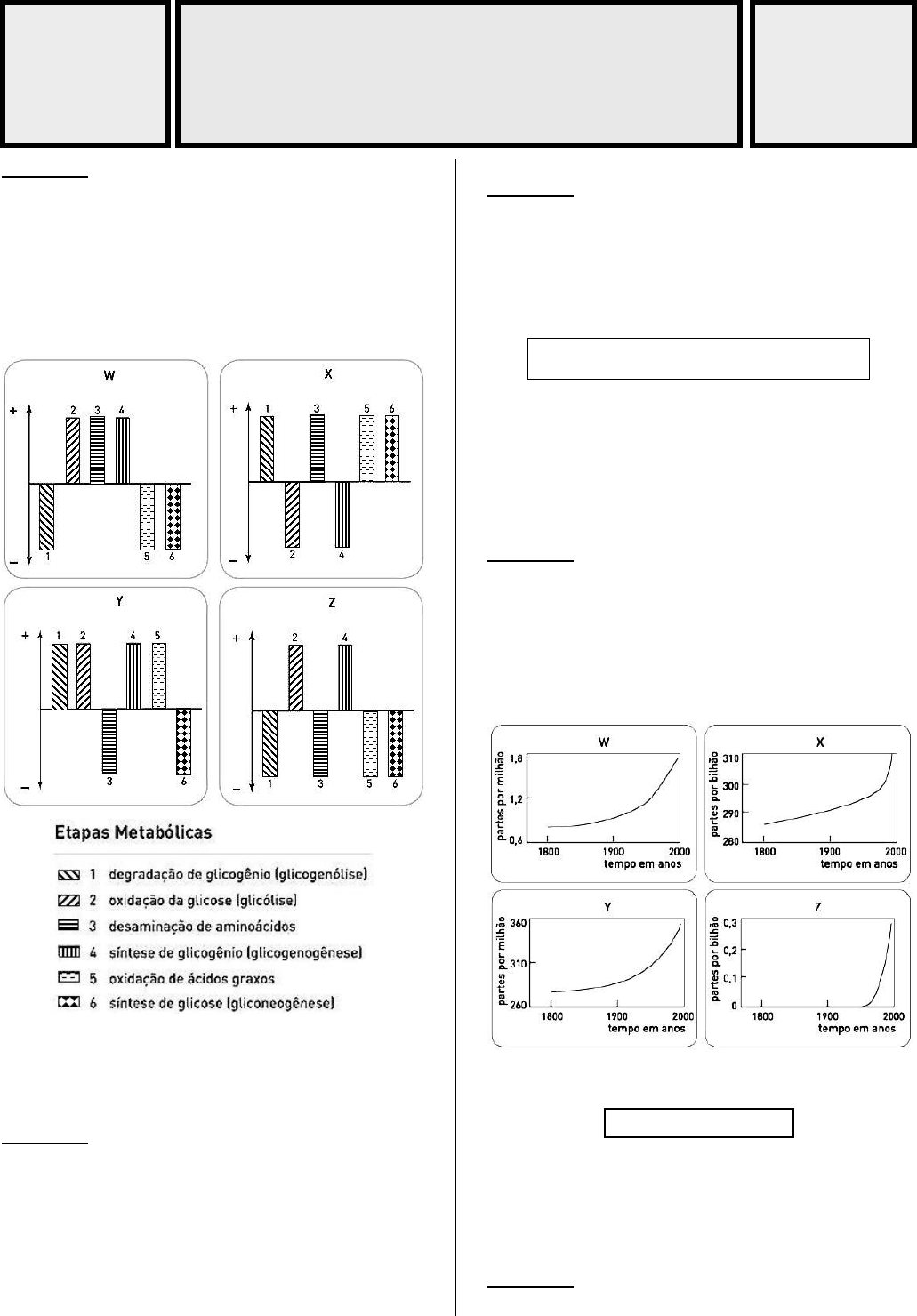UERJ – VESTIBULAR 2008 TELEGRAM: @CANALTROVAO FÍSICA – 1a FASE – 1 EQ – RAFAEL TROVÃO Questão 22 O fígado é um órgão capaz de ajustar-se às necessidades do organismo, por meio da variação, para mais (+) ou para menos (–), da atividade de suas diversas etapas metabólicas. Observe os gráficos abaixo, nos quais o eixo horizontal representa a atividade média de seis etapas metabólicas envolvendo carboidratos, aminoácidos e lipídios, no fígado de uma pessoa em dieta alimentar normal. O gráfico que apresenta as alterações metabólicas encontradas no fígado de uma pessoa submetida a 24 horas de jejum é: a) W b) X c) Y d) Z Questão 23 João abriu uma caderneta de poupança e, em 1º de janeiro de 2006, depositou R$ 500,00 a uma taxa de juros, nesse ano, de 20%. Em 1º de janeiro de 2007, depositou mais R$ 1.000,00 . Para que João tenha, nessa poupança, em 1º de janeiro de 2008, um montante de R$ 1.8240,00 , a taxa de juros do segundo ano deve corresponder a: a) 12% b) 14% c) 16% d) 18% Questão 24 Certos medicamentos são preparados por meio de uma série de diluições. Assim, utilizando-se uma quantidade de água muito grande, os medicamentos obtidos apresentam concentrações muito pequenas. A unidade mais adequada para medir tais concentrações é denominada ppm: 1 ppm corresponde a 1 parte de soluto em 1 milhão de partes de solução Considere um medicamento preparado com a mistura de 1 g de um extrato vegetal e 100 kg de água pura. A concentração aproximada desse extrato vegetal no medicamento, em ppm, está indicada na seguinte alternativa: a) 0,01 b) 0,10 c) 1,00 d) 10,00 Questão 25 As concentrações de alguns gases vêm crescendo na atmosfera em função da atividade humana e poderão acarretar conseqüências ecológicas graves. Cada um dos gráficos abaixo mostra, em diferentes escalas, a variação temporal das concentrações dos seguintes gases: carbônico, óxido nitroso, metano e clorofluorcarbonos (CFC). Em 2000, essas concentrações encontravam-se na seguinte ordem: 2 2CO CH4 N O CFC Os gráficos correspondentes à variação da concentração atmosférica dos dois gases mais importantes, em termos de responsabilidade pelo incremento do aquecimento global, são: a) Y e W b) Z e X c) Y e Z d) X e W Questão 26 Em um experimento, em condições adequadas, foram medidas as velocidades de reação V de uma enzima, em função do aumento da concentração de seu substrato S. O gráfico abaixo indica variações de 1 V em função de S. A curva que deve representar o resultado experimental é a identificada por: a) W b) X c) Y d) Z UTILIZE AS INFORMAÇÕES A SEGUIR PARA RESPONDER ÀS QUESTÕES DE NÚMEROS 27 E 28. Em residências conectadas à rede elétrica de tensão eficaz igual a 120 V , uma lâmpada comumente utilizada é a de filamento incandescente de 60 W . Questão 27 A corrente elétrica eficaz, em ampères, em uma lâmpada desse tipo quando acesa, é igual a: a) 0,5 b) 1,0 c) 2,0 d) 3,0 Questão 28 A resistência do filamento, em ohms, em uma lâmpada desse tipo quando acesa, é da ordem de: a) 30 b) 60 c) 120 d) 240 Questão 29 Um recipiente cilíndrico de base circular, com raio R, contém uma certa quantidade de líquido até um nível oh . Uma estatueta de massa m e densidade , depois de completamente submersa nesse líquido, permanece em equilíbrio no fundo do recipiente. Em tal situação, o líquido alcança um novo nível h. A variação ( oh h− ) dos níveis do líquido, quando todas as grandezas estão expressas no Sistema Internacional de Unidades, corresponde a: a) 2 m R b) 2 2 3 m R c) 2 m R d) 4R m Questão 30 Em uma aula prática foram apresentados quatro conjuntos experimentais compostos, cada um, por um circuito elétrico para acender uma lâmpada. Esses circuitos são fechados por meio de eletrodos imersos em soluções aquosas saturadas de diferentes compostos, conforme os esquemas a seguir: O conjunto cuja lâmpada se acenderá após o fechamento do circuito é o de número: a) I b) II c) III d) IV Questão 31 Admita que, em um determinado lago, a cada 40 cm de profundidade, a intensidade de luz é reduzida em 20%, de acordo com a equação h 40 o 0,8 = na qual é a intensidade da luz em uma profundidade h, em centímetros, e o é a intensidade na superfície. Um nadador verificou, ao mergulhar nesse lago, que a intensidade da luz, em um ponto P, é de 32% daquela observada na superfície. A profundidade do ponto P, em metros, considerando log2 0,3= , equivale a: a) 0,64 b) 1,8 c) 2,0 d) 3,2 Questão 32 Um RNA sintético foi formado apenas pelas bases citosina e guanina, dispostas ao acaso, num total de 21 bases. O esquema abaixo mostra o RNA mensageiro, formado a partir da introdução dos códons de iniciação AUG e de terminação UAA nas extremidades do RNA original. Nesse esquema, B representa as bases C ou G. AUG. BBB. BBB. BBB. BBB. BBB. BBB. BBB. UAA Sabe-se que: — os códons correspondentes ao aminoácido arginina são AGA, AGG, CGA, CGC, CGG e CGU; — o aminoácido metionina correspondente ao códon de iniciação AUG é removido do peptidío sintetizado pela tradução desse RNA mensageiro. A probabilidade de que a arginina apareça pelo menos uma vez na estrutura final deste peptidío é de: a) 7 1 1 3 − b) 7 1 8 c) 7 3 1 4 − d) 7 1 4 Questão 33 Considere o esquema 1, no qual uma pessoa sustenta um peso P preso ao punho, a uma distância de 31 cm do ponto de inserção de um dos músculos que atuam nesse processo de sustentação. Considere, agora, o esquema 2, no qual o mesmo peso foi deslocado pelo antebraço e colocado em uma posição cuja distância, em relação ao mesmo ponto de inserção muscular, é de 14 cm . Admita que: — em ambos os esquemas, braço e antebraço formaram um ângulo reto, estando o braço na posição vertical; — o ponto de inserção do músculo fica a 3 cm do ponto de apoio na articulação do cotovelo; — para manter, nos dois esquemas, a mesma posi
