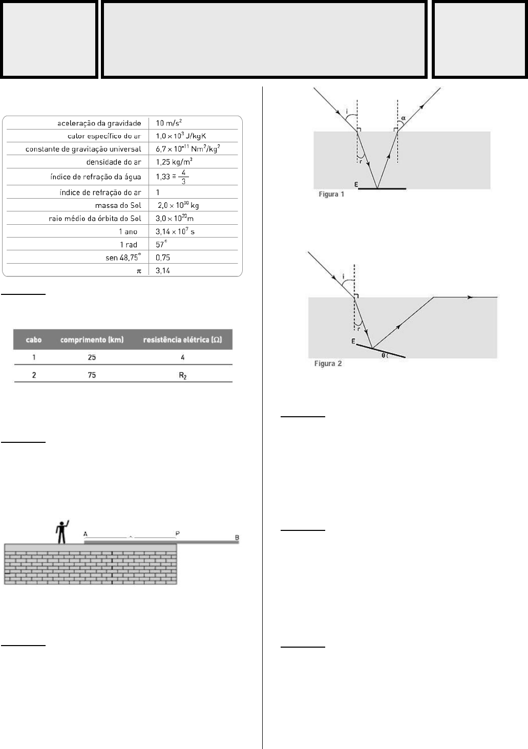 UERJ – VESTIBULAR 2007 TELEGRAM: @CANALTROVAO FÍSICA – 2a FASE – RAFAEL TROVÃO PARA SEUS CÁLCULOS, SEMPRE QUE NECESSÁRIO, UTILIZE OS SEGUINTES DADOS: Questão 1 Considere dois cabos elétricos de mesmo material e com as seguintes características: Sabe-se que o peso do cabo 2 é o quádruplo do peso do cabo 1. Calcule o valor da resistência elétrica R2. Questão 2 A figura abaixo mostra um homem de massa igual a 100 kg , próximo a um trilho de ferro AB, de comprimento e massa respectivamente iguais a 10 m e 350 kg . O trilho encontra-se em equilíbrio estático, com 60% do seu comprimento total apoiados sobre a laje de uma construção. Estime a distância máxima que o homem pode se deslocar sobre o trilho, a partir do ponto P, no sentido da extremidade B, mantendo-o em equilíbrio. Questão 3 No fundo de um recipiente com determinada quantidade de água, encontra-se um espelho plano E. Um raio de luz incide sobre a superfície de separação do ar e da água, com um ângulo de incidência oi 53,13= , cujo co-seno vale 0,6 , penetrando na água com ângulo de refração r. A figura 1 apresenta a superfície refletora do espelho paralela ao fundo do recipiente. Nesta situação, o raio de luz emerge com um ângulo de valor igual ao de incidência. A figura 2 apresenta a superfície do espelho inclinada em um ângulo em relação ao fundo do recipiente. Nesta situação, o raio de luz emerge paralelamente à superfície da água. Determine o ângulo entre o espelho E e o fundo do recipiente. Questão 4 Um gás, inicialmente à temperatura de o16 C , volume oV e pressão oP , sofre uma descompressão e, em seguida, é aquecido até alcançar uma determinada temperatura final T, volume V e pressão P. Considerando que V e P sofreram um aumento de cerca de 10% em relação a seus valores iniciais, determine, em graus Celsius, o valor de T. Questão 5 O período do movimento de translação do Sol em torno do centro de nossa galáxia, a Via Láctea, é da ordem de 200 milhões de anos. Esse movimento deve-se à grande aglomeração das estrelas da galáxia em seu centro. Uma estimativa do número N de estrelas da Via Láctea pode ser obtida considerando que a massa média das estrelas é igual à massa do Sol. Calcule o valor de N. Questão 6 À margem de um lago, uma pedra é lançada com velocidade inicial oV . No esquema abaixo, A representa o alcance da pedra, H a altura máxima que ela atinge, e seu ângulo de lançamento sobre a superfície do lago. Sabendo que A e H são, em metros, respectivamente iguais a 10 e 0,1, determine, em graus, o ângulo de lançamento da pedra. Questão 7 Para aquecer o ar no interior de um cômodo que se encontra, inicialmente, a uma temperatura de o10 C , utiliza- se um resistor elétrico cuja potência média consumida é de 2 kW . O cômodo tem altura igual a 2,5 m e área do piso igual a 220 m . Considere que apenas 50% da energia consumida pelo resistor é transferida como calor para o ar. Determine o tempo necessário para que a temperatura no interior do cômodo seja elevada a o20 C . Questão 8 Um circuito elétrico é composto de uma bateria B de 12 V que alimenta três resistores − X, Y e Z −, conforme ilustra a figura abaixo. Considerando que os resistores têm a mesma resistência R, calcule a ddp entre os terminais do resistor Z. UTILIZE AS INFORMAÇÕES A SEGUIR PARA RESPONDER ÀS QUESTÕES DE NÚMEROS 09 E 10. Figura 1 - Partículas subatômicas Figura 2 - Túnel de um acelerador de partículas (CARUSO, F. e OGURI, V. Física moderna: origens clássicas e fundamentos quânticos. Rio de Janeiro: Elsevier, 2006.) Não é possível observar a estrutura da matéria e as propriedades fundamentais de seus constituintes de maneira simples, como sugere a tirinha da figura 1. Para estudar essas características, são utilizados potentes equipamentos que aceleram partículas subatômicas e provocam sua colisão (veja a figura 2). Considere o experimento representado abaixo. Na etapa de testes do experimento, a partícula x desloca- se, com velocidade constante 7 oV 3,0 10 m/s= , frontalmente ao encontro da partícula y, que está em repouso, de modo que ambas só interajam durante a colisão. Questão 9 Admita que, em um instante ot , a distância entre as partículas x e y seja de 0,3 m . Determine após quanto tempo, a partir desse instante, ocorrerá a colisão entre elas. Questão 10 Após a colisão, as partículas passam a deslocar-se no mesmo sentido, e a velocidade da partícula x é igual a 1 3 de sua velocidade inicial oV e 1 4 da velocidade adquirida pela partícula y. Nessas condições, determine a razão entre suas massas.