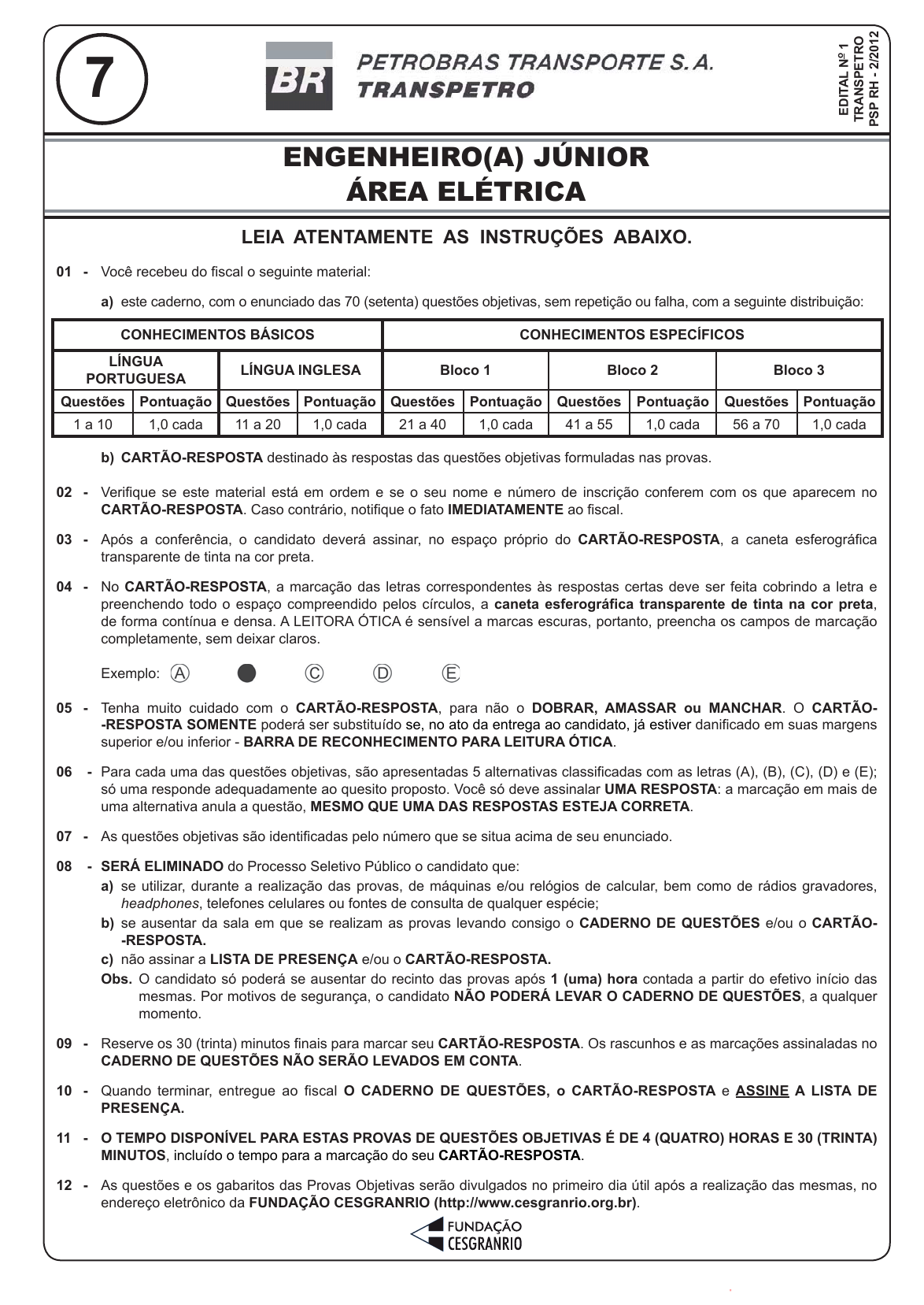 pcimarkpci MDAwMDowMDAwOjAwMDA6MDAwMDowMDAwOmZmZmY6YjFiZjowZWM0:V2VkLCAwMyBNYXkgMjAyMyAwMjoxMjo1MiAtMDMwMA== www.pciconcursos.com.br ENGENHEIRO(A) JÚNIOR - ÁREA ELÉTRICA1 TRANSPETRO 7 LEIA ATENTAMENTE AS INSTRUÇÕES ABAIXO. 01 - Você recebeu do fiscal o seguinte material: a) este caderno, com o enunciado das 70 (setenta) questões objetivas, sem repetição ou falha, com a seguinte distribuição: b) CARTÃO-RESPOSTA destinado às respostas das questões objetivas formuladas nas provas. 02 - Verifique se este material está em ordem e se o seu nome e número de inscrição conferem com os que aparecem no CARTÃO-RESPOSTA. Caso contrário, notifique o fato IMEDIATAMENTE ao fiscal. 03 - Após a conferência, o candidato deverá assinar, no espaço próprio do CARTÃO-RESPOSTA, a caneta esferográfica transparente de tinta na cor preta. 04 - No CARTÃO-RESPOSTA, a marcação das letras correspondentes às respostas certas deve ser feita cobrindo a letra e preenchendo todo o espaço compreendido pelos círculos, a caneta esferográfica transparente de tinta na cor preta, de forma contínua e densa. A LEITORA ÓTICA é sensível a marcas escuras, portanto, preencha os campos de marcação completamente, sem deixar claros. Exemplo: 05 - Tenha muito cuidado com o CARTÃO-RESPOSTA, para não o DOBRAR, AMASSAR ou MANCHAR. O CARTÃO- -RESPOSTA SOMENTE poderá ser substituído se, no ato da entrega ao candidato, já estiver danificado em suas margens superior e/ou inferior - BARRA DE RECONHECIMENTO PARA LEITURA ÓTICA. 06 - Para cada uma das questões objetivas, são apresentadas 5 alternativas classificadas com as letras (A), (B), (C), (D) e (E); só uma responde adequadamente ao quesito proposto. Você só deve assinalar UMA RESPOSTA: a marcação em mais de uma alternativa anula a questão, MESMO QUE UMA DAS RESPOSTAS ESTEJA CORRETA. 07 - As questões objetivas são identificadas pelo número que se situa acima de seu enunciado. 08 - SERÁ ELIMINADO do Processo Seletivo Público o candidato que: a) se utilizar, durante a realização das provas, de máquinas e/ou relógios de calcular, bem como de rádios gravadores, headphones, telefones celulares ou fontes de consulta de qualquer espécie; b) se ausentar da sala em que se realizam as provas levando consigo o CADERNO DE QUESTÕES e/ou o CARTÃO- -RESPOSTA. c) não assinar a LISTA DE PRESENÇA e/ou o CARTÃO-RESPOSTA. Obs. O candidato só poderá se ausentar do recinto das provas após 1 (uma) hora contada a partir do efetivo início das mesmas. Por motivos de segurança, o candidato NÃO PODERÁ LEVAR O CADERNO DE QUESTÕES, a qualquer momento. 09 - Reserve os 30 (trinta) minutos finais para marcar seu CARTÃO-RESPOSTA. Os rascunhos e as marcações assinaladas no CADERNO DE QUESTÕES NÃO SERÃO LEVADOS EM CONTA. 10 - Quando terminar, entregue ao fiscal O CADERNO DE QUESTÕES, o CARTÃO-RESPOSTA e ASSINE A LISTA DE PRESENÇA. 11 - O TEMPO DISPONÍVEL PARA ESTAS PROVAS DE QUESTÕES OBJETIVAS É DE 4 (QUATRO) HORAS E 30 (TRINTA) MINUTOS, incluído o tempo para a marcação do seu CARTÃO-RESPOSTA. 12 - As questões e os gabaritos das Provas Objetivas serão divulgados no primeiro dia útil após a realização das mesmas, no endereço eletrônico da FUNDAÇÃO CESGRANRIO (http://www.cesgranrio.org.br). ED IT A L N o 1 TR A N SP ET R O PS P R H - 2/ 20 12 CONHECIMENTOS BÁSICOS CONHECIMENTOS ESPECÍFICOS LÍNGUA PORTUGUESA LÍNGUA INGLESA Bloco 1 Bloco 2 Bloco 3 Questões Pontuação Questões Pontuação Questões Pontuação Questões Pontuação Questões Pontuação 1 a 10 1,0 cada 11 a 20 1,0 cada 21 a 40 1,0 cada 41 a 55 1,0 cada 56 a 70 1,0 cada 7 ENGENHEIRO(A) JÚNIOR ÁREA ELÉTRICA pcimarkpci MDAwMDowMDAwOjAwMDA6MDAwMDowMDAwOmZmZmY6YjFiZjowZWM0:V2VkLCAwMyBNYXkgMjAyMyAwMjoxMjo1MiAtMDMwMA== www.pciconcursos.com.br ENGENHEIRO(A) JÚNIOR - ÁREA ELÉTRICA 2 TRANSPETRO RASCUNHO pcimarkpci MDAwMDowMDAwOjAwMDA6MDAwMDowMDAwOmZmZmY6YjFiZjowZWM0:V2VkLCAwMyBNYXkgMjAyMyAwMjoxMjo1MiAtMDMwMA== www.pciconcursos.com.br ENGENHEIRO(A) JÚNIOR - ÁREA ELÉTRICA3 TRANSPETRO LÍNGUA PORTUGUESA Science fiction O marciano encontrou-me na rua e teve medo de minha impossibilidade humana. Como pode existir, pensou consigo, um ser que no existir põe tamanha anulação de existência? Afastou-se o marciano, e persegui-o. Precisava dele como de um testemunho. Mas, recusando o colóquio, desintegrou-se no ar constelado de problemas. E fiquei só em mim, de mim ausente. ANDRADE, Carlos Drummond de. Science fiction. Poesia e prosa. Rio de Janeiro: Nova Aguilar, 1988, p. 330-331. 1 De acordo com a primeira estrofe do poema, o medo do marciano origina-se no fato de que (A) a aparência do homem em conflito consigo mesmo o apavora. (B) as contradições existenciais do homem não lhe fazem sentido. (C) o homem tinha atitudes de ameaça ao marciano. (D) o homem e o marciano não teriam chance de travar qualquer tipo de interação. (E) o encontro na rua foi casual, tendo o marciano se as- sustado com a aparência física do homem. 2 Já no título do texto (ficção científica, em português), anuncia-se a possibilidade de utilizar termos correlatos a “espaço sideral”. É o que ocorre logo na 1a linha, com o uso da palavra marciano. Outra palavra, empregada no texto, que apresenta rela- ção com esse mesmo campo de significação, é (A) impossibilidade (�. 2) (B) anulação (�. 4) (C) testemunho (�. 6) (D) colóquio (�. 7) (E) constelado (�. 8) 3 O elemento em destaque está grafado de acordo com a norma-padrão em: (A) O marciano desintegrou-se por que era necessário. (B) O marciano desintegrou-se porquê? (C) Não se sabe por que o marciano se desintegrou. (D) O marciano desintegrou-se, e não se sabe o porque. (E) Por quê o marciano se desintegrou? 5 4 Num anúncio que contenha a frase “Vende-se filhotes de pedigree.”, para adequá-lo à norma-padrão, será neces- sário redigi-lo da seguinte forma: (A) Vende-se filhotes que têm pedigree