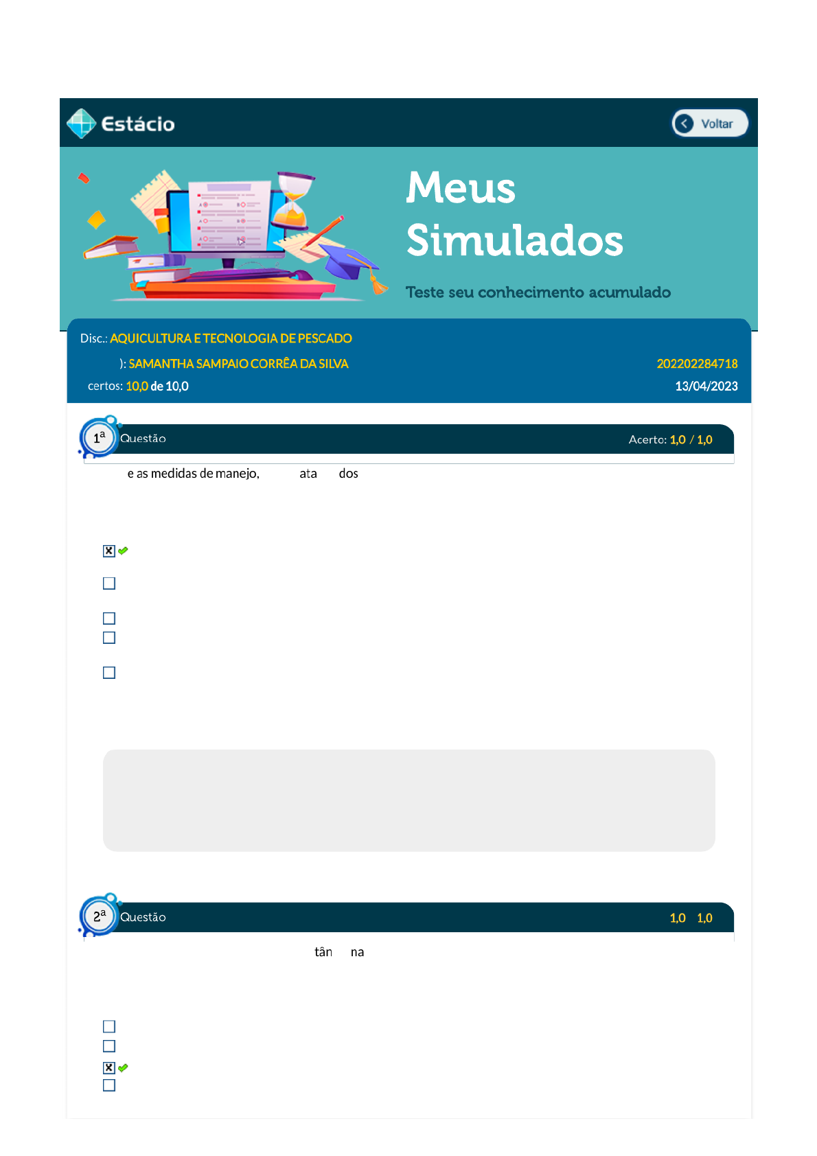 Impresso por arrow photo, E-mail arrowphoto11084217raniere@gmail.com para uso pessoal e privado. Este material pode ser protegido por direitos autorais e não pode ser reproduzido ou repassado para terceiros. 17/09/2023, 22:57:56 13/04/2023, 13:35 Estácio: Alunos https://simulado.estacio.br/alunos/ 1/5 Disc.: Aluno(a): Acertos: Acerto: / Entre as medidas de manejo, a aclimatação dos alevinos durante o povoamento tem grande importância, principalmente em relação às taxas de sobrevivência dos animais. Assinale a alternativa que descreve corretamente como deve ser feita esta aclimatação: Deve ser feita a adaptação gradual colocando os sacos na água do tanque até equilibrar a temperatura e misturando-se a água durante a soltura para evitar choque. Deve ser feita em um tanque menor separado, com posterior transporte para o tanque denitivo, quando os animais estiverem adaptados. Deve ser feita rapidamente para que os animais não sofram estresse e quem predispostos à doenças. Deve ser feita trocando-se totalmente a água dos sacos pela água do viveiro de destino 20 minutos antes do povoamento. Deve ser feita imediatamente após a chegada dos animais na propriedade nos tanques contendo animais adultos. Respondido em 13/04/2023 13:26:17 Explicação: É necessário que se faça uma adaptação gradual dos animais durante o povoamento, os sacos contendo os alevinos devem permanecer fechados nos tanques de destino durante pelo menos 20 minutos para que a temperatura das águas se equilibre, posteriormente a água do tanque deve ser gradualmente misturada à água dos sacos para evitar uma mudança brusca dos parâmetros da água durante a introdução dos animais. Acerto: / O pH é um parâmetro de grande importância na qualidade da água e interfere diretamente na saúde dos animais. Umas das ações do pH está relacionada à toxicidade da amônia na água. Assinale a alternativa que descreve corretamente como o pH interfere na amônia em um ambiente aquático. O pH alcalino age reduzindo os níveis de amônia não ionizada, sendo benéco para os animais. O pH alcalino age reduzindo os níveis de amônia total, sendo benéco para os animais. O pH alcalino age aumentando os níveis de amônia não ionizada, que é mais tóxica para os animais. O pH alcalino age aumentando os níveis da amônia total, causando baixa produtividade e predisposição à doenças. Impresso por arrow photo, E-mail arrowphoto11084217raniere@gmail.com para uso pessoal e privado. Este material pode ser protegido por direitos autorais e não pode ser reproduzido ou repassado para terceiros. 17/09/2023, 22:57:56 13/04/2023, 13:35 Estácio: Alunos https://simulado.estacio.br/alunos/ 2/5 O pH alcalino age aumentando os níveis de amônia ionizada, que é mais tóxica para os animais. Respondido em 13/04/2023 13:26:34 Explicação: Em um ambiente com o pH alcalino, a forma não ionizada da amônia se torna predominante, esta é a forma mais tóxica para os animais, pois possui maior capacidade de penetração na membrana celular. Por isso, deve ser mantido o pH em torno de 7 a 8, sendo os valores mais próximos de 7 (neutralidade) mais adequados para a maioria das espécies. Acerto: / Dentro da aquicultura, existem diversas denominações de acordo com a espécie cultivada. Marque a alternativa que apresenta as denominações para o cultivo de vieiras, mexilhões e camarões respectivamente. Quelonicultura, mitilicultura e jacaricultura. Pectinicultura, carcinicultura e ostricultura. Pectinicultura, mitilicultura e carcinicultura. Mitilicultura, pectinicultura e carcinicultura. Jacaricultura, algicultura e pectinicultura. Respondido em 13/04/2023 13:27:19 Explicação: A sequência correta é: a pectinicultura para o cultivo de vieiras (Nodipecten nodosus), a mitilicultura para o cultivo dos mexilhões (Perna perna) e a carcinicultura para o cultivo de crustáceos, grupo no qual se incluem os camarões (Litopenaeus vannamei). As demais denominações jacaricultura, quelonicultura, ostricultura e algicultura são respectivamente correspondentes às criações de jacaré, quelônios, ostras e algas. Acerto: / As boas práticas de fabricação (BPF) e práticas relacionadas a condições higiênico-sanitárias são procedimentos necessários para garantir a qualidade dos alimentos. Marque a alternativa que apresenta boas práticas de fabricação adotadas pela indústria de pescado. Calibração das balanças e de aparelhos de registro, como medidores de pH e temperatura. Identicação dos pontos de controle e dos pontos críticos de controle Auditorias mensais e registros de controle dos equipamentos Determinação dos limites críticos e não críticos Requisitos de higiene para o estabelecimento e higiene pessoal dos colaboradores Respondido em 13/04/2023 13:29:12 Explicação: Dentre as práticas que deverão ser adotadas pelas indústrias de pescado e as boas práticas de fabricação, destacam- se as condições higiênico-sanitárias dos estabelecimentos industrializadores de alimentos e a higiene pessoal dos colaboradores. As demais opções não fazem parte dos requisitos determinados pelo Ministério da Agricultura (portaria nº 368 de 1997) e estão relacionadas a implantação do sistema APPCC (Análise de Perigos e Pontos Críticos de Controle). Impresso por arrow photo, E-mail arrowphoto11084217raniere@gmail.com para uso pessoal e privado. Este material pode ser protegido por direitos autorais e não pode ser reproduzido ou repassado para terceiros. 17/09/2023, 22:57:56 13/04/2023, 13:35 Estácio: Alunos https://simulado.estacio.br/alunos/ 3/5 Acerto: / Na unidade de beneciamento de pescado a área de recepção (área suja) e as áreas de processamento, armazenamento e expedição (áreas limpas) devem ser separadas de forma a evitar contaminação. Caracteriza- se por contaminação cruzada: A contaminação do pescado por microrganismos, por meio da manipulação por colaborador que apresente u