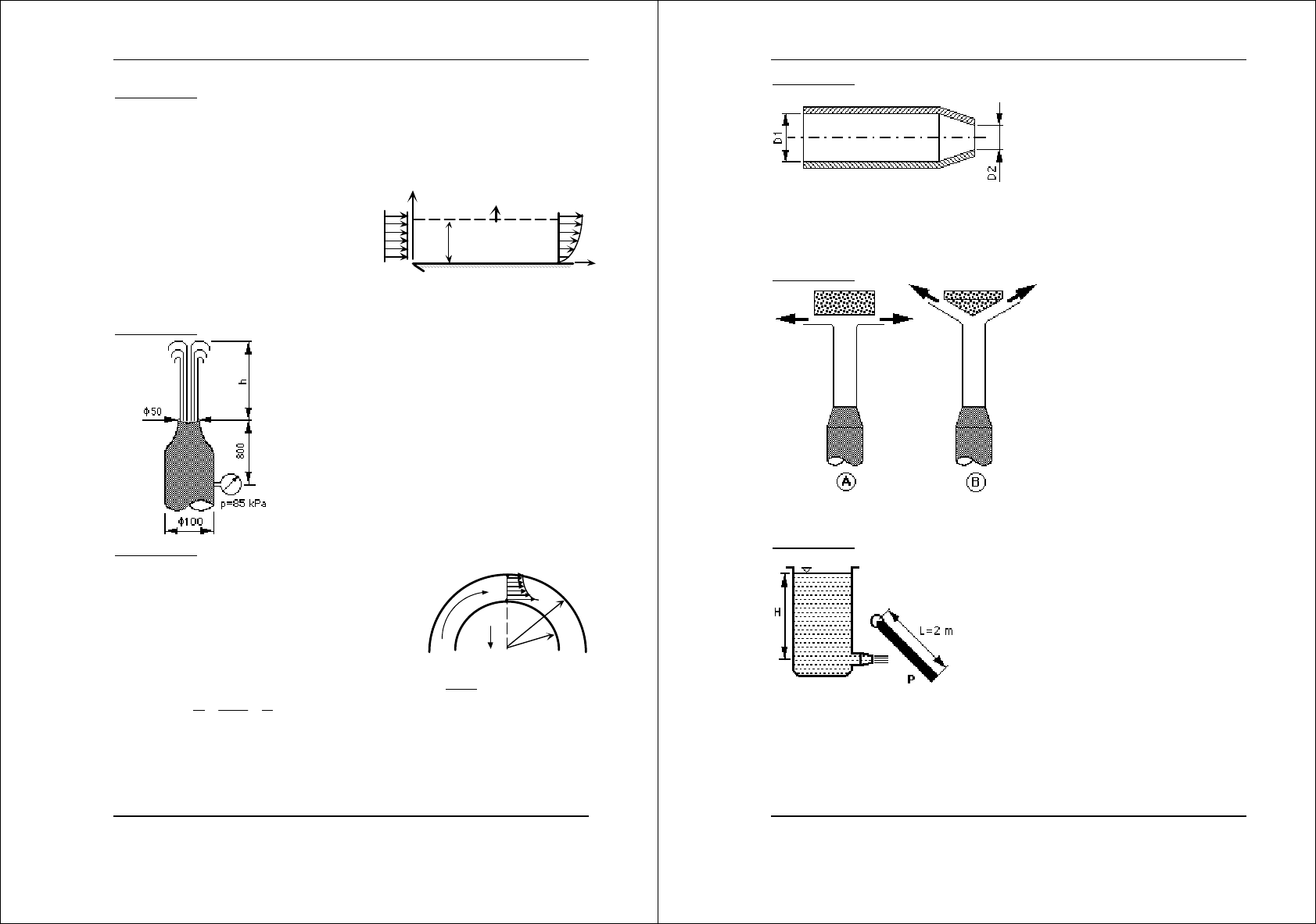 Equações fundamentais - formulação integral 29 Problemas de Mecânica dos Fluidos I – Ano letivo 2012-2013 PROBLEMA 59 Considere um escoamento de ar (ρ=1,2 kg m-3, ν=1,5×10-5 m2/s) sobre uma placa plana de 2 m de largura. A velocidade à entrada tem o valor de 40 m/s e distribui-se uniformemente. Numa secção S a jusante, o perfil de velocidades obedece à lei u(y)=200y - 100y2 [S.I.] a) Determine o caudal mássico, m . , através de uma superfície paralela à placa e situada 200 mm acima dela. b) Determine a tensão na parede para x=xs. c) A tensão na parede será mais elevada em x=0 ou em x=xs? Justifique. S40 m/s m . y 200 mm x u(y) x=0 x=xs PROBLEMA 60 Água (ρ=103 kg m-3) escoa-se através de um tubo vertical com uma saída convergente e é lançada na atmosfera, conforme se mostra na figura. a) Nas condições indicadas qual o caudal volúmico escoado? b) Calcule a altura h a que o jato se eleva, considerando o escoamento ideal. PROBLEMA 61 A figura representa um escoamento bidimensional e estacionário de um fluido ideal, através de uma curva vertical, com linhas de corrente circulares. A distribuição de velocidades na secção vertical 1-2 é dada por vr=k, onde k é uma constante e r é o raio de curvatura. O caudal, por unidade de comprimento na direção normal ao plano da figura, tem o valor de 1000 kg/s/m. a) Mostre que a relação entre a velocidade média, V, na secção 1-2 e a velocidade no ponto 1 pode ser expressa por: 1 2 1 2 1 1 ln r rV V r r r = − b) Determine a velocidade no ponto 2. c) Determine a diferença de pressões entre os pontos 1 e 2. Critique o resultado. g r2 r1 1 2 C Dados: r1=1,0 m; r2=1,2 m ρ=1000 kg/m3 Equações fundamentais - formulação integral 30 Problemas de Mecânica dos Fluidos I – Ano letivo 2012-2013 PROBLEMA 62 Uma agulheta para extinção de incêndios debita um caudal de água (ρ=103 kg m-3) de 60 m3/h. Calcular a força de ligação da agulheta com a mangueira se as suas dimensões forem D1=8 cm e D2=3 cm. Resolva este exercício considerando dois volumes de controlo distintos: (i) tomando como superfície de controlo o a face interior da agulheta e (ii) tomando como superfície de controlo a face exterior. PROBLEMA 63 Dois jatos de água iguais sustentam em equilíbrio, à mesma altura, dois corpos A e B com a configuração mostrada na figura. Nestas condições diga, justificando, qual dos dois corpos é mais pesado. PROBLEMA 64 A placa P da figura pesa 25 kgf. Um jato de água (ρ=103 kg m-3) com 1 cm de espessura e 25 cm de dimensão normal ao plano representado incide a meio da mesma. Qual a altura H necessária para manter a placa em equilíbrio com uma inclinação de 45° ?