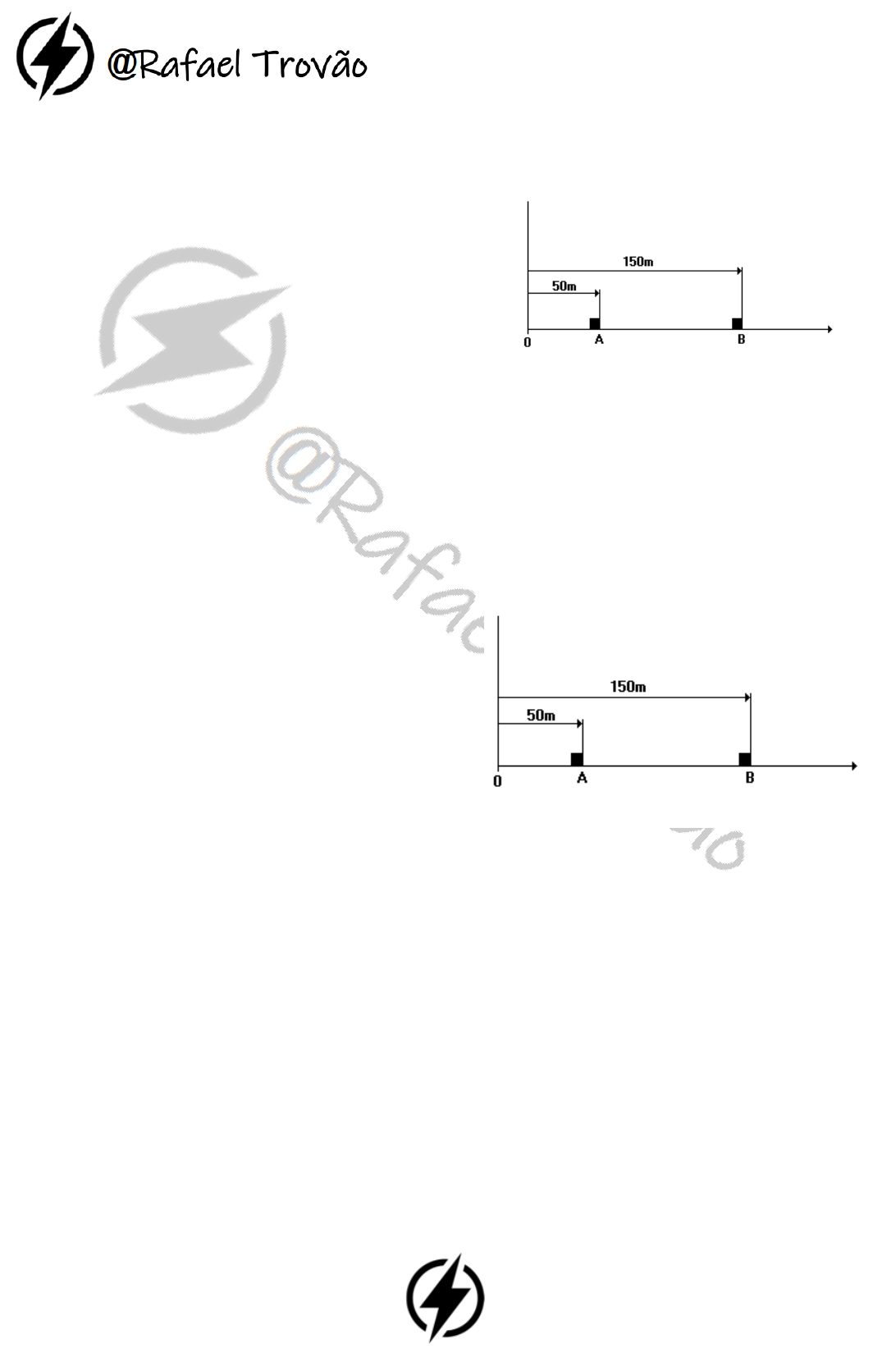 01) (Mackenzie) Uma partícula descreve um movimento retilíneo uniforme, segundo um referencial inercial. A equação horária da posição, com dados no S.I., é x=-2+5t. Neste caso podemos afirmar que a velocidade escalar da partícula é: a) - 2m/s e o movimento é retrógrado b) - 2m/s e o movimento é progressivo c) 5m/s e o movimento é progressivo d) 5m/s e o movimento é retrógrado e) - 2,5m/s e o movimento é retrógrado 02) (Mackenzie) Um dos movimentos mais estudados no curso de Física do ensino médio é o M.R.U. (movimento retilíneo uniforme). No nosso dia-a-dia não é tão comum nos depararmos com movimentos deste tipo, porém não é de todo impossível. Nesse movimento a partícula descreve uma trajetória retilínea e: a) sua velocidade aumenta uniformemente durante o tempo. b) sua velocidade diminui uniformemente durante o tempo. c) sua velocidade aumenta ou diminui uniformemente durante o tempo. d) sua aceleração é constante, mas não nula. e) sua aceleração é nula. 03) (Unitau) Um automóvel percorre uma estrada com função horária s=- 40+80t, onde s é dado em km e t em horas. O automóvel passa pelo km zero após: a) 1,0h b) 1,5h c) 0,5h d) 2,0h e) 2,5h 04) O espaço de um móvel varia com o tempo, obedecendo à função horária s = 30 + 10t, sendo as unidades do SI. Determine o espaço inicial e a velocidade do móvel. O movimento é progressivo ou retrógrado? 05) O espaço inicial de um móvel que descreve um movimento retilíneo e uniforme é -5 m. Nesse movimento, o móvel percorre a cada intervalo de tempo de 10 e uma distância de 50 metros. Escreva a função horária desse movimento, considerando-o progressivo. 06) A função horária do movimento de um móvel, adotando unidades do SI, é s = 2 + 6t. Determine o espaço inicial do móvel, a sua velocidade e a variação de espaço nos vinte primeiros segundos de movimento. O movimento em questão é progressivo ou retrógrado? 07) O espaço de um móvel numa trajetória retilínea varia com o tempo, obedecendo a função horária s = -2 + 4t (unidades do Sistema Internacional). Determine: a) a posição do móvel no instante t = 0 b) a velocidade do móvel c) o espaço do móvel no instante t = 4s d) o instante em que o móvel passa pela origem da trajetória 08) Dois móveis A e B, ambos com movimento uniforme percorrem uma trajetória retilínea conforme mostra a figura. Em t=0, estes se encontram, respectivamente, nos pontos A e B na trajetória. As velocidades dos móveis são vA=50 m/s e vB=30 m/s no mesmo sentido. Em qual ponto da trajetória ocorrerá o encontro dos móveis? a) 200 m b) 225 m c) 250 m d) 300 m e) 350 m 09) Dois móveis A e B, ambos com movimento uniforme percorrem uma trajetória retilínea conforme mostra a figura. Em t=0, estes se encontram, respectivamente, nos pontos A e B na trajetória. As velocidades dos móveis são vA=50 m/s e vB=30 m/s no mesmo sentido. Em que instante a distância entre os dois móveis será 50m? a) 2,0 s b) 2,5 s c) 3,0 s d) 3,5 s e) 4,0 s 10) Dois móveis, A e B, obedecem às funções horárias seguintes, com unidades do Sistema Internacional: SA = 90 – 2t; SB = 4t Podemos afirmar que o encontro dos móveis se dá no instante: a) 0 s b) 15 s c) 30 s d) 45 s e) 90 s 11) Dois móveis, A e B, percorrem uma trajetória retilínea, conforme as equações horárias SA = 30 + 20t e SB = 90 – 10t, sendo a posição s (em m) e o tempo t (em s). No instante t = 0 s, a distância entre os móveis, em metros, será de: a) 30 b) 50 c) 60 d) 80 e)120 12) O instante de encontro dos dois móveis, em segundos, foi: a) 1 b) 2 c) 3 d) 4 e) 5 13) (Fatec) A tabela fornece, em vários instantes, a posição s de um automóvel em relação ao km zero da estrada em que se movimenta. A função horária que nos fornece a posição do automóvel, com as unidades fornecidas, é: a) s = 200 + 30t b) s = 200 - 30t c) s = 200 + 15t d) s = 200 - 15t e) s = 200 - 15t2 14) (PUC) Dois motociclistas, A e B, percorrem uma pista retilínea com velocidades constantes Va=15 m/s e Vb=10 m/s. No início da contagem dos tempos suas posições são Xa=20m e Xb=300m. O tempo decorrido em que o motociclista A ultrapassa e fica a 100m do motociclista B é: a) 56 s b) 86 s c) 76 s d) 36 s e) 66 s 15) Um móvel realiza movimento retilíneo uniforme retrógrado. Sabe-se que no instante t= 0 seu espaço é 10 m. A velocidade escalar do móvel tem valor, em módulo, igual a 5 m/s. Determine sua equação horária do espaço. 16) Dois móveis A e B percorrem a mesma trajetória, e seus espaços são medidos a partir da mesma origem escolhida na trajetória. Suas equações horárias são: SA=10+60t e SB=80-10t, para t em horas e S em quilômetros. Determine o instante e a posição do encontro. 17) Dois móveis A e B percorrem a mesma trajetória. Suas equações horárias são: SA=15+50t e SB=35+30t, para t em horas e S em quilômetros. Determine: a) O instante do encontro b) A posição do encontro 18) Dois móveis A e B estão distantes um do outro 15 km. O móvel A tem velocidade VA=10 m/s e o móvel B tem VB=5 m/s. Sabendo que ambos se movimentam em sentidos contrários com movimento uniforme, responda: a) Em que instante A e B vão se encontrar? b) A que distância da posição inicial de A ocorre o encontro em km? 19) (AFA) Considere dois veículos deslocando-se em sentidos opostos, numa mesma rodovia. Um veículo tem velocidade escalar de 72 km/h e o outro de 108 km/h, em módulo. Um passageiro, viajando no veículo mais lento, resolve cronometrar o tempo decorrido até que os veículos se cruzem e encontra o intervalo de 30 segundos. A distância, em km, de separação dos veículos, no início da cronometragem, era de: a) 0,5 km b) 1,5 km c) 2 km d) 2,5 km 20) (UFSM) No gráfico, representam-se as posições ocupadas por um corpo que se desloca numa trajetória retilínea, em função do tempo. Pode-se, então, afirmar que o módulo da velocidade do corpo: a) aumenta no interv