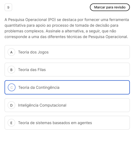A Pesquisa Operacional (PO) se destaca por fornecer uma ferramenta quantitativa para apoio ao processo de tomada de decisão para problemas complexos. Assinale a alternativa, a seguir, que não corresponde a uma das diferentes técnicas de Pesquisa Operacional. A Teoria dos Jogos B Teoria das Filas C Teoria da Contingência D Inteligência Computacional E Teoria de sistemas baseados em agentes