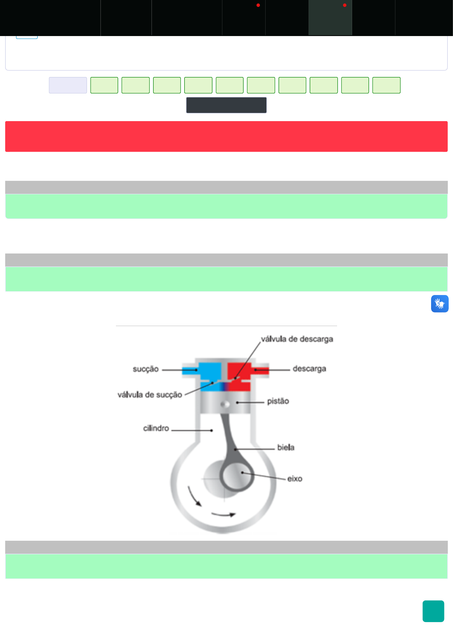 Tempo Restante de Prova 00:46:16 Manutenção de Sistemas de Refrigeração Período: 25/03/2024 até 21/04/2024 [925049] Voltar 01 02 03 04 05 06 07 08 09 10 Revisão de Avaliação Atenção! Essa é a revisão das suas respostas. Confira atentamente e clique em Finalizar Avaliação no final da página. Fique a vontade para retornar e alterar qualquer resposta antes de finalizar. ESSA FOI A SUA RESPOSTA Questão 01 Qual bomba de vácuo e indicada para um sistema abaixo de 65Kw? (X) 4,2CHF 2,1m³/h ESSA FOI A SUA RESPOSTA Questão 02 Qual dos itens abaixo não é obrigatório possuir nos dados do estabelecimento de um PMOC? (X) Faturamento ESSA FOI A SUA RESPOSTA Questão 03 Que tipo de compressor e mostrado na figura abaixo: (X) Compressor alternativo de pistão Questão 04 Ferramenta utilizada para levantar e estimar como e em que quantidades as diversas formas de energia estão sendo gastas numa edificação, em seus sistemas (ar condicionado, iluminação, motorização, bombeamento, refrigeração, etc.): Meu Portal Apostila Online Material Complementar Vídeoaulas Simulado Exercícios Avaliações https://cedtec.pincelatomico.net.br/academico/index.php https://cedtec.pincelatomico.net.br/externos/apostilaView.php?hash=077e29b11be80ab57e1a2ecabb7da330 ESSA FOI A SUA RESPOSTA (X) Diagnóstico Energético. ESSA FOI A SUA RESPOSTA Questão 05 A figura abaixo, representa de forma esquemática, um sistema de refrigeração comercial de um açougue. O item indicado como 11, trata-se de um: (X) Filtro Secador ESSA FOI A SUA RESPOSTA Questão 06 Sobre o uso de ferramentas para tubulações de refrigeração e correto afirmar. (X) Ao utilizar o escariador, o tubo deve estar de cabeça para baixo, evitando a entrada de limalhas ESSA FOI A SUA RESPOSTA Questão 07 Procedimento descrito abaixo se refere a qual processo de recolhimento de fluido de refrigeração. 1. Fechar a válvula de liquido 2. Instalar o manifolde de baixa pressão na válvula de vapor 3. Ligar o equipamento 4. Fazer a ligação direta do compressor 5. Verificar a pressão no manômetro do manifolde. 6. Fechar a válvula de vapor quando a pressão chegar próximo de zero 7. Deligar imediatamente o compressor (X) Recolhimento por transferência de liquido para a condensadora. ESSA FOI A SUA RESPOSTA Questão 08 O passo a passo descrito abaixo e referente a qual teste de detecção de vazamento? 1. Pressurize o sistema de refrigeração até a pressão máxima de teste segura para nitrogênio seco 2. Feche o regulador de pressão. Aguarde a pressão estabilizar e verifique se ela se mantém 3. Monitore a leitura de pressão, se ela cair, é sinal de que existe vazamento. Alguns vazamentos são audíveis e podem ser identificados pelo som 4. Verifique todas as conexões, flanges e curvas com solução de água e sabão (X) Teste de vácuo Questão 09 Meu Portal Apostila Online Material Complementar Vídeoaulas Simulado Exercícios Avaliações https://cedtec.pincelatomico.net.br/academico/index.php https://cedtec.pincelatomico.net.br/externos/apostilaView.php?hash=077e29b11be80ab57e1a2ecabb7da330 Footer ends ESSA FOI A SUA RESPOSTA Quanto as atividades de manutenção no sistema de refrigeração, temos como foco, a garantia das boas condições operacionais do equipamento. Abaixo, foram separadas algumas alternativas como objetivos da realização da manutenção. Julgue-as e indique V para verdadeiras e F para as falsas: ( ) Podemos dizer que um dos objetivos é conservar a funcionalidade do sistema; ( ) Garantir uma estabilidade do gás dentro do sistema, uma vez que ele poderá se tornar ionizável a baixas temperaturas; ( ) Garantir os proprietários o cumprimento da garantia; ( ) Manter o sistema operacional com a capacidade necessária para a finalidade pretendida, com o consumo mínimo de energia; ( ) Garantir que o fluido refrigerante, dentro do evaporador, consiga rejeitar o máximo de calor para o ambiente possível. (X) V, F, V, V e F ESSA FOI A SUA RESPOSTA Questão 10 Analise as afirmativas abaixo e julgue a opção correta: I - Um motor funcionando de forma anormal, poderá causar um aquecimento anormal dele; II - O desgaste dos componentes internos de um equipamento, pode acarretar um mau funcionamento do motor; III - O mau funcionamento de um motor, não terá futuras consequências no consumo de energia; IV. Um mau funcionamento, poderá deixar seu motor mais lento.e, dentro do evaporador, consiga rejeitar o máximo de calor para o ambiente possível. (X) Apenas a alternativa III é falsa Finalizar Avaliação Meu Portal Apostila Online Material Complementar Vídeoaulas Simulado Exercícios Avaliações https://cedtec.pincelatomico.net.br/academico/index.php https://cedtec.pincelatomico.net.br/externos/apostilaView.php?hash=077e29b11be80ab57e1a2ecabb7da330