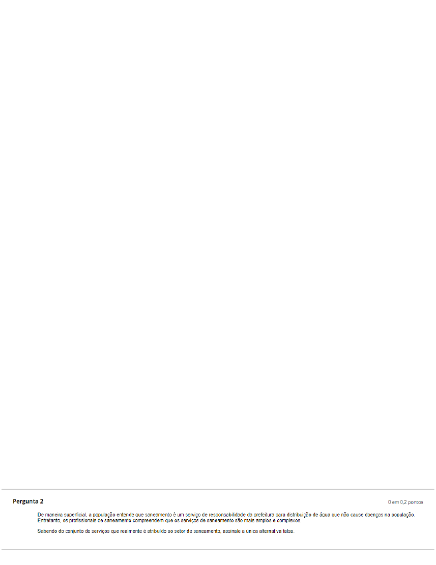 AS – Unidade I PERGUNTA 1 Oswaldo Cruz foi um profissional brasileiro que trouxe grandes avanços para o saneamento no Brasil. Assinale a alternativa falsa sobre ele. a. Oswaldo Cruz foi um engenheiro sanitarista renomado no Brasil. b. Osvaldo Cruz coordenou pesquisas que possibilitaram a compreensão das doenças, a identificação de vetores e a determinação de métodos para eliminá-los, os quais foram determinantes para a saúde do povo brasileiro. c. Oswaldo Cruz foi Diretor Geral de Saúde Pública, cargo que corresponde atualmente ao de Ministro da Saúde. d. Oswaldo Cruz conseguiu mitigar a incidência de várias epidemias recorrentes no Brasil. e. Oswaldo Cruz realizou trabalhos de educação da população sobre medidas de higiene e de saneamento. PERGUNTA 2 De maneira superficial, a população entende que saneamento é um serviço de responsabilidade da prefeitura para distribuição de água que não cause doenças na população. Entretanto, os profissionais de saneamento compreendem que os serviços de saneamento são mais amplos e complexos. Sabendo do conjunto de serviços que realmente é atribuído ao setor de saneamento, assinale a única alternativa falsa. a. O saneamento básico é o conjunto de medidas para melhorar a qualidade de vida dos habitantes de uma região, contribuindo para o bem-estar físico, mental e social da população. b. Segundo a Organização Mundial da Saúde, a cada R$ 1,00 (um real) investido em saneamento, economiza-se R$ 9,00 (nove reais) em saúde. c. Cólera, febre amarela, leptospirose, esquistossomose, dengue e peste bubônica são doenças causadas pela falta de saneamento básico. d. O saneamento básico é o conjunto de serviços, infraestruturas e instalações operacionais de abastecimento de água potável; esgotamento sanitário; limpeza urbana e manejo de resíduos sólidos. e. O rendimento escolar das crianças e o rendimento dos trabalhadores em seus respectivos serviços podem ser diretamente afetados em regiões carentes de serviços de saneamento. PERGUNTA 3 Dentre as alternativas abaixo, assinale a que não está de acordo com a Política Nacional de Saneamento Básico. a. A limpeza urbana e o manejo de resíduos sólidos são constituídos pelas atividades, pela infraestrutura e pelas instalações operacionais de coleta, transporte, transbordo, tratamento e destino final dos resíduos sólidos domiciliares e dos resíduos de limpeza urbanas. b. O esgotamento sanitário é constituído pelas atividades, pela disponibilização e pela manutenção de infraestrutura e das instalações operacionais de coleta, transporte, tratamento e disposição final adequados dos esgotos sanitários, desde as ligações prediais até a sua destinação final para a produção de água de reuso ou o seu lançamento final no meio ambiente. c. A drenagem e o manejo das águas pluviais urbanas são constituídos pelas atividades, pela infraestrutura e pelas instalações operacionais de drenagem de águas pluviais, de transporte, detenção ou retenção para o amortecimento de vazões de cheias, tratamento e disposição final das águas pluviais drenadas, contempladas a limpeza e a fiscalização preventiva das redes. d. O abastecimento de água potável é constituído pelas atividades, pela disponibilização, pela manutenção, pela infraestrutura e pelas instalações necessárias ao abastecimento público de água potável, desde a captação até as ligações prediais e os seus instrumentos de medição. e. A Política Nacional de Saneamento Básico é escrita como forma de Lei Federal Nº 12305, de 02 de agosto de 2010. PERGUNTA 4 A responsabilidade dos serviços de saneamento mudou de mãos algumas vezes no Brasil. Com relação a isto, assinale a alternativa que não é verdadeira. a. As formas predominantes assumidas pelo neoprivatismo no setor do saneamento, no Brasil, são as concessões e os contratos chamados de PPP (Parcerias Público- Privadas). b. O modelo do racionalismo administrativo no setor de saneamento enfrentou problemas pelo seu caráter excludente, pois somente pessoas que pudessem pagar teriam acesso aos serviços. c. O racionalismo administrativo trouxe avanços significativos para o setor de saneamento no Brasil, cenário que ampliou a universalização dos serviços de água e esgoto. d. Os serviços de saneamento mudaram várias vezes no contexto mundial, conforme os processos de cidadanização e de mercantilização de cada localidade. Para resumir esta análise histórica em termos gerais, podemos identificar três etapas que o saneamento passou até chegar ao status atual: privatismo, racionalismo administrativo e neoprivatismo. e. A diferença entre o privatismo e o neoprivatismo está relacionada à responsabilidade de fiscalização e cobrança dos serviços de saneamento. AS – Unidade I_ Tentativa 2 PERGUNTA 1 Oswaldo Cruz foi um profissional brasileiro que trouxe grandes avanços para o saneamento no Brasil. Assinale a alternativa falsa sobre ele. a. Oswaldo Cruz realizou trabalhos de educação da população sobre medidas de higiene e de saneamento. b. Oswaldo Cruz conseguiu mitigar a incidência de várias epidemias recorrentes no Brasil. c. Oswaldo Cruz foi um engenheiro sanitarista renomado no Brasil. d. Oswaldo Cruz foi Diretor Geral de Saúde Pública, cargo que corresponde atualmente ao de Ministro da Saúde. e. Osvaldo Cruz coordenou pesquisas que possibilitaram a compreensão das doenças, a identificação de vetores e a determinação de métodos para eliminá-los, os quais foram determinantes para a saúde do povo brasileiro. PERGUNTA 2 De maneira superficial, a população entende que saneamento é um serviço de responsabilidade da prefeitura para distribuição de água que não cause doenças na população. Entretanto, os profissionais de saneamento compreendem que os serviços de saneamento são mais amplos e complexos. Sabendo do conjunto de serviços que realmente é atri