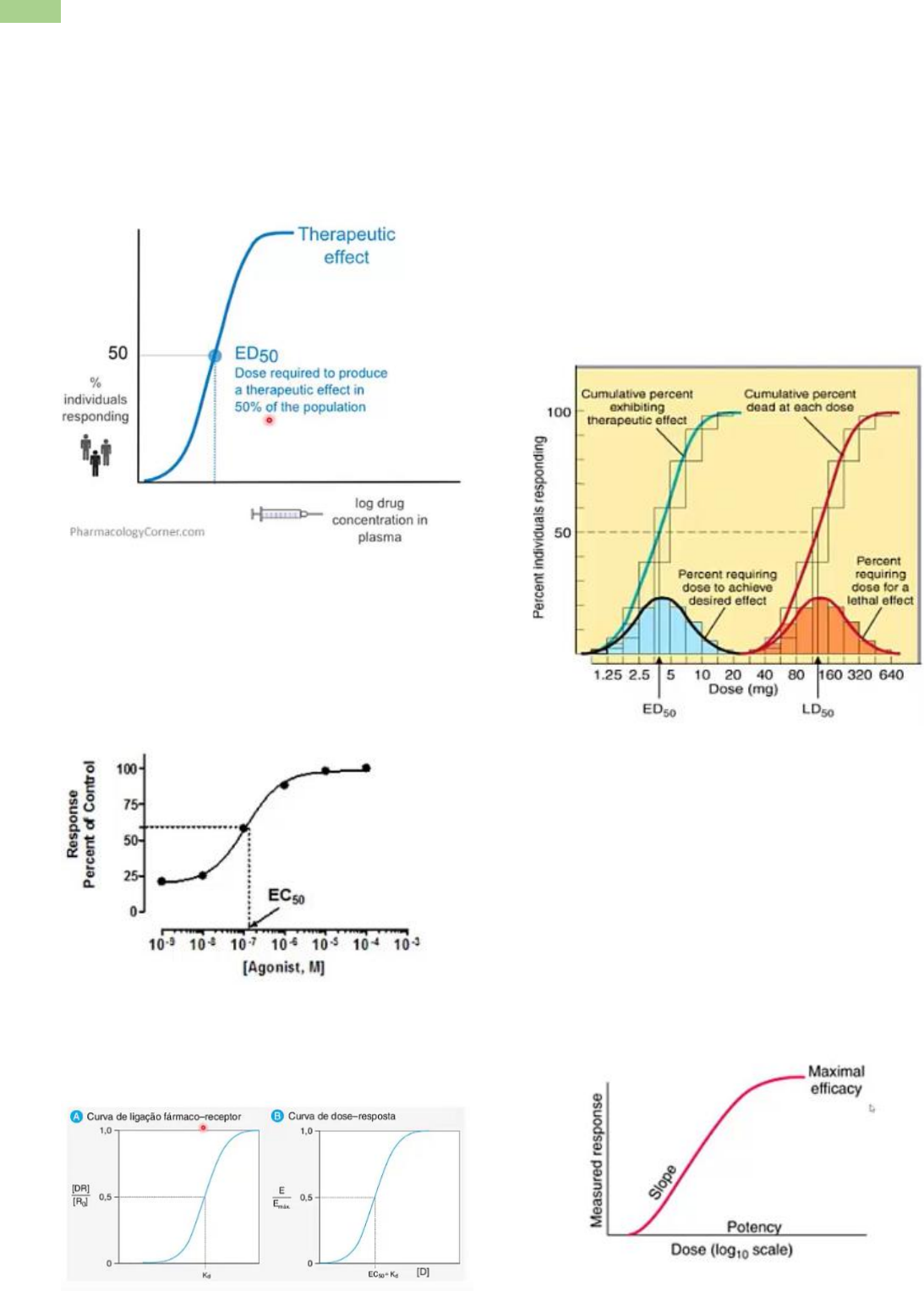 1 Relação Dose-Efeito Gabriella Almeida XXIV Relação Dose-Efeito 1. DISCUTIR A DEFINIÇÃO DE DOSE EFETIVA 50 (DE50) Refere-se à dose necessária para produzir efeito terapêutico em 50% dos testados. Resultado de um estudo de fase 3. 2. DISCUTIR A DEFINIÇÃO DE CONCENTRAÇÃO EFETIVA 50 (CE50) É a concentração plasmática do fármaco quando se observa 50% da resposta máxima. Pode ser calculada usando a curva de concentração plasmática e a resposta. 3. COMPARAR A RELAÇÃO DE DOSE-RESPOSTA COM A RELAÇÃO DE LIGAÇÃO FÁRMACO-RECEPTOR Correlação entre o estudo in vitro e o estudo in vivo: A ligação de uma quantidade adicional do fármaco ao receptor produz aumento da resposta, e a EC50 é aproximadamente igual a Kd. 4. DISCUTIR A DEFINIÇÃO DE DOSE LETAL 50 (DL50) É a dose letal em 50% dos animais testados. Quanto maior o valor da DL50 para um fármaco, mais seguro ele é, porque uma dose maior é necessária para produzir um efeito tóxico e morte. 5. RELACIONAR AS POSSÍVEIS CONSEQUÊNCIAS CLÍNICAS DA PRESCRIÇÃO DE UM FÁRMACO COM DL50 BAIXA Um fármaco com DL50 baixa produz sintomas tóxicos e a morte com doses menores. Este fármaco facilmente pode provocar uma superdosagem fatal apenas pela dosagem inapropriada. 6. INTERPRETAR CURVAS DOSE x RESPOSTA E CORRELACIONAR COM POTÊNCIA E EFICÁCIA 2 Relação Dose-Efeito Gabriella Almeida XXIV 7. SABBER DEFINIR ÍNDICE TEREPÊUTICO (IT) E DISCUTIR SUA IMPORTÂNCIA NA CLÍNICA É uma medida de segurança relativa de um fármaco. Matematicamente, é a relação entre o valor da DL50 e da DE50 de um fármaco. Após administrado, a concentração plasmática do fármaco aumenta em mg/L. É necessário que seja mantido uma concentração mínima do fármaco por unidade plasmática para garantir a eficácia terapêutica. Isso é chamado de nível terapêutico, antes de alcançar a eficácia máxima.