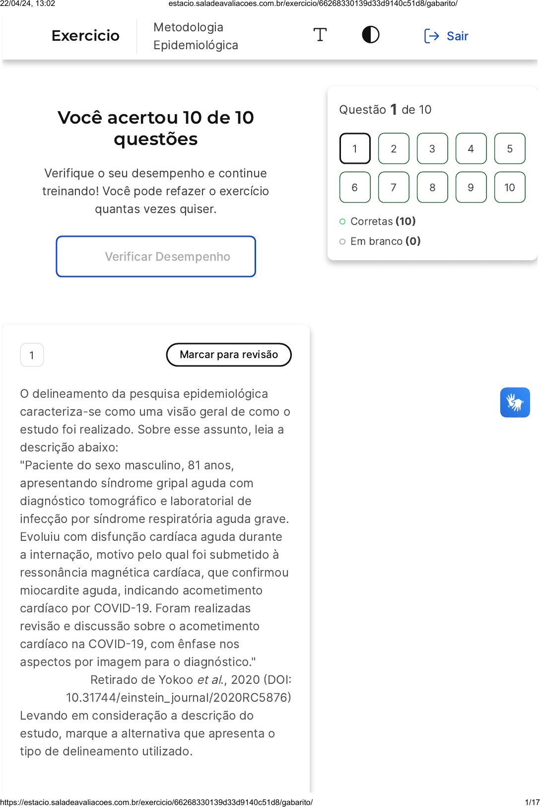 Você acertou 10 de 10 questões Verifique o seu desempenho e continue treinando! Você pode refazer o exercício quantas vezes quiser. Verificar Desempenho 1 Marcar para revisão O delineamento da pesquisa epidemiológica caracteriza-se como uma visão geral de como o estudo foi realizado. Sobre esse assunto, leia a descrição abaixo: "Paciente do sexo masculino, 81 anos, apresentando síndrome gripal aguda com diagnóstico tomográfico e laboratorial de infecção por síndrome respiratória aguda grave. Evoluiu com disfunção cardíaca aguda durante a internação, motivo pelo qual foi submetido à ressonância magnética cardíaca, que confirmou miocardite aguda, indicando acometimento cardíaco por COVID�19. Foram realizadas revisão e discussão sobre o acometimento cardíaco na COVID�19, com ênfase nos aspectos por imagem para o diagnóstico." Retirado de Yokoo et al., 2020 �DOI� 10.31744/einstein_ journal/2020RC5876� Levando em consideração a descrição do estudo, marque a alternativa que apresenta o tipo de delineamento utilizado. Questão 1 de 10 Corretas �10� Em branco �0� 1 2 3 4 5 6 7 8 9 10 Exercicio Metodologia Epidemiológica Sair 22/04/24, 13:02 estacio.saladeavaliacoes.com.br/exercicio/66268330139d33d9140c51d8/gabarito/ https://estacio.saladeavaliacoes.com.br/exercicio/66268330139d33d9140c51d8/gabarito/ 1/17 A B C D E Assinale a alternativa correta: Série de casos. Estudo transversal. Estudo de coorte. Ensaio clínico randomizado. Relato de caso. Resposta correta Parabéns, você selecionou a alternativa correta. Confira o gabarito comentado! Gabarito Comentado O estudo apresentado é caracterizado como um "Relato de caso". Isso se deve ao fato de que o estudo se concentra em um único paciente, fornecendo uma descrição detalhada dos aspectos relacionados à sua doença. Este é o tipo mais básico de estudo descritivo. Para diferenciar, os estudos transversais coletam informações sobre o fator de exposição e desfecho em um grupo de indivíduos em um mesmo tempo. A série de casos é uma expansão do relato de caso, onde características de uma doença ou estado são descritas em mais de um paciente. Os estudos de coorte são apropriados para o cálculo de incidência da doença, investigação de causalidade, fatores de risco e fatores prognósticos. Já o ensaio clínico 22/04/24, 13:02 estacio.saladeavaliacoes.com.br/exercicio/66268330139d33d9140c51d8/gabarito/ https://estacio.saladeavaliacoes.com.br/exercicio/66268330139d33d9140c51d8/gabarito/ 2/17 A B C controlado randomizado seleciona indivíduos de uma população com a mesma condição de interesse, aplicando critérios de inclusão e exclusão para aumentar a homogeneidade entre os pacientes. 2 Marcar para revisão Na epidemiologia observacional, o investigador analisa, mas não faz qualquer tipo de intervenção. Sobre a epidemiologia observacional analise as afirmativas a seguir: I. Abrangem os relatos de caso, estudos transversais e de coorte. II. Envolvem a tentativa de mudar os determinantes de uma doença. III. Influenciam o desenvolvimento de estratégias de promoção de saúde. IV. Delineiam o perfil epidemiológico das populações. Marque a alternativa que apresenta as afirmativas corretas. I, II e III, apenas. I, III e IV, apenas. II, III e IV, apenas. 22/04/24, 13:02 estacio.saladeavaliacoes.com.br/exercicio/66268330139d33d9140c51d8/gabarito/ https://estacio.saladeavaliacoes.com.br/exercicio/66268330139d33d9140c51d8/gabarito/ 3/17 D E I e II, apenas. II e III, apenas. Resposta correta Parabéns, você selecionou a alternativa correta. Confira o gabarito comentado! Gabarito Comentado A epidemiologia observacional engloba estudos descritivos, como relatos de caso e séries de casos, e estudos analíticos, como estudos transversais e de coorte. Essa abordagem tem como objetivo principal traçar o perfil epidemiológico das populações, orientar ações de assistência, prevenção e controle de doenças, além de influenciar o desenvolvimento de estratégias de promoção de saúde. Portanto, as afirmativas I, III e IV estão corretas. Por outro lado, a afirmativa II está incorreta, pois a tentativa de mudar os determinantes de uma doença ou interromper seu progresso por meio de um novo tratamento, por exemplo, é característica da epidemiologia experimental, e não da epidemiologia observacional. Portanto, a alternativa correta é a B� I, III e IV, apenas. 3 Marcar para revisão A epidemiologia _______________ busca avaliar com mais profundidade as relações entre o 22/04/24, 13:02 estacio.saladeavaliacoes.com.br/exercicio/66268330139d33d9140c51d8/gabarito/ https://estacio.saladeavaliacoes.com.br/exercicio/66268330139d33d9140c51d8/gabarito/ 4/17 A B C D E estado de saúde e outras variáveis, enquanto a epidemiologia _______________, frequentemente o primeiro passo de uma investigação epidemiológica, descreve a ocorrência de uma doença em uma população. Em relação aos tipos de investigação epidemiológica, marque a alternativa que completa corretamente a lacuna. descritiva - analítica. analítica - descritiva. experimental - descritiva. observacional - experimental. experimental - analítica. Resposta correta Parabéns, você selecionou a alternativa correta. Confira o gabarito comentado! Gabarito Comentado Gabarito: analítica - descritiva. Justificativa: De maneira geral, o primeiro passo de uma investigação epidemiológica é a realização de estudos descritivos, que se limitam a descrever a ocorrência de uma doença em uma população. Nesse contexto, a epidemiologia analítica surge com uma abordagem de avaliar com mais profundidade as relações entre o estado de saúde e outras variáveis. Já os estudos da 22/04/24, 13:02 estacio.saladeavaliacoes.com.br/exercicio/66268330139d33d9140c51d8/gabarito/ https://estacio.saladeavaliacoes.com.br/exercicio/66268330139d33d9140c51d8/gabarito/ 5/17 A B C Epidemiologia experimental envolvem a tentativa 