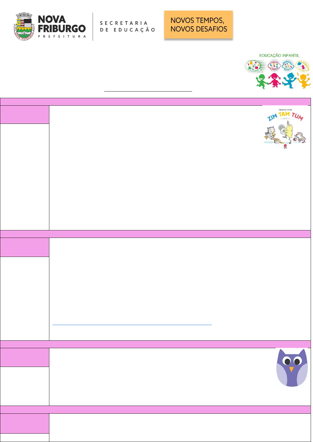Unidade: CMEI Profª Mª da Penha Monteiro Silva Turma: Maternal 1 Projeto de Sala: “Cantando a gente brinca, brincando a gente aprende.” Professor(a): Adriana dos Santos Período:08/04/2024 a 12/04/2024 Planejamento Semanal Situações de Aprendizagem (rotina e suas vivências) 08/04 segunda-feira Iniciar a aula com música Olá como vai.... Realizar a rotina tradicional de painéis: Chamadinha, quantos somos, como está o tempo, que dia é hoje. Apresentar o novo projeto para turma: “Cantando a gente brinca, brincando a gente aprende. ” Conversar com eles a importância da música e da brincadeira nessa fase. Com esse projeto vamos aprender bastante músicas. Contação de história: “Zim, Tam, Tum” – Frédéric Stehr. Diálogo dirigido sobre a história e sobre o som que diversos materiais podem fazer. Em especialas panelas. Atividade: disponibilizar para as crianças, utensílios de cozinha, como panelas, tampas de panelas, colheres, colheres de pau, e incentiva-la a explorar os diferentes tipos de sons produzidos por estes materiais. EI01TS01 EI01EF03 EI01TS01 Situações de Aprendizagem (rotina e suas vivências) 09/04 terça-feira Pátio: bandinha com baldinho de praia. Pegar baldinho de praia e colher de praia e começar a bater no fundo formando vários barulhos. Iniciar a aula com música Bom dia.. e Janelinha do tempo... Conversa dirigida com as crianças sobre a história lida “Zim, Tam, Tum”, vamos relembrar os animais que estavam tocando na história. (coruja e seus amigos passarinhos). Colocar vídeo com o som da coruja para ouvirem e após pedir para imitarem. Atividade: dançar e cantar com a música: Corujinha encantada. https://youtu.be/OgKdM4nZyhA?si=mo_FQct0ASJPD7I6 Brinquedos livres na sala incentivando o compartilhamento. EI01CG05 EI01TS01 EF01EO02 EI01EO03 Situações de Aprendizagem (rotina e suas vivências) 10/04 quarta-feira Realizar a rotina tradicional de painéis: Chamadinha, quantos somos, como está o tempo, que dia é hoje. Rever o vídeo sobre os sons da coruja. Atividade : Carimbar as mãos para fazer a asa da coruja. Vamos utilizar tinta guache e pincel. EI01TS01 EI01EF07 EI01TS02 Situações de Aprendizagem (rotina e suas vivências) 11/04 quinta-feira Pátio: bola ao cesto. As crianças vão tentar acertar a cesta do basquete. Iniciar a aula com música Bom dia.. e Janelinha do tempo... Atividade Musical Rápido e Devagar usando os instrumentos da bandinha. Vamos fazer som lento e rápido com auxilio da professora. Após vamos cantar músicas tocando os instrumentos. Jogos de encaixe livre. EI01CG05 EI01TS01 EI01CG05 Situações de Aprendizagem (rotina e suas vivências) 12/04 sexta-feira Realizar a rotina tradicional de painéis: Chamadinha, quantos somos? Como está o tempo? Que dia é hoje? Rodinha para cantarmos várias músicas batendo palmas. Atividade de coordenação: pedir que rolem, sentem, rastejem, engatinhem, subam, desçam, pulem, etc. Brincadeira do boliche. Incentivar que derrubem todos os pinos. Brinquedos livres estimular o compartilhamento. EI01TS03 EI01ET03 EI01CG02 EI01CG05 image1.jpeg image2.jpeg image3.jpeg image4.jpeg