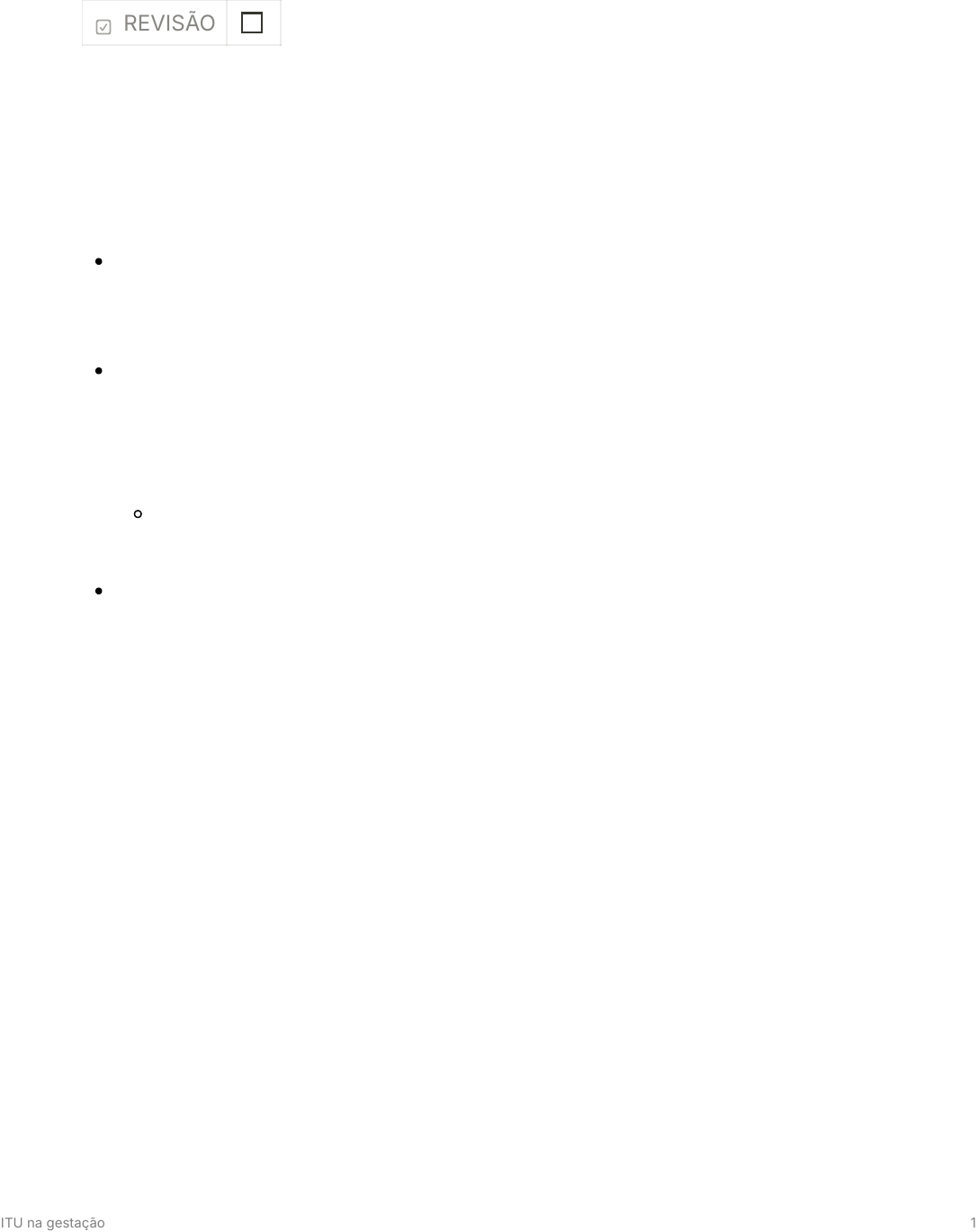 ITU na gestação 1 ITU na gestação REVISÃO A ITU é comum durante a gestação devido a alterações do trato urinário, como estase urinária pela redução do peristaltismo ureteral, aumento da produção de urina, glicosúria e aminoacidúria favorecendo o crescimento bacteriano e infecções. Manifesta-se em 3 formas: Bacteriúria assintomática: pode progredir para cistite sintomática ou pielonefrite e deve ser tratada. Há uma predisposição da grávida desenvolver pielonefrite aguda. ITU baixa (cistite): os sintomas mais conhecidos são disúria, polaciúria e dor supra-púbica. Deve ser questionado febre, dor lombar ou outros sintomas sistêmicos que possam sugerir sepse — se descartado, o provável diagnóstico é cistite. O tratamento é ambulatorial. Cistite complicada: presença de hematúria franca e/ou febre. Nesse caso, é utilizado o tratamento parenteral. ITU alta (pielonefrite): a gestante apresenta disúria, polaciúria, dor supra- púbica, dor lombar e febre. É necessário avaliar a presença de sepse. O tratamento é hospitalar, com alta após melhora clínica e ausência de febre por 24 a 48h. A bacteriúria assintomática, ITU e pielonefrite aumentam o risco de TP pré- termo e de RPMO. É uma das principais causas de septicemia na gravidez. São sinais de ITU complicada: presença de febre, taquicardia, calafrios, náuseas, vômitos, dor lombar com Giordano + e dor abdominal. O diagnóstico é feito por meio de exame de urina e cultura. Deve ser sempre solicitado EAS urocultura TSA a cada rotina. Após o tratamento, é necessário urocultura de controle. O tratamento deve ser escolhido de acordo com o TSA, mas boas escolhas empíricas iniciais incluem cefalexina 500mg 1cp 6/6h por 57 dias), amoxicilina-clavulanato 500mg 1cp 8/8h por 57 dias), nitrofurantoína 100mg 1cp 12/12h por 57 dias)e sulfametoxazol/trimetoprima. ITU na gestação 2 A nitrofurantoína é contraindicada para gestantes a termo, durante o TP e parto ou quando o início de TP é iminente (deve ser evitada após a 36ª semana de IG, pois pode levar à anemia hemolítica no RN. Só deve ser utilizada no 1º trimestre quando não houver alternativas disponíveis. O SMX/TMP pode causar malformações congênitas e kernicterus no neonato. Só deve ser usado durante o 1º trimestre quando não houver alternativas disponíveis. A primeira escolha para pielonefrite é ceftriaxona 1 a 2mg IV a cada 24h. Se a pacietne ficar afebril por 48 a 72h, pode receber alta, completando o esquema VO por 10 a 14 dias. Se houver recaída constatada por urinocultura de controle 7 dias após, está indicado novo antimicrobiano por 7 a 10 dias, seguindo profilaxia antibiótica até o final da gestação. Se a gestante for sintomática, não postergar o início do tratamento até o resultado da urocultura. Se for cistite, o tratamento inicial é empírico. 💡 Antes das 32s, a melhor indicação é nitrofurantoína 100mg 6/6h. Após as 32s, a melhor indicação é clavulin 500 125mg 8/8h. Mulheres que tiveram pielonefrite ou mais de um episódio de ITU podem exigir terapia supressora, geralmente com SMX/TMP (antes da 34ª semana) ou nitrofurantoína 100mg 1x/dia pelo resto da gestação. A prevenção da recorrência é indicada se: 2 ITUs na gestação. 3 ITUs no ano. Pielonefrite na gestação. 1 ITU baixa complicada. História prévia de ITU.