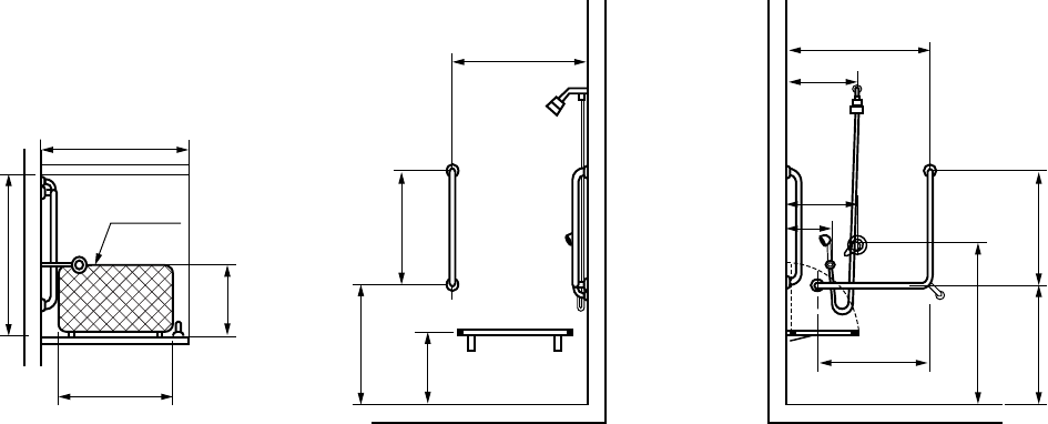 Quando houver porta no boxe, esta deve ter vão com largura livre mínima de 0,90 m e ser confeccio- nada em material resistente a impacto. Recomenda-se o uso de cortina ou porta de correr, desde que sem trilho no piso. A área de varredura da porta não pode interferir na área de transferência da cadeira de rodas para o banco. Os boxes devem ser providos de banco articulado ou removível, com cantos arredondados e superfície antiderrapante impermeável, ter profundidade mínima de 0,45 m, altura de 0,46 m do piso acabado e comprimento mínimo de 0,70 m, instalados no eixo entre as barras, conforme Figura 126. O banco e os dispositivos de fixação devem suportar um esforço de 150 kg. 7.12.1.2 Dimensões mínimas dos boxes de chuveiros As dimensões mínimas dos boxes de chuveiros devem ser de 0,90 m × 0,95 m. 7.12.2 Comandos Nos chuveiros recomenda-se o uso de equipamentos com válvula termostática, que evita o risco de queimaduras ou o uso de monocomandos. Quando do emprego de registros de pressão para a mistura das águas quente e fria, estes devem ser acionados por alavanca com curso de no máximo 1/2 volta e ser instalados conforme Figura 126. O chuveiro deve ser equipado com desviador para ducha manual, e o controle de fluxo (ducha/chuveiro) deve ser na ducha manual. A função chuveiro pode ser exercida por ducha manual, fixada em barra deslizante, permitindo regulagens de alturas apropriadas às diversas necessidades dos usuários. 7.12.3 Barras de apoio em boxes para chuveiros Os boxes para chuveiros devem ser providos de barras de apoio de 90° na parede lateral ao banco, e na parede de fixação do banco deve ser instalada uma barra vertical, conforme Figura 126. Dimensões em metros 0,85 0,45 0,30 0, 75 0, 70 m ín . 1, 00 0,45 0,70 mín. 0,85 0, 75 0, 70 m ín . 0, 46 0, 95 m ín . 0,70 mín. 0,90 mín. 0, 45 m ín . Banco 0,85 0,45 0,30 0, 75 0, 60 m ín . 1, 00 0,45 0,70 mín. 0,85 0, 75 0, 70 m ín . 0, 46 0, 95 m ín . 0,70 mín. 0,90 mín. 0, 45 m ín . Banco 0, 10 a) Exemplo A – Vistas superior, lateral e frontal b) Exemplo B – Vistas superior, lateral e frontal 108 ABNT NBR 9050:2015 © ABNT 2015 - Todos os direitos reservados