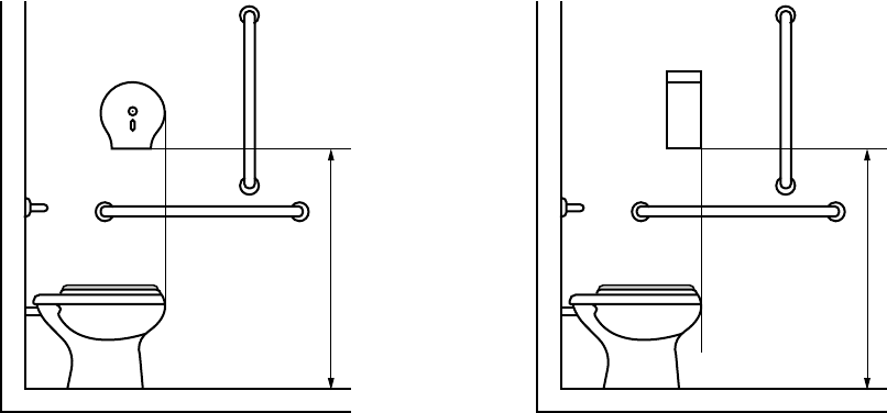 Dimensões em metros Dimensões em metros 1, 00 Figura 124 – Localização da papeleira de sobrepor (rolo) – Vista lateral 1, 00 Figura 125 – Localização da papeleira de sobrepor (interfolhado) – Vista lateral 7.11.3 Cabide Deve ser instalado cabide junto a lavatórios, boxes de chuveiro, bancos de vestiários, trocadores e boxes de bacia sanitária, a uma altura entre 0,80 m a 1,20 m do piso acabado. 7.11.4 Porta-objetos Deve ser instalado um porta-objetos junto ao lavatório, ao mictório e à bacia sanitária, a uma altura entre 0,80 m e 1,20 m, com profundidade máxima de 0,25 m, em local que não interfira nas áreas de transferência e manobra e na utilização das barras de apoio. 7.11.4.1 Recomenda-se que o porta-objetos não seja instalado atrás de portas. 7.11.4.2 O porta-objeto não pode ter cantos agudos e superfícies cortantes ou abrasivas. 7.11.5 Puxador horizontal As portas de sanitários e vestiários, conforme especificado em 6.11.2.7 e Figura 84, devem ter, no lado oposto ao da abertura da porta, puxador horizontal associado à maçaneta. 7.12 Banheiros acessíveis e vestiários com banheiro conjugados 7.12.1 Boxe para chuveiro e ducha Banheiros acessíveis e vestiários com banheiros conjugados devem prever área de manobra para rotação de 360° para circulação de pessoa em cadeira de rodas. 7.12.1.1 Área de transferência Para boxes de chuveiros, deve ser prevista área de transferência externa ao boxe, de forma a permitir a aproximação e entrada de cadeira de rodas, cadeiras de banho ou similar. 107 ABNT NBR 9050:2015 © ABNT 2015 - Todos os direitos reservados
