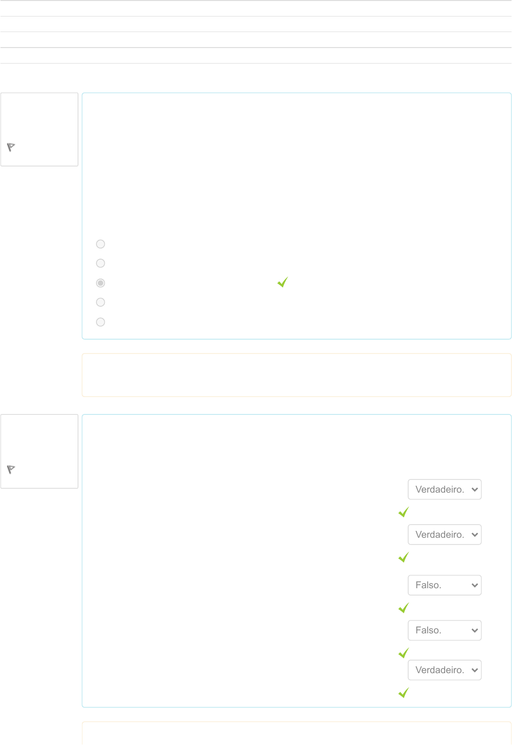 23/04/2024, 09:03 Campus Virtual https://campus2.funiber.org/mod/quiz/review.php?attempt=3269437&cmid=154289 1/6 Pergunta 1 Correta Nota: 1,00 em 1,00 Marcar pergunta Pergunta 2 Correta Nota: 1,00 em 1,00 Marcar pergunta Iniciada Saturday, 23 March 2024, 02:11 Estado Terminada Terminada Saturday, 23 March 2024, 03:20 Tempo gasto 1 hora 8 minutos Nota 9,00 num máximo de 10,00 (90%) Analise a situação apresentada a abaixo e, em seguida, selecione o paradigma educativoAnalise a situação apresentada a abaixo e, em seguida, selecione o paradigma educativo em que o professor se situa:em que o professor se situa: Júlio é professor de filosofia no ensino secundário e considera que seu conteúdo é muitoJúlio é professor de filosofia no ensino secundário e considera que seu conteúdo é muito profundo e difícil de ser compreendido pelos adolescentes. Por tal razão, costuma estruturarprofundo e difícil de ser compreendido pelos adolescentes. Por tal razão, costuma estruturar e apresentar o conteúdo de sua disciplina em ordem cronológica e conduz sua aula dee apresentar o conteúdo de sua disciplina em ordem cronológica e conduz sua aula de maneira predominantemente expositiva, para que os alunos possam tomar notas sobre osmaneira predominantemente expositiva, para que os alunos possam tomar notas sobre os aspectos tratados. Júlio acredita que o melhor modo de avaliar seus estudantes é por meioaspectos tratados. Júlio acredita que o melhor modo de avaliar seus estudantes é por meio de um exame com perguntas fechadas, permitindo-lhe medir se os estudantes alcançaramde um exame com perguntas fechadas, permitindo-lhe medir se os estudantes alcançaram os objetivos de aprendizagem pretendidos.os objetivos de aprendizagem pretendidos. Selecione uma opção de resposta:Selecione uma opção de resposta: a.a. ____Paradigma Construtivista.____Paradigma Construtivista. b.b. ____Paradigma Cognitivista.____Paradigma Cognitivista. c.c. ____Paradigma Comportamental.____Paradigma Comportamental. d.d. ____Paradigma Conectivista.____Paradigma Conectivista. e.e. ____Nenhum dos anteriores.____Nenhum dos anteriores. Respuesta correctaRespuesta correcta A resposta correta é: ____Paradigma Comportamental.A resposta correta é: ____Paradigma Comportamental. (TEORIAS DA APRENDIZAGEM). As teorias da aprendizagem estão vinculadas aos(TEORIAS DA APRENDIZAGEM). As teorias da aprendizagem estão vinculadas aos diferentes paradigmas da educação e evoluíram de acordo com as mudanças na sociedadediferentes paradigmas da educação e evoluíram de acordo com as mudanças na sociedade do conhecimento. Cada teoria tem suas especificidades. Da lista abaixo, assinale quais vocêdo conhecimento. Cada teoria tem suas especificidades. Da lista abaixo, assinale quais você considera verdadeiras ou falsas.considera verdadeiras ou falsas. A teorias comportamental está obsoleta, no entanto, deixouA teorias comportamental está obsoleta, no entanto, deixou contribuições importantes para o campo da educação.contribuições importantes para o campo da educação. Os cognitivistas ocupam-se de compreender o que aconteceOs cognitivistas ocupam-se de compreender o que acontece entre o estímulo dado aos alunos a resposta que estesentre o estímulo dado aos alunos a resposta que estes oferecem. Seu objeto de estudo é o processo deoferecem. Seu objeto de estudo é o processo de aprendizagem e não o produto.aprendizagem e não o produto. A teoria das inteligências múltiplas considera todos os tipos deA teoria das inteligências múltiplas considera todos os tipos de conhecimentos, não obstante, considera mais a inteligênciaconhecimentos, não obstante, considera mais a inteligência intrapessoal, que é a primeira inteligência desenvolvida pelointrapessoal, que é a primeira inteligência desenvolvida pelo indivíduo.indivíduo. A teoria conectivista é aquela que vincula diferentes tipos deA teoria conectivista é aquela que vincula diferentes tipos de estímulos a fim de obter um comportamento pretendido.estímulos a fim de obter um comportamento pretendido. O conectivismo e o cognitivismo buscam utilizar a zona deO conectivismo e o cognitivismo buscam utilizar a zona de desenvolvimento proximal dos estudantes. No entanto, odesenvolvimento proximal dos estudantes. No entanto, o conectivismo utiliza o suporte da tecnologia.conectivismo utiliza o suporte da tecnologia. Respuesta correctaRespuesta correcta Verdadeiro. Verdadeiro. Falso. Falso. Verdadeiro. 23/04/2024, 09:03 Campus Virtual https://campus2.funiber.org/mod/quiz/review.php?attempt=3269437&cmid=154289 2/6 Pergunta 3 Correta Nota: 1,00 em 1,00 Marcar pergunta Pergunta 4 Correta Nota: 1,00 em 1,00 Marcar pergunta A resposta correcta é: A teorias comportamental está obsoleta, no entanto, deixouA resposta correcta é: A teorias comportamental está obsoleta, no entanto, deixou contribuições importantes para o campo da educação. → Verdadeiro., Os cognitivistascontribuições importantes para o campo da educação. → Verdadeiro., Os cognitivistas ocupam-se de compreender o que acontece entre o estímulo dado aos alunos a respostaocupam-se de compreender o que acontece entre o estímulo dado aos alunos a resposta que estes oferecem. Seu objeto de estudo é o processo de aprendizagem e não o produto.que estes oferecem. Seu objeto de estudo é o processo de aprendizagem e não o produto. → Verdadeiro., A teoria das inteligências múltiplas considera todos os tipos de→ Verdadeiro., A teoria das inteligências múltiplas considera todos os tipos de conhecimentos, não obstante, considera mais a inteligência intrapessoal, que é a primeiraconhecimentos, não obstante, considera mais a inteligência intrapessoal, que é a primeira inteligência desenvolvida pelo indivíduo. → Falso., A teoria conectivista é aquela que vinculainteligência desenvolvida pelo indivíduo. → Falso., A teoria conectivista é aquela que vincula diferentes tipos de
