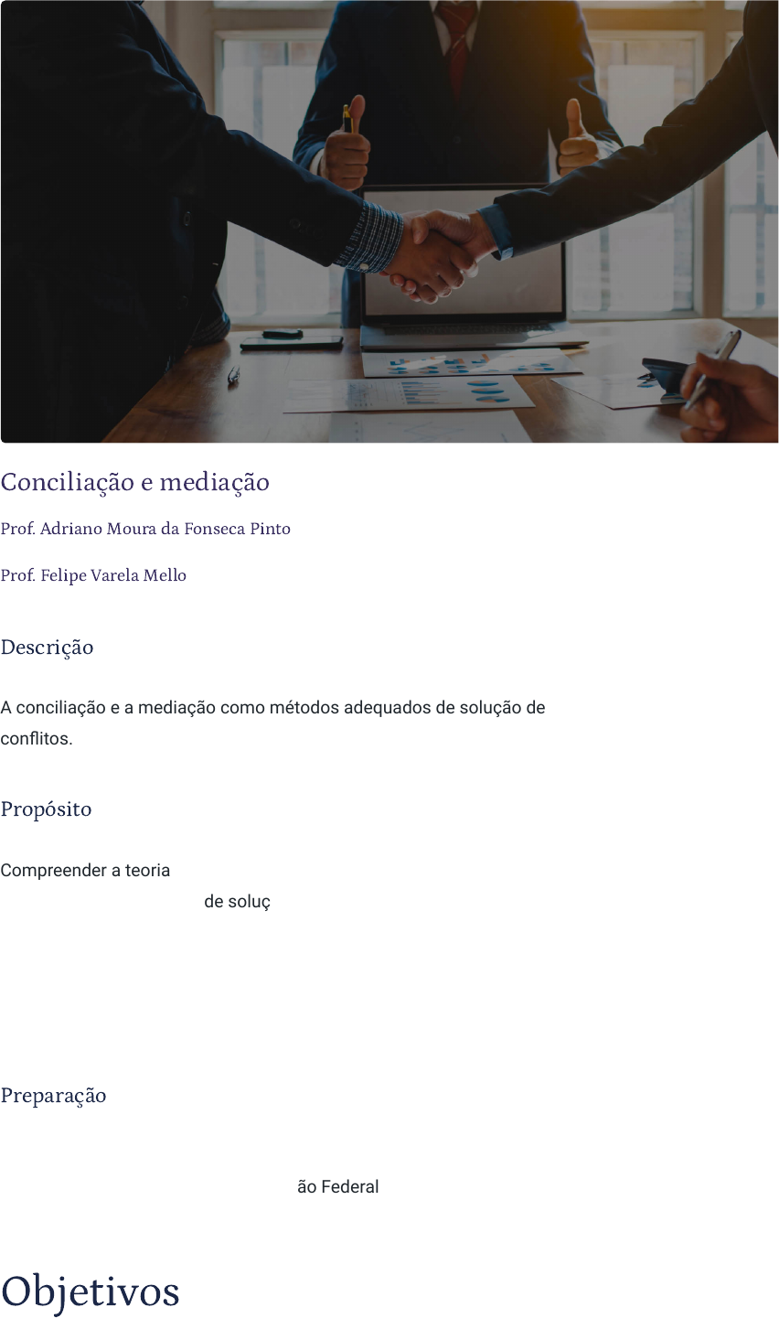 19/01/2024, 18:41 Conciliação e mediação https://stecine.azureedge.net/repositorio/00212hu/03380/index.html# 1/49 Conciliação e mediação Prof. Adriano Moura da Fonseca Pinto Prof. Felipe Varela Mello Descrição A conciliação e a mediação como métodos adequados de solução de conflitos. Propósito Compreender a teoria e a prática da conciliação e mediação, que são os dois métodos adequados de solução de conflitos mais trabalhados no âmbito do sistema de justiça no Brasil, tendo em vista ainda que ambos são cotidianamente explorados no espaço judicial e extrajudicial com iniciativas que partem do Poder Público, dos próprios interessados e ou de seus representantes jurídicos. Preparação Antes de iniciar o estudo do presente conteúdo, tenha em mãos o Código de Processo Civil, a Constituição Federal e a Lei 13140/2015. Objetivos 19/01/2024, 18:41 Conciliação e mediação https://stecine.azureedge.net/repositorio/00212hu/03380/index.html# 2/49 Módulo 1 A conciliação e suas características Reconhecer a conciliação e suas características como o método mais antigo em operação no sistema de justiça brasileiro. Módulo 2 Mediação: visão normativa e espécies aplicáveis ao tratamento de con�itos no Brasil Analisar a mediação e suas espécies aplicáveis no cenário do tratamento de conflitos no Brasil. Módulo 3 Procedimentos e práticas de mediação Distinguir os procedimentos de mediação e suas respectivas práticas. Introdução Os conflitos fazem parte de nossa existência e não vão desaparecer da face da Terra. A afirmação acima pode parecer pessimista ou desanimadora, mas é a pura verdade em se tratando das relações sociais às quais o ser humano, demais 19/01/2024, 18:41 Conciliação e mediação https://stecine.azureedge.net/repositorio/00212hu/03380/index.html# 3/49 seres vivos e o meio ambiente como um todo estão sujeitos. A sujeição do ser humano às reações da natureza e de outros seres vivos é imprevisível e incontrolável. O fato é que o tratamento dado e regulado pelos Estados às suas próprias relações e às relações de seus cidadãos e organizações está ainda afastado de tal desejo. É justamente no campo do tratamento dos conflitos que o estudo da conciliação e da mediação tem um importante significado histórico e cultural para um determinado povo, coletivo de indivíduos e as pessoas naturais e jurídicas propriamente ditas. É por tais meios que a sociedade e o estado podem dar um tratamento mais adequado a certos conflitos, estejam eles judicializados ou não. Neste conteúdo, entenderemos os métodos da Conciliação e Mediação com suas características, aplicações, procedimentos e as respectivas competências e habilidades necessárias à sua prática por aqueles que navegam, orbitam nos espaços públicos e privados de solução de conflitos. 1 - A conciliação e suas características Ao �nal deste módulo, esperamos que você reconheça a conciliação e suas características como o método mais antigo em operação no sistema de justiça brasileiro. 19/01/2024, 18:41 Conciliação e mediação https://stecine.azureedge.net/repositorio/00212hu/03380/index.html# 4/49 Ligando os pontos Você sabe quais são as características do procedimento da conciliação? Conseguiria afirmar se ele é opcional ou obrigatório no processo? Para respondermos a essas perguntas na prática, vamos analisar um case. No intuito de estimular a solução de litígios por meio da consensualidade, o art. 334 do Código de Processo Civil dispõe que, se a petição inicial preencher seus requisitos essenciais e não for o caso de improcedência liminar do pedido, o juiz designará audiência de conciliação ou de mediação com antecedência mínima de trinta dias, devendo ser citado o réu com pelo menos vinte dias de antecedência. Suponha que, em um caso concreto, Rafael ajuizou ação indenizatória contra Miriam, e, na petição inicial, informou que não possuía interesse na audiência de conciliação prevista no art. 334 do CPC. Uma vez distribuída a ação em determinada Vara Cível do Tribunal de Justiça do Estado do Rio de Janeiro, o Juízo responsável da causa determinou a citação de Miriam, bem como designou audiência de conciliação para certo dia, hora e local. Após a leitura do case, é hora de aplicar seus conhecimentos! Vamos ligar esses pontos? Questão 1 Considerando o caso narrado, assinale a alternativa correta sobre a obrigatoriedade de as partes comparecerem à audiência de conciliação: A Miriam não deve comparecer à audiência de conciliação, pois suspeita que Rafael não irá comparecer, de modo que sua presença na referida audiência seria desnecessária. B Rafael não precisa comparecer à audiência de conciliação, pois já manifestou seu desinteresse na petição inicial. 19/01/2024, 18:41 Conciliação e mediação https://stecine.azureedge.net/repositorio/00212hu/03380/index.html# 5/49 Parabéns! A alternativa E está correta. Rafael deve comparecer à audiência, tendo em vista que, nos termos do art. 334, §4º, I, do CPC, a audiência somente não será realizada se ambas as partes manifestarem expressamente desinteresse na composição consensual, o que não foi o caso. Além disso, nos termos do art. 334, §8º, do CPC, o seu não comparecimento injustificado é ato atentatório à dignidade da justiça e será sancionado com multa. Questão 2 Na hipótese de realizada a audiência de conciliação determinada, e entendendo o juiz e as partes que será preciso a realização de mais uma audiência para celebração de acordo, assinale a alternativa correta: C Rafael deve comparecer à audiência de conciliação, sob pena de ter seu processo extinto sem resolução do mérito, por falta de interesse de agir. D Rafael e Miriam não precisam comparecer à audiência de conciliação, ainda que o juiz da causa tenha designado dia, hora e local para su