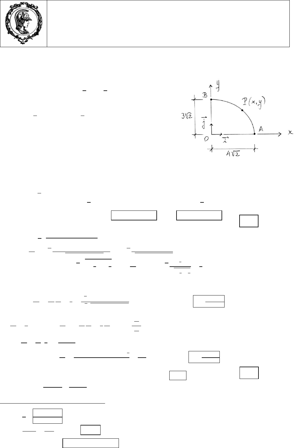 ESCOLA POLITÉCNICA DA UNIVERSIDADE DE SÃO PAULO Departamento de Engenharia Mecânica PME 3100 – MECÂNICA 1 – Segunda Prova – 7 de Novembro de 2023. Duração: 120 min. (Não é permitido o uso de calculadoras, celulares, tablets e dispositivos similares) 1ª Questão (3,0 pontos). O ponto P percorre o quadrante de uma elipse, com semieixos 4√2 e 3√2, de A até B : O movimento de P é definido pelas equações do movimento (em formulação adimensional): 𝑥 = 4√2 cos 𝑡 e 𝑦 = 3√2 sin 𝑡, sendo 0 ≤ 𝑡 ≤ 𝜋/2 Determine, para o instante t = π 4⁄ : a) A velocidade e a aceleração na base fixa b) Os versores do triedro de Frenet c) A velocidade e a aceleração intrínsecas, na base de Frenet d) O raio de curvatura da trajetória RESOLUÇÃO a) Velocidade e aceleração na base fixa r⃗ = √2 (4 cos t i⃗ + 3 sin t j⃗) ∴ v⃗⃗ = ṙ⃗ = √2 (− 4 sin t i⃗ + 3 cos t j⃗) e a⃗⃗ = v̇⃗⃗ = √2 (− 4 cos t i⃗ − 3 sin t j⃗) No instante t = π 4⁄ temos: v⃗⃗ = − 4 i⃗ + 3 j⃗ e a⃗⃗ = − 4 i⃗ − 3 j⃗ b) Versores da base de Frenet Temos: 𝑣 = √2√16 sin2 t + 9 cos2 t ⇒ ⇒ 𝑑𝑣 𝑑𝑡 = √2 32 sin t cos t−18 cos t sin t 2√16 sin2 t+9 cos2 t = 7√2 sin t cos t √16 sin2 t+9 cos2 t Em t = π 4⁄ teremos: 𝑣 = √2√16 1 2 + 9 1 2 = 5 e 𝑑𝑣 𝑑𝑡 = �̇� = 7√2 1 2 √16 1 2 +9 1 2 = 7 5 Sendo s o comprimento do arco medido sobre a curva, de A até P, usando a definição dos versores de Frenet, teremos: 𝜏 = 𝑑𝑃 𝑑𝑠 = 𝑑𝑃 𝑑𝑡 𝑑𝑡 𝑑𝑠 = �⃗⃗� 𝑣 = √2 (– 4 sin ti⃗+3 cos tj⃗) √2√16 sin2 t+9 cos2 t ; em t = π 4⁄ teremos: �⃗⃗� = − 𝟒 �⃗�+𝟑 �⃗� 𝟓 Para o versor normal: 𝑑�⃗⃗� 𝑑𝑠 = 1 𝜌 �⃗⃗� ⇒ �⃗⃗� = 𝜌 𝑑�⃗⃗� 𝑑𝑠 = 𝜌 𝑑�⃗⃗� 𝑑𝑡 𝑑𝑡 𝑑𝑠 = 𝜌 𝑣 𝑑�⃗⃗� 𝑑𝑡 ⇒ �⃗⃗� = 𝑑�⃗⃗� 𝑑𝑡 | 𝑑�⃗⃗� 𝑑𝑡 | Temos: 𝑑�⃗⃗� 𝑑𝑡 = 𝑑 𝑑𝑡 [ �⃗⃗� 𝑣 ] = �̇⃗⃗�∙𝑣−�⃗⃗�∙�̇� 𝑣2 Em t = π 4⁄ teremos: 𝑑�⃗⃗� 𝑑𝑡 = (− 4 i⃗−3 j⃗ )∙5−(−4i⃗+3 j⃗)∙ 7 5 25 = 24 125 (−3 i⃗ − 4 j⃗) ⇒ �⃗⃗⃗� = −𝟑 �⃗�−𝟒 �⃗� 𝟓 Para o versor binormal, tratando-se de uma curva no plano xy: �⃗⃗⃗� = �⃗⃗⃗� ou �⃗⃗� = 𝜏 ∧ �⃗⃗� = − 4 i⃗+3 j⃗ 5 ∧ −3 i⃗−4 j⃗ 5 = �⃗⃗� RESOLUÇÃO ALTERNATIVA do item b): 𝜏 = �⃗� 𝑣 = − 𝟒 �⃗� + 𝟑 �⃗� 𝟓 b⃗⃗ = v⃗⃗⃗∧a⃗⃗ | v⃗⃗⃗∧a⃗⃗ | = 24 k⃗⃗⃗ 24 ∴ b⃗⃗ = k⃗⃗ n⃗⃗ = b⃗⃗ ∧ τ⃗⃗ ∴ n⃗⃗ = − 0,6 i⃗ − 0,8 j⃗ 0,5 1,0 ESCOLA POLITÉCNICA DA UNIVERSIDADE DE SÃO PAULO Departamento de Engenharia Mecânica c) Velocidade e aceleração intrínsecas v⃗⃗ = ( v⃗⃗ ∙ τ⃗⃗ ) τ⃗⃗ ∴ v⃗⃗ = 5 τ⃗⃗ a⃗⃗ = ( a⃗⃗ ∙ τ⃗⃗ ) τ⃗⃗ + ( a⃗⃗⃗ ∙ n⃗⃗ ) n⃗⃗ ∴ a⃗⃗ = 1,4 τ⃗⃗ + 4,8 n⃗⃗ d) Raio local de curvatura ρ = | v⃗⃗⃗ |3 | v⃗⃗⃗∧a⃗⃗ | = 53 24 ∴ ρ = 125 24 1,0 0,5 ESCOLA POLITÉCNICA DA UNIVERSIDADE DE SÃO PAULO Departamento de Engenharia Mecânica 2ª Questão (3,5 pontos). No sistema mostrado na figura, o disco de centro fixo O tem raio R e vetor de rotação k = , constante. O disco rola sem escorregar em relação à barra BC, que tem liberdade para mover-se verticalmente. A barra CD tem comprimento L, está articulada em C e desliza no ponto D, mantendo contato com a superfície horizontal. Para o instante considerado, pede-se: a) A velocidade do ponto A, localizado na periferia do disco, e de forma que o vetor (A – O) é paralelo a 𝑖. b) Os centros instantâneos de rotação (CIR) do disco e da barra CD. c) O vetor de rotação da barra CD. d) A aceleração do ponto A pertencente ao disco e do ponto C. RESOLUÇÃO a) Velocidade do ponto 𝐴 𝑉𝐴 ⃗⃗⃗⃗⃗ = 𝑉𝑂 ⃗⃗⃗⃗⃗ + �⃗⃗⃗� ∧ (𝐴 − 𝑂) ⇒ 𝑉𝐴 ⃗⃗⃗⃗⃗ = 0⃗⃗ + 𝜔�⃗⃗� ∧ (𝑅𝑖) ⇒ 𝑽𝑨 ⃗⃗⃗⃗⃗⃗ = 𝝎𝑹𝒋 b) CIR do disco O CIR do disco está no ponto O, que é um ponto fixo Para a barra CD, CIRCD está sobre o ponto P b) Vetor rotação da barra 𝐶𝐷 A barra BC está em translação com velocidade igual a 𝑉𝐴 ⃗⃗⃗⃗⃗ Portanto, 𝑉𝐶 ⃗⃗⃗⃗⃗ = 𝜔𝑅𝑗 Para a barra CD: 𝑉𝐶 ⃗⃗⃗⃗⃗ = 𝑉𝑃 ⃗⃗⃗⃗⃗ + 𝜔𝐶𝐷⃗⃗⃗⃗ ⃗⃗⃗⃗⃗ ∧ (𝐶 − 𝑃) ⇒ 𝜔𝑅𝑗 = 0⃗⃗ + 𝜔𝐶𝐷 �⃗⃗� ∧ (𝐿𝑐𝑜𝑠𝜃𝑗) ⇒ 𝜔𝐶𝐷 = 𝜔𝑅 𝐿𝑐𝑜𝑠𝜃 ⇒ �⃗⃗⃗⃗�𝑪𝑫 = 𝝎𝑹 𝑳𝒄𝒐𝒔𝜽 �⃗⃗⃗� c) Aceleração do ponto A do disco e do ponto C Para o disco: �⃗�𝐴 = �⃗�𝑂 + �̇⃗⃗⃗� ∧ (𝐴 − 𝑂) + �⃗⃗⃗� ∧ [�⃗⃗⃗� ∧ (𝐴 − 𝑂)] ⇒ �⃗�𝐴 = 0⃗⃗ + 0⃗⃗ + 𝜔�⃗⃗� ∧ [𝜔𝑅𝑗] ⇒ �⃗⃗⃗�𝑨 = −𝝎𝟐𝑹𝒊 Como �⃗⃗⃗� é constante, 𝑉𝐶 ⃗⃗⃗⃗⃗ é constante ⇒ 𝒂𝑪⃗⃗ ⃗⃗⃗ = �⃗⃗⃗� A i j D O B C θ C D P 0,5 0,5 0,5 1,0 0,5 0,5 ESCOLA POLITÉCNICA DA UNIVERSIDADE DE SÃO PAULO Departamento de Engenharia Mecânica 3ª Questão (3,5 pontos). A placa quadrada 𝐴𝐵𝐶𝐷, de lado 2𝑎, gira em torno do eixo vertical 𝐴𝐷 com velocidade angular 𝜔1�⃗⃗� (𝜔1 constante). A barra delgada 𝑂𝑃, de comprimento ℓ, é vinculada ao ponto 𝑂 (localizado no centro da placa) por meio de um pino que a impede de mover-se fora do plano 𝑂𝑦𝑧. Sabendo que a barra 𝑂𝑃 gira com velocidade angular 𝜔2𝑖 (𝜔2 constante) em torno do eixo 𝑂𝑥 e denotando por 𝜃 o ângulo fomado entre 
