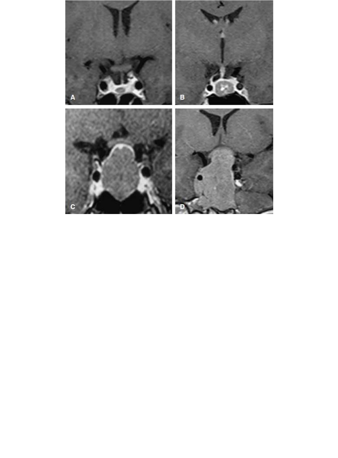 Figura 7.1 Exemplos de ressonância magnética de sela túrcica pré-operatória de pacientes com acromegalia curados com tratamento primário cirúrgico (corte coronal, sequência pesada em T1, após administração de gadolínio). A. Microadenoma intrasselar. B. Macroadenoma intrasselar. C. Macroadenoma com expansão infrasselar e suprasselar com rechaço superior do quiasma óptico. D. Macroadenoma com expansão infrasselar e suprasselar com compressão de quiasma óptico e parasselar direita (a possível invasão de seio cavernoso à direita não se confirmou durante o procedimento cirúrgico). Cuidados perioperatórios Na presença de hipotireoidismo e/ou insuficiência adrenal centrais, as deficiências hormonais devem ser corrigidas antes da cirurgia. Em caso de deficiência corticotrófica, o glicocorticoide durante a cirurgia deve ser prescrito para cobertura de situação de estresse cirúrgico. A função corticotrófica deve ser reavaliada com 1 semana de cirurgia, e as funções tireoidiana e gonadal devem ser reavaliadas com 4 semanas de pós-operatório. Caso a avaliação seja normal, não há necessidade de reavaliação posterior. Pode haver recuperação da função hipofisária após a retirada do adenoma.3 Nos pacientes com queixa visual antes da cirurgia e/ou com tumores tocando as vias ópticas, deve ser solicitada campimetria visual manual (pelo método de Goldmann) e a mesma deve ser repetida após 1 mês de cirurgia. Complicações da cirurgia Considerando as cirurgias pela via transesfenoidal, a mortalidade pós-operatória é baixa (< 1%) e as complicações se correlacionam inversamente com a experiência do cirurgião; as mais frequentes são diabetes insípido (DI) transitório (20 a 30%) ou permanente (2 a 7%), secreção inapropriada do hormônio antidiurético (SIADH, 10 a 20%), sinusite (8%), fístula liquórica (5%), epistaxe (2%), meningite (1%), paralisias oculomotoras, perda visual e lesão da carótida (raras).4,6,8 É necessário o monitoramento do balanço hídrico por até 2 semanas de pós-operatório, pois pode ocorrer SIADH em até 20% dos pacientes e DI transitório em até 30% dos pacientes.13–15 A SIADH se manifesta por hiponatremia, cujo quadro clínico é inespecífico e pode se confundir com o quadro de insuficiência adrenal (hiporexia, náuseas, tontura, redução do nível de consciência). A hiponatremia é mais comum nas primeiras 48 horas de pós-operatório, mas um segundo pico de incidência de hiponatremia sintomática ocorre com 7 a 8 dias de cirurgia.14 Desse modo, é muito importante monitorar a natremia do paciente nesse período. file:///C|/Users/AnaMilk/Desktop/Vilar/Endocrinologia%20Cl%EDnica,%20Sexta%20edi%E7%E3o%20(125).html#bib3 file:///C|/Users/AnaMilk/Desktop/Vilar/Endocrinologia%20Cl%EDnica,%20Sexta%20edi%E7%E3o%20(125).html#bib4 file:///C|/Users/AnaMilk/Desktop/Vilar/Endocrinologia%20Cl%EDnica,%20Sexta%20edi%E7%E3o%20(125).html#bib6 file:///C|/Users/AnaMilk/Desktop/Vilar/Endocrinologia%20Cl%EDnica,%20Sexta%20edi%E7%E3o%20(125).html#bib8 file:///C|/Users/AnaMilk/Desktop/Vilar/Endocrinologia%20Cl%EDnica,%20Sexta%20edi%E7%E3o%20(125).html#bib13 file:///C|/Users/AnaMilk/Desktop/Vilar/Endocrinologia%20Cl%EDnica,%20Sexta%20edi%E7%E3o%20(125).html#bib15 file:///C|/Users/AnaMilk/Desktop/Vilar/Endocrinologia%20Cl%EDnica,%20Sexta%20edi%E7%E3o%20(125).html#bib14 Endocrinologia Clinica - Vilar 6 edicao