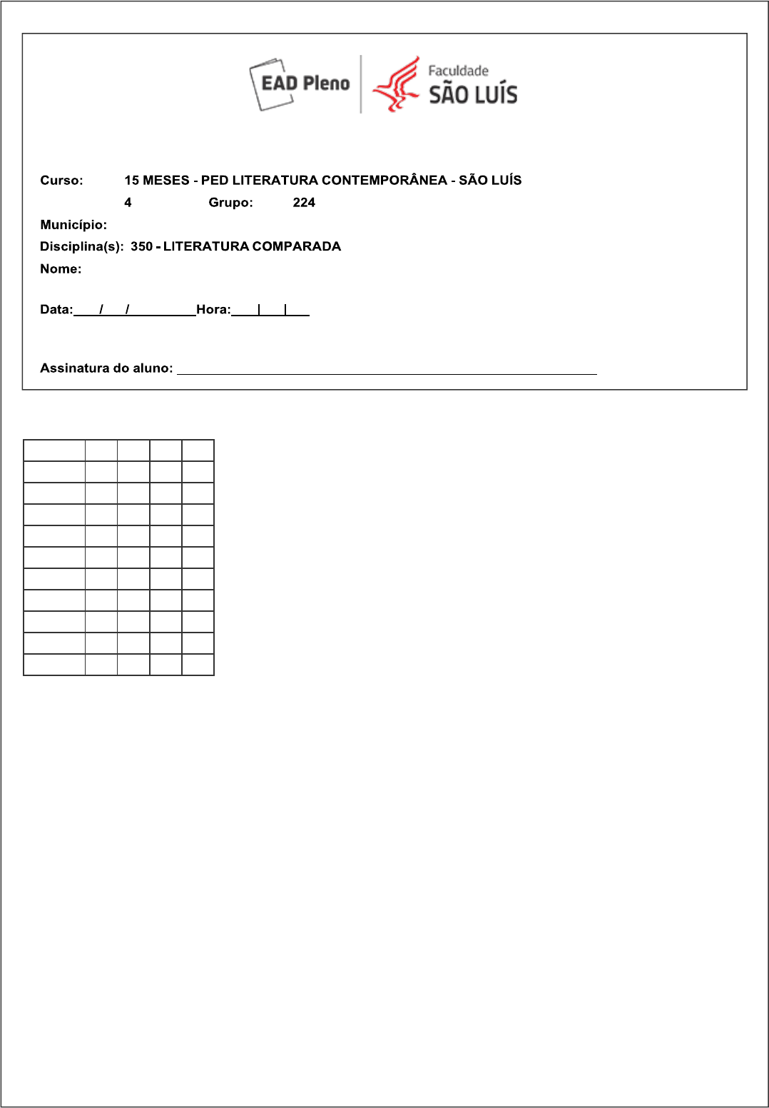 Prova regular presencial Módulo: Preencha o gabarito abaixo com X na coluna correta. Atente para a coluna de numeração e das alternativas. Questões A B C D 1 X 2 X 3 X 4 5 6 7 8 9 10 1 ) Sabe-se que a construção de um determinado texto pode se dar pela apropriação intertextual de matrizes consagradas, que representam referências partilhadas por um grande número de pessoas. Assim, é correto afirmar que A ) não existe, entre as diversas crenças monoteístas, um diálogo inter-reliogoso na medida em que as suas matrizes imaginárias e éticas não são coincidentes. B ) tanto a Bíblia como a cultura clássica, ou mesmo os demais textos canônicos, podem servir como referência intertextual na produção literária contemporânea. C ) com a secularização, as histórias e personagens centrais da Bíblia passaram a ser uma mera referência para a intertextualidade entre o antigo e o moderno. D ) a cultura clássica deixou de ser referência nos textos literários por volta do século I d.C. na medida em que, nessa época, deu-se a consolidação da Bíblia. 2 ) Sobre O Processo, de Franz Kafka, é correto afirmar que A ) processado sem saber o motivo, desde o início Josef K. luta contra injustiças e a falta de lei de uma sociedade em que tal processo se justifica. B ) narra a história de Josef K., funcionário bem posicionado que consegue se mover com agilidade nos meandros do processo que está sofrendo. C ) retrata o abismo entre o indivíduo e a sociedade, na qual Josef K. permanece impotente diante de um poder opressor cuja face não vislumbra. D ) a declaração final "Como um cão" demonstra que, assim como o camponês de ?Diante da Lei?, Josef K. teve justificativas para tudo que lhe aconteceu. 3 ) A obra de João Guimarães Rosa sofreu importante influência de várias áreas do conhecimento, sobretudo as artes visuais, sendo correto afirmar que A ) nas cadernetas de Rosa há observações sobre obras de arte visuais, sendo material fértil para estudos comparativos entre obra literária e pintura, levando o leitor a maior atenção aos aspectos visuais do texto literário. B ) os estudos interartes, que compõem o que se considera como a vertente norte-americana da Literatura Comparada, têm como foco o entrecruzamento, dentro de uma obra literária, de referências diretas a pinturas conhecidas. C ) interessava a Rosa muito mais uma apreensão da paisagem por meio de análise de técnicas de pintura que a atenção ao corpo humano e à sua forma ? e em suas cadernetas essa desigualdade é muito presente. D ) em Rosa, sobretudo a partir de suas anotações pessoais, fica claro que a interferência das artes visuais deu-se muito mais na observação de pinturas por parte do escritor que em uma análise cuidadosa de conceitos dessas artes. 4 ) Sobre a obra Os Sertões, de Euclides da Cunha, e o conflito de Canudos, é correto afirmar que A ) desde o início da sua redação Os Sertões foi concebida por seu autor como uma obra literária ficcional, apesar de o maior contato de Euclides da Cunha sempre ter sido com o meio jornalístico e científico e não com as rodas literárias do seu tempo. B ) a Guerra de Canudos foi iniciada por Antonio Conselheiro, que com seu forte carisma recrutou milhares de seguidores para construir uma nova sociedade brasileira, sendo um exemplo para o restante do país, principalmente para o poder centrado no Sudeste. C ) foram necessárias quatro expedições militares para finalmente encerrar esse conflito entre o arraial de Canudos e o Rio de Janeiro, sendo que uma delas precisou rechaçar tropas sertanejas que estavam avançando em direção à capital da jovem república. D ) sabendo da comunidade liderada pelo Conselheiro, a capital federal enviou várias expedições militares para exterminar o que considerava uma revolta armada contra a república e, segundo rumores, seria insuflada por interesses europeus e monarquistas. 5 ) Analise as afirmativas a seguir sobre a tela Independência ou Morte, de Pedro Américo, e sua relação com aliteratura.É um exemplo I. de obra de arte que retrata uma realidade social e histórica. A partir de sua análise, é possível perceber não apenas o destaque dado aos protagonistas do fato retratado como também a referência sutil ao homem do povo, evidenciado como um trabalhador braçal. Isso possibilita uma leitura bastante significativa da época em que a obra foi feita. II. Uma das leituras que a obra permite é a de que o povo foi retratado como secundário frente às tomadas de decisão. III. Em um movimento de busca de identidade nacional, algumas obras literárias foram importantes no processo de ?nacionalização? do Brasil, que havia se tornado independente. O quadro de Pedro Américo é exemplo de obra de arte concebida no âmbito desse movimento. Entre essas afirmações, A ) apenas I está correta. B ) apenas III está correta. C ) apenas I e II estão corretas. D ) I, II e III estão corretas. 6 ) A literatura comparada A ) pode abordar diferentes visões de mundo, mas se caracteriza no seu intento específico apenas no momento em que apresenta a relação entre as questões religiosas e a sociedade. B ) trabalha sobretudo com as questões de fundo religioso presentes nas obras literárias na medida em que sempre tem em vista colaborar para a paz e a compreensão entre os povos. C ) trabalha com os conteúdos de uma tradição já arraigada, tendo a possibilidade de tratar de questões de cunho religioso, na maioria das vezes destacando a desavença entre os povos. D ) é um instrumento de análise e reflexão para a humanidade ao abordar questões culturais, buscando, de modo neutro e esclarecedor, trazer à tona a diversidade entre as sociedades. 7 ) Em dado momento de A Montanha Mágica, de Thomas Mann, o narrador considera que ?Pode-se narrar o tempo, o próprio tempo, o tempo como tal e em si? Não, isso seria uma empresa deveras tola.? A partir disso, analise algumas afirmativa