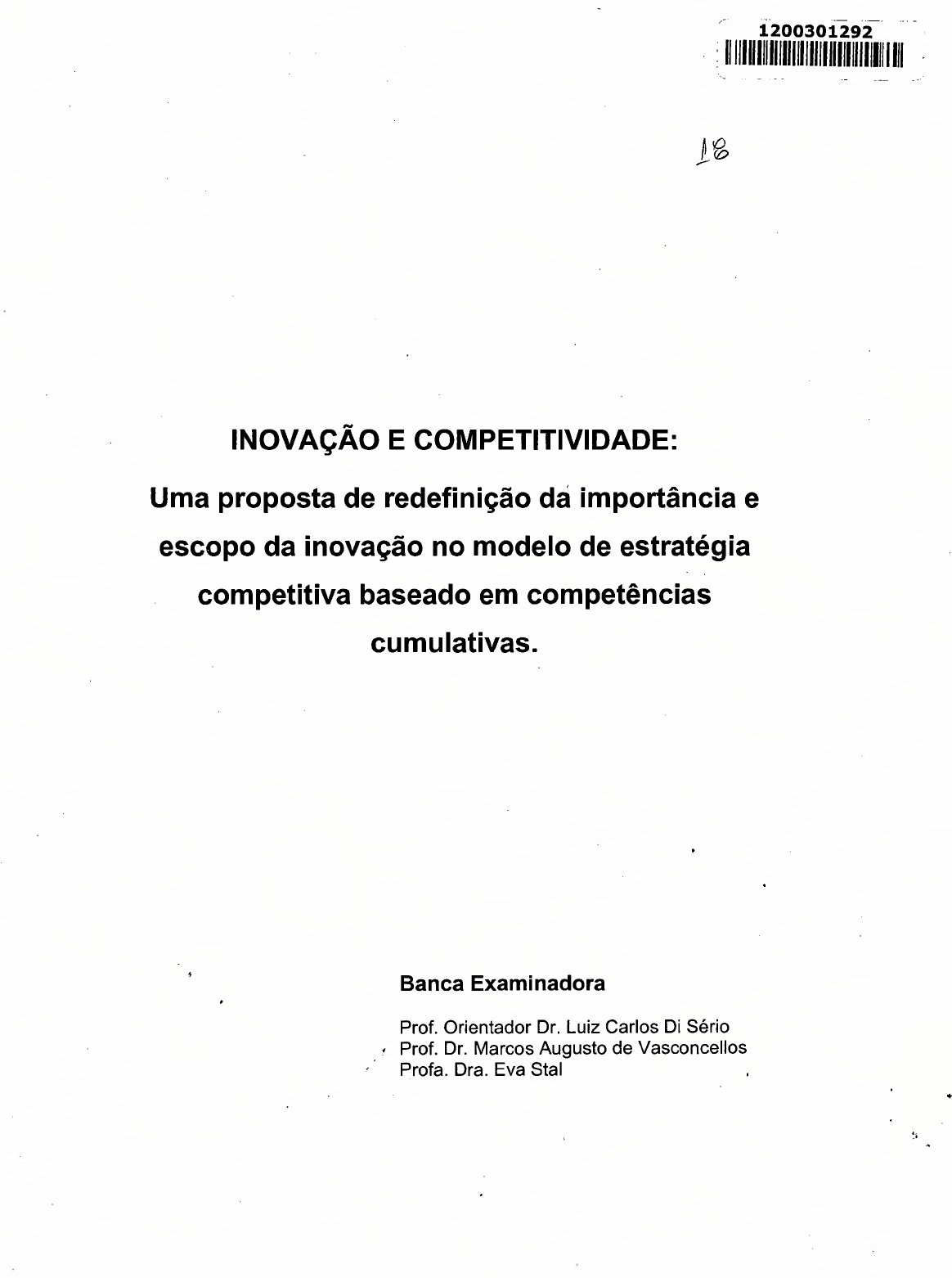 1200301292 . .l 11111111111111111111111111111111111111 INOVAÇÃO E COMPETITIVIDADE: Uma proposta de redefinição da importância e escopo da inovação no modelo de estratégia competitiva baseado em competências cumulativas. Banca Examinadora Prot. Orientador Or. Luiz Carlos Oi Sério , Prot. Or. Marcos Augusto de Vasconcellos Prota. Ora. Eva Stal í . r À minha amada Celi, e aos meus filhos André e Daniel, dedico este trabalho. ii FUNDAÇÃO GETULIO VARGAS ESCOLA DE ADMINISTRAÇÃO DE EMPRESAS DE SÃO PAULO EDMILSON ALVES DE MORAES INOVAÇÃO E COMPETITIVIDADE: Uma proposta de redetinição da importância e escopo da inovação no modelo de estratégia competitiva baseado em competências cumulativas. (") (S) (S) (\J <, (\J cn (\J Fundação Getulio Varga!l; Escola de Administração de Empresas de Sl.o Pillulo Biblioteca Dissertação apresentada ao Curso de Pós-Graduação da FGV/EAESP Área de Concentração: Administração da Produção e Operações Industriais como requisito para obtenção do título de mestre em Administração Orientador: Prot. Dr. Luiz Carlos Di Sério "tO,~,', SÃO PAULO 2003 iii 'e!aJ'V ap auo8 -le:J!pe~ OIE:5eAoul- SeA!lelnwn8 sepu;;nadw08 - apep!A!l!ladw08 - eA!l!ladwo8 e!5'}leJls3 - OIE:5eAoul :saAeLl8-seJAeled ,S!enl!a:JuO:J saseq sens opueoõrsuede a opueuduia 'ojapoui op oiuaurerounrda aied soueouoo seisep olE:5ez!l!ln e a 'apep!le:J!peJ ens ~ oiuenb e-opuarqopssp 'OIE:5eAOU! ap Ol!a:JUO:J op OIE:5e!ldwe e as-eçdord oqteqan alsaN 'soisno wa epuªP!Ja ep a apep!l!q!xalJ ep 'opipad op oiueunpueie ap zaprde, ep 'e5aJlUa ap apep!l!qe!Juo:J ep 'apepuanb ep rouojue OlUaW!AIOAUasap op epuªobasuo:J ewn ela opuas 'ep!5u!le ras e aíueuodun s!ew epuªladwo:J e ouioo OIE:5eAOU!e ureruoui 'seA!lelnwn:J OIESanb a welaldwo:J as anb sepuªladwo:J ap OlUaW!AIOAUasapou e!aseq as anb '"e!aJe ap auo:J" opeuuuouep oA!l!ladwo:J ojepoui op seiueoai sOlUaW!AIOAUasao .oumssg '(saQ:5eJadO a olE:5npOJd:olE:5eJlua:Juo8 ap eaJ'V '1\8.::1/dS3'V3 ep oe:JenpeJ8 -s9d ap oSJn8 oe epeiuesarde opeJlsaV\l ap olE:5elJass!o) 'dO€ ~ '€OO~ '1\8.::1/dS3'V3 :olned OIES'SeA!lelnwn:J sepuªladwo:J wa opeaseq eA!l!ladwo:J e!59leJlsa ap ojepoui ou OIE:5eAOU!ep odoosa a e!:Ju,ªlJodw! ep OIE:5!u!JapaJ ap eisodord ewn :apep!A!l!ladwo:J a OIE:5eAoul 'ap saAI'V UOSI!WP3 'S3~OV\l 'V'() f,ooç/~bcr ·S)~ oqU.IOL "'!--\:"t"\4 ~- ,'IOO'~9 SO'lr epew?! n ep oN EleC] ~------ SOlned oes ap seseJdw3 sp o~6eJlS!U!WP'v'ep elQ:ls3 SUMÁRIO 1. INTRODUÇÃO ~ 1 2. OBJETIVOS DA PESQUISA 4 3. JUSTIFICATIVA DO TRABALHO 5 4. REVISÃO DA TEORIA 5 4.1. VALORPARAO CLIENTE 6 4.2. COMPETITIVIDADE 11 4.3. FATORESSIST~MICOSQUEAFETAMA COMPETITIVIDADE 13 4.3.1. Velocidade Evolutiva 14 4.3.2.A Tecnologia da Informação 16 4.4. VANTAGEMCOMPETITIVAE ESTRATÉGIACOMPETITIVA 19 4.4.1. Vantagem Competitiva 19 4.4.2. Estratégia Competitiva 20 4.5. COMPET~NCIASDISTINTIVASEVANTAGEMCOMPETITIVA .40 4.5.1. Estratégia de Manufatura 42 4.5.2. Objetivos Conflitantes (trade-offs) 45 4.5.3. Critérios Qualificadores e Ganhadores de Pedido 46 4.6. DEFINiÇÃOE FUNDAMENTOSDASCOMPET~NCIASDISTINTIVAS 49 4.6.1. Qualidade 50 4.6.2. Confiabilidade 51 4.6.3. Rapidez ou Velocidade 52 4.6.4. Custo 53 4.6.5. Entrega 54 4.6.6. Flexibilidade 55 4.6.7. Inovação 56 4.7. O MODELODECOMPET~NCIASCUMULATIVAS 57 4.7.1. O modelo Cone de Areia 58 4.7.2. Os Requisitos de Mercado e os Critérios de Desempenho 61 iv 4.7.3. Evolução do Modelo Cone de Areia 65 4.8. FUNDAMENTOSE TIPOS DE INOVAÇÃO 67 4.8.1. Fundamentos Econômicos da Inovação 69 4.8.2. Grau de Ruptura da Inovação 70 4.8.3. Os Ciclos de Inovação 74 5. METODOLOGIA 78 5.1. ABORDAGENSDA PESQUISACIENTIFICA 78 5.2. NfvEIS DE PESQUISA 80 5.3. CAMINHOSDE PESQUISAADOTADOS 80 5.3.1. Pesquisa Documental 81 5.3.2. Estudo de Caso 81 5.4. ETAPASDA PESQUISA 84 6. PESQUISA 84 6.1. A EMPRESA 88 6.2. A INDÚSTRIADE LATAS 89 6.3. INOVAÇÕES...................•...................................................................... 92 6.4. UMA EMPRESAINOVADORA 93 6.5. EVENTOSQUECARACTERIZARAMO DESENVOLVIMENTODAS INOVAÇÕES.. 94 6.6. RESULTADOSDA PESQUISA 98 7. ANÁLISE CRiTICA DO PAPEL DA INOVAÇÃO NO MODELO CUMULATIVO 99 7.1. CONTEXTOHISTÓRICOE SUASIMPLICAÇÕES , 99 7.2. CUMULATIVIDADEE CONFLITODE OBJETIVOS(TRADE-OFF) 100 7.3. AMPLITUDEDOCONCEITODE INOVAÇÃO 102 8. CONCLUSÃO 110 9. REFERÊNCIA BIBLIOGRÁFICA 112 v índice de Figuras Figura 01 - Criando valores que os clientes podem ver 7 Figura 02 - As quatro etapas para o gerenciamento do valor do cliente 10 Figura 03 - Fatores determinantes da competitividade da indústria 12 Figura 04 - Hélice Dupla 15 Figura 05 - Cinco níveis de transformação de negócios baseado em TI 17 Figura 06 - As correntes explicativas da vantagem competitiva 21 Figura 07 - Forças que dirigem a concorrência na indústria 23 Figura 08 - Três estratégias genéricas 25 Figura 09 - As disciplinas de valor 30 Figura 10 - Destruição criativa 32 Figura 11 - Ondas de Mudança 33 Figura 12 - Busca da Competitividade 37 Figura 13 - Concepção da empresa diversificada 38 Figura 14 - Definição da agenda de competências essenciais 39 Figura 15 - Níveis da estratégia 42 Figura 16 - Critérios qualificadores e ganhadores de pedidos 47 Figura 17 - Qualidade superior conduz a maiores margens .49 Figura 18 - Tempo total de fluxo 52 Figura 19 - Visão tradicional x Visão japonesa da estratégia de manufatura58 Figura 20 - Modelo Cone de Areia 60 Figura 21 - Requisitos do mercado e critérios de desempenho 63 Figura 22 - Requisitos, critérios e tipos de firma 64 Figura 23 - Modificação proposta por Slack 65 Figura 24 - Pirâmide das prioridades competitivas 66 Figura 25 - Curvas S 71 Figura 26 - Ciclos tecnológicos 76 Figura 27 - Desenho esquemático do fechamento plus 92 vi Figura 28 - Critérios de desempenho 101 Figura 29 - Compromisso entre custo e nível de serviço 102 Figura 30 - Custo total x Pacote de valor oferecido ao cliente 104 Figura 31 - Grau de 