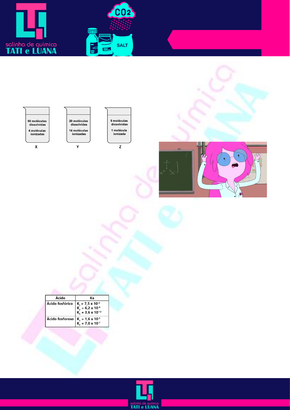 FUNÇÕES INORGÂNICAS L ista 2 3 QUESTÃO 1 (Mackenzie SP) Um técnico químico preparou três soluções de ácidos diferentes (X, Y e Z), sob as mesmas condições de temperatura e pressão e com o mesmo volume de água, como ilustra a figura abaixo. Desta forma, são realizadas as seguintes afirmações. I. a solução Y é a que apresenta a maior condutividade elétrica. II. a solução Z possui um grau de ionização de apenas 0,2 %. III. das três soluções, a solução X representa o ácido mais fraco. Sendo assim, a) está correta apenas a afirmação I. b) estão corretas apenas as afirmações I e II. c) estão corretas apenas as afirmações I e III. d) estão corretas apenas as afirmações II e III. e) estão corretas todas as afirmações. QUESTÃO 2 (PUC SP) Considere as constantes de ionização dos ácidos fosfórico e fosforoso em solução aquosa a 25ºC e analise as afirmações a seguir. I. Considerando a fórmula estrutural do ácido fosforoso, apenas 2 átomos de hidrogênio estão ligados a átomos de oxigênio. II. O ácido fosforoso possui a fórmula H3PO3 e, portanto, possui 3 hidrogênios ionizáveis. III. O ácido fosfórico possui a fórmula H3PO2 e pode ser classificado como oxiácido e triácido. Assinale a(s) afirmativa(s) CORRETA(S). a) I. b) I e II. c) I e III. d) I, II e III. QUESTÃO 3 (UPE PE) Quando chegou ao seu laboratório, a princesa Jujuba ficou desesperada com algo que viu no quadro utilizado pelo Mordomo Menta. Sobre o composto desenhado, é CORRETO afirmar que a) representa um ácido. b) representa um sal ácido de hidrólise básica. c) é estável e não apresenta cargas elétricas, ou seja, não é um cátion nem um ânion. d) apresenta um erro na sua estrutura, uma vez que carbono e oxigênio estão com quantidades incompatíveis de ligações químicas. e) apresenta um erro na sua estrutura, uma vez que carbono e oxigênio, por serem ametais, não podem se unir por ligação covalente. QUESTÃO 4 (FCM PB) Na antiguidade, as propriedades organolépticas, eram importantes na caracterização das substâncias. A palavra ácido, por exemplo, vem do latim acere, que significa azedo, e produtos que tinham esse sabor, como o vinagre, o leite coalhado e o suco de limão, eram considerados ácidos. Atualmente, sabemos que o sabor azedo característico destes produtos é devido à presença de ácidos carboxílicos em sua composição, como o ácido acético (vinagre), o ácido D-láctico (leite coalhado) e o ácido cítrico (suco de limão). A força dos ácidos varia em função de uma série de propriedades, tais como: constituintes químicos, geometria da molécula, estado de oxidação das espécies envolvidas, etc. FUNÇÕES INORGÂNICAS L ista 2 3 Considerando os ácidos HClO, HBrO e HIO, é correto afirmar que: a) O HClO é um ácido mais fraco do que o HIO. b) A ordem crescente de acidez é HIO, HBrO, HClO. c) O HBrO é um ácido mais forte do que o HClO. d) A ordem decrescente de acidez é HIO, HClO, HBrO. e) Os estados de oxidação do Cl, Br e I são –1, –2 e –3, respectivamente. QUESTÃO 5 (ACAFE SC) Baseado nos conceitos sobre funções químicas inorgânicas, analise as afirmações a seguir. I. O ácido fosforoso possui 3 hidrogênios ionizáveis. II. Os nomes dos seguintes ânions ClO–, NO2 –, CrO4 2– e P2O7 4– são, respectivamente: hipoclorito, nitrito cromato e pirofosfato. III. Água régia corresponde a uma mistura de 3 partes de ácido nítrico para 1 parte de ácido clorídrico. Assinale a alternativa correta. a) Todas as afirmações estão corretas. b) Todas as afirmações estão incorretas. c) Apenas I e III estão corretas. d) Apenas a II está correta. QUESTÃO 6 (UECE) Uma das formas de combater a azia, devido o excesso de produção de ácido clorídrico pelo organismo, é usar o leite de magnésia que possui caráter básico, que é um antiácido estomacal. O leite de magnésia reage com o ácido clorídrico, existente no estômago, formando um sal, neutralizando, assim, o excesso de ácido que provoca a acidez (azia) estomacal. Assinale a afirmação verdadeira. a) O leite de magnésia possui em sua composição o Mg(OH)2. b) A fórmula química do sal formado nesta reação é Mg(OH)Cl. c) O leite de magnésia apresenta pH menor do que 7. d) A equação química correta desta reação é Mg(OH)3 + 3HCl → MgCl3 + 3H2O. QUESTÃO 7 (UFPA) Entre as bases a seguir, indique quais são praticamente insolúveis em água: I. KOH II. Mg(OH)2 III. NaOH IV. Al(OH)3 V. Fe(OH)2 VI. LiOH a) V e VI b) IV e VI c) II, III e IV d) II, IV e V e) I, III e VI QUESTÃO 8 (ITA SP) Em três frascos rotulados A, B e C e contendo 100 mL de água cada um, são colocados 0,1 mol, respectivamente, de hidróxido de potássio, hidróxido de cobre (II) e hidróxido de níquel (II). Após agitar o suficiente para garantir que todo soluto possível de se dissolver já esteja dissolvido, mede-se a condutividade elétrica das misturas. Obtém-se que as condutividades das misturas dos frascos B e C são semelhantes e muito menores do que a do frasco A. Assinale a opção que contém a afirmação FALSA: a) Nos frascos B e C, a parte do hidróxido que está dissolvida encontra-se dissociada ionicamente. b) Os hidróxidos dos copos B e C são bases fracas, porque nem toda quantidade dissolvida está dissociada ionicamente. c) A condutividade elétrica da mistura do frasco A é a maior porque se trata de uma solução 1 molar de eletrólito forte. d) Os três solutos são bases fortes, porém os hidróxidos de cobre (II) e de níquel (II) são pouco solúveis. e) Soluções muito diluídas com igual concentração normal destes 3 hidróxidos deveriam apresentar condutividades elétricas semelhantes. QUESTÃO 9 (FCM MG) No poema “Prece Paulista” de Caio Junqueira Maciel, pertencente ao livro Felizes os Convidados, lê-se: “(Será que no céu tem vídeo-cassete / e Deus vê pela televisão / o sulfato que cai, como confete / na pa