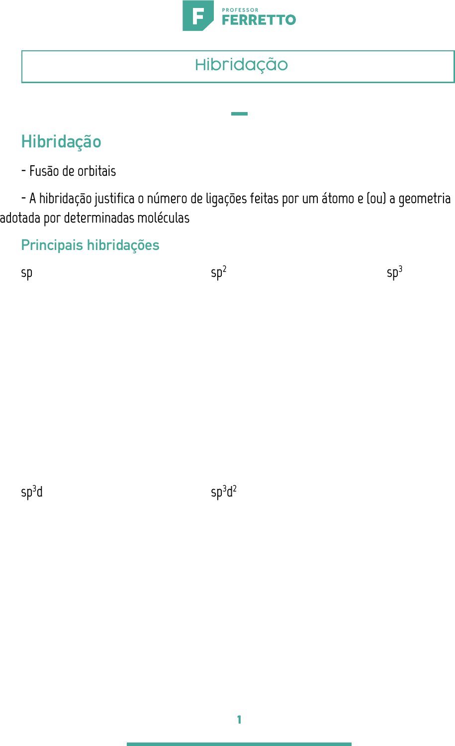 1 Hibridação - Fusão de orbitais - A hibridação justifica o número de ligações feitas por um átomo e (ou) a geometria adotada por determinadas moléculas Principais hibridações sp sp2 sp3 sp3d sp3d2 Hibridação 2 Regra prática Número de orbitais híbridos = Número de polos de repulsão 2 polos 3 polos 4 polos 5 polos 6 polos Exemplos 3 Entendendo a hibridação Exemplo 1 4Be na molécula BeH2 Exemplo 2 5B Na molécula BF3 4 Exemplo 3 6C na molécula CH4 Exemplo 4 15P na molécula PCl5 5 Exemplo 5 16S na molécula SF6 Questão 1 (Enem) O grafeno é uma forma alotrópica do carbono constituído por uma folha planar (arranjo bidimensional) de átomos de carbono compactados e com a espessura de apenas um átomo. Sua estrutura é hexagonal, conforme a figura. Nesse arranjo, os átomos de carbono possuem hibridação a) sp de geometria linear. b) sp2 de geometria trigonal planar. c) sp3 alternados com carbonos com hibridação sp de geometria linear. d) sp3d de geometria planar. e) sp3d2 com geometria hexagonal planar.