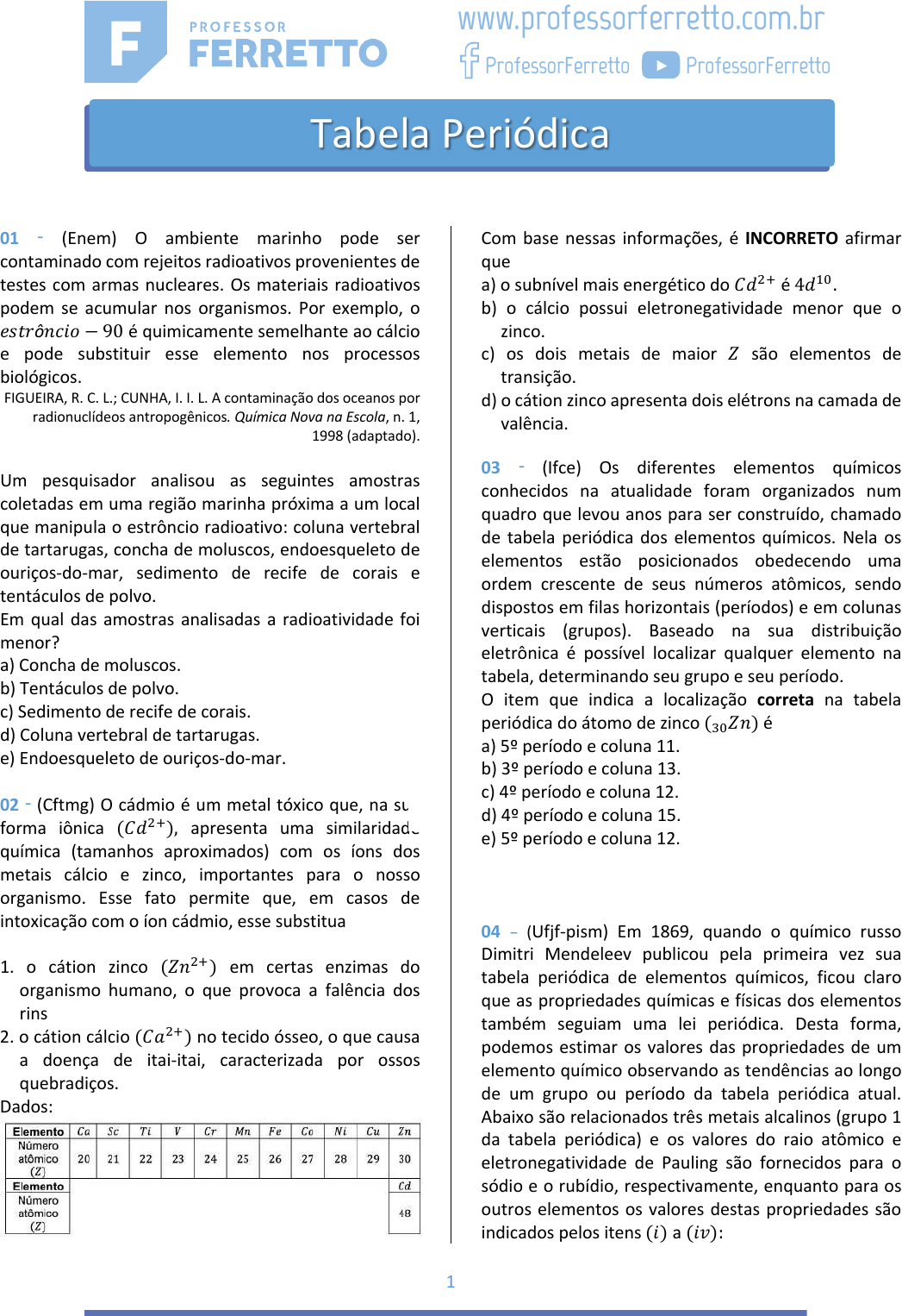1 01 - (Enem) O ambiente marinho pode ser contaminado com rejeitos radioativos provenientes de testes com armas nucleares. Os materiais radioativos podem se acumular nos organismos. Por exemplo, o 𝑒𝑠𝑡𝑟ô𝑛𝑐𝑖𝑜 − 90 é quimicamente semelhante ao cálcio e pode substituir esse elemento nos processos biológicos. FIGUEIRA, R. C. L.; CUNHA, I. I. L. A contaminação dos oceanos por radionuclídeos antropogênicos. Química Nova na Escola, n. 1, 1998 (adaptado). Um pesquisador analisou as seguintes amostras coletadas em uma região marinha próxima a um local que manipula o estrôncio radioativo: coluna vertebral de tartarugas, concha de moluscos, endoesqueleto de ouriços-do-mar, sedimento de recife de corais e tentáculos de polvo. Em qual das amostras analisadas a radioatividade foi menor? a) Concha de moluscos. b) Tentáculos de polvo. c) Sedimento de recife de corais. d) Coluna vertebral de tartarugas. e) Endoesqueleto de ouriços-do-mar. 02 - (Cftmg) O cádmio é um metal tóxico que, na sua forma iônica (𝐶𝑑/0), apresenta uma similaridade química (tamanhos aproximados) com os íons dos metais cálcio e zinco, importantes para o nosso organismo. Esse fato permite que, em casos de intoxicação com o íon cádmio, esse substitua 1. o cátion zinco (𝑍𝑛/0) em certas enzimas do organismo humano, o que provoca a falência dos rins 2. o cátion cálcio (𝐶𝑎/0) no tecido ósseo, o que causa a doença de itai-itai, caracterizada por ossos quebradiços. Dados: Com base nessas informações, é INCORRETO afirmar que a) o subnível mais energético do 𝐶𝑑/0 é 4𝑑67. b) o cálcio possui eletronegatividade menor que o zinco. c) os dois metais de maior 𝑍 são elementos de transição. d) o cátion zinco apresenta dois elétrons na camada de valência. 03 - (Ifce) Os diferentes elementos químicos conhecidos na atualidade foram organizados num quadro que levou anos para ser construído, chamado de tabela periódica dos elementos químicos. Nela os elementos estão posicionados obedecendo uma ordem crescente de seus números atômicos, sendo dispostos em filas horizontais (períodos) e em colunas verticais (grupos). Baseado na sua distribuição eletrônica é possível localizar qualquer elemento na tabela, determinando seu grupo e seu período. O item que indica a localização correta na tabela periódica do átomo de zinco (97𝑍𝑛) é a) 5º período e coluna 11. b) 3º período e coluna 13. c) 4º período e coluna 12. d) 4º período e coluna 15. e) 5º período e coluna 12. 04 – (Ufjf-pism) Em 1869, quando o químico russo Dimitri Mendeleev publicou pela primeira vez sua tabela periódica de elementos químicos, ficou claro que as propriedades químicas e físicas dos elementos também seguiam uma lei periódica. Desta forma, podemos estimar os valores das propriedades de um elemento químico observando as tendências ao longo de um grupo ou período da tabela periódica atual. Abaixo são relacionados três metais alcalinos (grupo 1 da tabela periódica) e os valores do raio atômico e eletronegatividade de Pauling são fornecidos para o sódio e o rubídio, respectivamente, enquanto para os outros elementos os valores destas propriedades são indicados pelos itens (𝑖) a (𝑖𝑣): www.professorferretto.com.br ProfessorFerretto ProfessorFerretto Tabela Periódica 2 Elemento Raio atômico (𝑛𝑚) Eletronegatividade de Pauling 𝑁𝑎 0,190 (𝑖𝑖𝑖) 𝐾 (𝑖) (𝑖𝑣) 𝑅𝑏 (𝑖𝑖) 0,8 Considerando a lei periódica, assinale a alternativa que contém os valores corretos dos itens (𝑖); (𝑖𝑖); (𝑖𝑖𝑖) e (𝑖𝑣), respectivamente: a) 0,149; 0,095; 0,6 e 0,7 b) 0,235; 0,280; 1,0 e 0,9 c) 0,149; 0,095; 1,0 e 0,9 d) 0,235; 0,280; 0,6 e 0,7 e) 0,149; 0,280; 0,6 e 0,7 05 – (Uefs) Elemento químico 1ª E.I. 2ª E.I 3ª E.I. 𝑋 520 7.297 11.810 𝑌 900 1.757 14.840 A energia de ionização é uma propriedade periódica muito importante, pois está relacionada com a tendência que um átomo neutro possui de formar um cátion. Observe na tabela os valores de energias de ionização (E.I. em LM NOP ) para determinados elementos químicos. Com base nas variações das energias de ionização apresentadas na tabela, analise as afirmativas e marque com V as verdadeiras e com F, as falsas. ( ) 𝑋 é um metal e possui 3 elétrons na camada de valência. ( ) 𝑌 é um metal e possui 2 elétrons na camada de valência. ( ) 𝑋 pertence ao grupo 1 e 𝑌, ao grupo 2 da Tabela Periódica, formando com o enxofre substâncias de fórmula molecular, respectivamente, 𝑋/𝑆 e 𝑌𝑆. ( ) Se 𝑋 e 𝑌 pertencem ao mesmo período da Tabela Periódica, com ambos no estado neutro, 𝑌 possui maior raio atômico que 𝑋. A alternativa que contém a sequência correta, de cima para baixo, é a a) V – V – F – F b) V – F – V – F c) F – V – F – V d) F – F – V – V e) F – V – V – F 06 – (Ifsul) Com relação à classificação periódica dos elementos, afirma-se que o a) mercúrio é um ametal líquido à temperatura ambiente. b) hidrogênio é um metal alcalino localizado na 1ª coluna. c) potássio é o elemento mais eletropositivo do 4º período. d) oxigênio é o elemento menos eletronegativo da 16ª coluna. 07 – (Upf) Em 1869, Mendeleev ordenou os elementos em função de suas massas atômicas crescentes, respeitando suas propriedades químicas. O trabalho foi tão importante que ele chegou a prever a existência de elementos que ainda não haviam sido descobertos. Em um comunicado à imprensa no dia 30 de dezembro de 2015, a União Internacional de Química Pura e Aplicada (Iupac) e a União Internacional de Física Pura e Aplicada (Iupap) reconheceram oficialmente a existência de quatro elementos químicos descobertos nos últimos anos. Os quatro novos elementos da Tabela Periódica foram produzidos artificialmente e denominados Nihonium (símbolo 𝑁ℎ e elemento 113), Mo