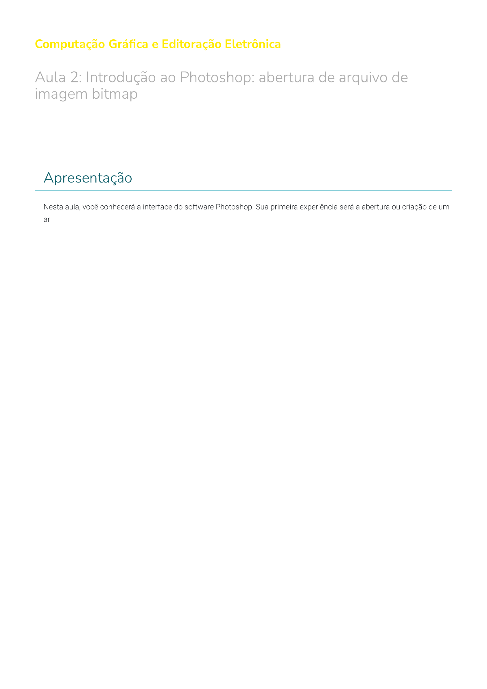 Computação Grá�ca e Editoração Eletrônica Aula 2: Introdução ao Photoshop: abertura de arquivo de imagem bitmap Apresentação Nesta aula, você conhecerá a interface do software Photoshop. Sua primeira experiência será a abertura ou criação de um arquivo e a de�nição e as cores da resolução da imagem em pixel. A partir da abertura do arquivo, vamos apresentar a área de trabalho do Photoshop, com seus menus e barras de ferramentas. Vamos convidar você a manipular imagens bitmap, operando com as ferramentas de retoque e correção, recorte, seleção de cores e pintura. Finalmente, você aprenderá sobre os formatos mais usuais, PSD e JPEG, para fechamento de arquivo, e saberá determinar sua escolha de acordo com o tipo de imagem, cores e arte-�nalização. Objetivos Reconhecer a interface grá�ca do Photoshop; Manipular imagens bitmap com seleção, recorte e pintura, além de ajustes de retoque e correção; Identi�car os formatos de arquivo. Palavras iniciais Nesta aula, vamos conhecer a interface do programa Photoshop que, desde outubro de 2018, passou para a versão CC (Creative Cloud), disponível para Microsoft Windows e Mac OS X. As áreas de trabalho dos programas Adobe Creative compartilham aparências e funcionalidades semelhantes, a �m de facilitar o trânsito dos arquivos entre os aplicativos. Esta característica facilitou também o aprendizado dos três programas grá�cos ensinados nesta disciplina. A tela inicial(home screen) do Photoshop CC oferece os botões Criar Novo e Abrir, além de tutoriais e as fotos LER, o arquivo de fotogra�as do Lightroom. Se sua versão é anterior ao CC, a abertura de arquivo é realizada em File (arquivo). Tela inicial do Photoshop CC. Abriremos uma fotogra�a em 300dpi e exercitaremos a correção básica da imagem, retoque e recorte com o uso da varinha mágica na caixa de ferramentas(toolbox). Conhecendo o programa Photoshop Interface do Photoshop A cada versão do Photoshop, são acrescentadas ferramentas e técnicas mais so�sticadas. Vimos que o CC (Creative Cloud) é uma versão capaz de trabalhar com aplicativos da nuvem (cloud computing) e está mais integrada com os outros programas Adobe, como Illustrator e InDesign. Shutterstock.com Nesta aula, vamos trabalhar com o Photoshop CS6, pois todas as ferramentas desta versão estão presentes no CC, bem como as vantagens operacionais como a recuperação automática do trabalho em caso de erros. Vejamos o que representa cada item indicado: Clique nos botões para ver as informações. Barra de menus exibe os menus Arquivo, Editar, Imagem, Camadas, Fontes e outros que dão acesso a vários comandos, ajustes e painéis. A - Barra de menus Barra de opções exibe as opções da ferramenta com a qual você está trabalhando no momento. B - Barra de opções Caixa de ferramentas contém as ferramentas para criar, corrigir, editar imagens fotográ�cas e ilustrações. Ferramentas semelhantes são agrupadas no mesmo ícone. C - Caixa de ferramentas Painéis (ou pranchetas) de opções e manipulação de Cores, Camadas, Propriedades e outros, que oferece diversos modos de trabalhar com as imagens. A lista completa de opções desta caixa, você encontra no Menu > Janela. D - Painéis Botão de exibição do painel com mais opções para pintura, fotogra�a e tipogra�a. E - Botão de exibição do painel Atenção! Aqui existe uma videoaula, acesso pelo conteúdo online Abrir arquivos e criar imagens Você poderá observar que a abertura de um arquivo é semelhante a todos os softwares de editoração eletrônica. Toda vez que iniciamos uma editoração, quer seja criando ou abrindo um arquivo já existente, surgirá uma janela de opções de formatos, dimensões, resolução e cores. Comentário Neste momento, as orientações ministradas na Aula 1 serão muito importantes para que você faça as escolhas corretas. Leia o texto a seguir com os procedimentos para a abertura de arquivos e a criação de imagens: Abertura de arquivo e criação de imagens Clique no botão acima. Abertura de arquivo e criação de imagens File open: importando uma imagem A abertura de um arquivo é semelhante a todos os softwares de editoração eletrônica. Na barra de menus, selecione Arquivo > Abrir (File>Open) para abrir imagens existentes. A partir dessa ação, uma janela com as opções de pastas se abrirá e você deverá escolher o arquivo — uma imagem ou um trabalho em PSD já iniciado — a ser trabalhado. Ao clicar no arquivo, o botão Abrir �cará disponível para ser clicado. A imagem aparecerá na área de trabalho para ser manipulada. Certi�que-se de que a resolução da imagem está adequada para o seu projeto. A imagem se abrirá na área de trabalho. Observe, na imagem que você abriu na coluna à direita, a paleta Camada. A primeira camada é aberta automaticamente e é denominada background, camada de fundo ou camada inferior. Camada de fundo - A camada inferior na paleta Camadas, a camada de fundo, está sempre bloqueada, por medida de proteção, o que signi�ca que não é possível alterar a ordem de empilhamento, o modo de mesclagem ou a opacidade. No entanto, você pode converter a camada de fundo em uma camada regular, se for necessário. File new: formatação do arquivo Dica Importante: devemos trabalhar a imagem em arquivo JPG, PNG ou outra extensão de imagem, com a resolução de 300 DPI — 300 pixels/ polegada — no formato �nal do projeto (dimensões: largura e altura). Para abrir um novo arquivo, usando o atalho no teclado: (Mac)Cmd>N (Windows)Ctrl>N Ou clique em Arquivo > Novo (File>New). Quando abrimos um novo arquivo, também surge uma janela com opções para a formatação do trabalho. [Name] Neste local você nomeará o seu trabalho. [Preset] Prede�nição de documentos em branco - Você pode escolher documentos em branco com dimensões e con�guração prede�nidas. As prede�nições de documentos em branco apres