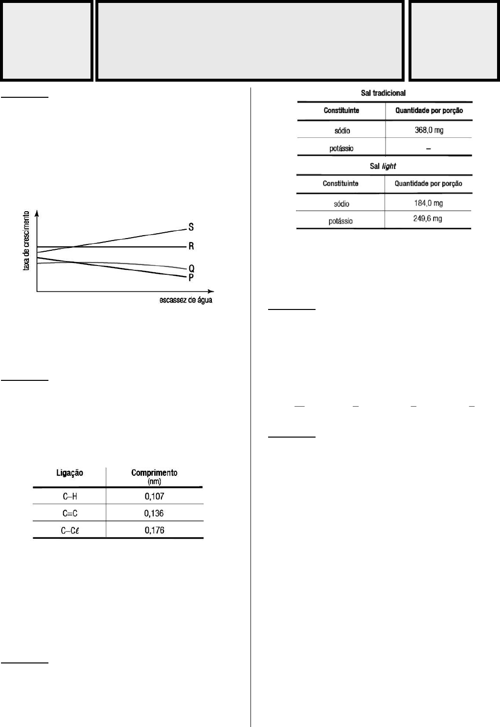UERJ – VESTIBULAR 2010 TELEGRAM: @CANALTROVAO FÍSICA – 1a FASE – 2 EQ – RAFAEL TROVÃO Questão 22 Uricotélicos são animais que excretam nitrogênio através de sua incorporação em ácido úrico, substância pouco solúvel em água. Já os mamíferos excretam o nitrogênio sob a forma de ureia, composto muito solúvel em água. Considere a hipótese de que, em algum momento do futuro da Terra, a água se torne progressivamente escassa. No gráfico abaixo, as curvas representam as taxas de crescimento populacional de diversos grupos animais em função da crescente dificuldade de obtenção de água. Com base no conceito de seleção natural, a curva que poderia representar os animais uricotélicos é a identificada por: a) P b) Q c) R d) S Questão 23 A nanotecnologia surgiu na segunda metade do século XX, possibilitando estimar o tamanho de moléculas e o comprimento de ligações químicas em nanômetros (nm), sendo 1 nm igual a 910 m− . A tabela a seguir apresenta os comprimentos das ligações químicas presentes na molécula do cis-1,2-dicloroeteno: Admita que: — os núcleos atômicos têm dimensões desprezíveis; — os comprimentos das ligações correspondem à distância entre os núcleos. A distância, em nanômetros, entre os dois núcleos de hidrogênio na molécula do cis-1,2-dicloroeteno equivale a: a) 0,214 b) 0,243 c) 0,272 d) 0,283 Questão 24 Para evitar a ingestão de quantidades excessivas de sódio, foi desenvolvido o sal light, no qual parte do cloreto de sódio é substituído por cloreto de potássio. Os quadros abaixo comparam as informações nutricionais para porções iguais de dois tipos de sal: Além desses cloretos, não há outros compostos de cloro, sódio ou potássio nos sais. A redução percentual do íon cloro no sal light em relação ao sal tradicional é igual a: a) 10% b) 20% c) 40% d) 50% Questão 25 Na espécie humana, a calvície - uma herança influenciada pelo sexo - é determinada por um alelo dominante nos homens (C), mas recessivo nas mulheres (c). Considere um casal, ambos heterozigotos para a calvície, que tenha um filho e uma filha. Com base apenas nos genótipos do casal, a probabilidade de que seus dois filhos sejam calvos é de: a) 3 16 b) 3 4 c) 1 8 d) 1 2 Questão 26 O aumento da concentração de CO2 na atmosfera intensifica a ação fertilizante desse gás, o que acelera o crescimento de diversas plantas. Na natureza, no entanto, há fatores limitantes dessa ação. Em um experimento, duas pequenas mudas de milho foram plantadas em solo arenoso, sob idênticas condições de temperatura e de taxa de iluminação, irrigadas diariamente com um pequeno volume de água comum, igual para ambas. As plantas foram mantidas em ar atmosférico contendo CO2 nas seguintes proporções: — planta 11: 340 mg L− — planta 12 : 680 mg L− Escolheram-se duas folhas, uma de cada muda, e suas massas foram medidas durante 30 dias. Observe o gráfico a seguir, no qual duas das curvas representam os resultados dessa medição: A curva que representa o desenvolvimento da planta 2 e o fator cuja deficiência limitou a ação fertilizante do 2CO são: a) W – sais minerais b) X – oxigênio c) Y – aminoácidos d) Z – luz Questão 27 Um objeto é deslocado em um plano sob a ação de uma força de intensidade igual a 5 N , percorrendo em linha reta uma distância igual a 2 m . Considere a medida do ângulo entre a força e o deslocamento do objeto igual a o15 , e T o trabalho realizado por essa força. Uma expressão que pode ser utilizada para o cálculo desse trabalho, em joules, é T 5 2 sen= . Nessa expressão, equivale, em graus, a: a) 15 b) 30 c) 45 d) 75 Questão 28 Substâncias com ligações duplas entre carbonos reagem com o íon permanganato, de cor violeta, em meio básico ou neutro, formando um álcool e o dióxido de manganês, de cor marrom. Esse processo é usado, por exemplo, na identificação do limoneno, um dos constituintes do aroma de frutas cítricas, conforme esquematizado na equação química simplificada: A mudança da cor violeta para a cor marrom, em presença do íon permanganato, também se verifica com o seguinte composto orgânico: a) 3-etil-2-hexeno b) 3-cloro-octano c) 2-metilpentanal d) 2-bromo-3-heptanona Questão 29 Uma pessoa submetida a uma determinada dieta alimentar deseja ingerir, no máximo, 500 kcal em fatias de uma torta. Observe que: — valor calórico é a quantidade de energia capaz de produzir trabalho, liberada pelo metabolismo de uma certa quantidade de alimento ingerido; — os valores calóricos aproximados de carboidratos, lipídios e proteínas são, respectivamente, 4, 9 e 4 kcal/g ; — a torta contém, ao todo, 50% de carboidratos, 15% de lipídios e 35% de proteínas; — cada fatia da torta tem massa de 50 g e todas são iguais e homogêneas. Para obedecer à dieta, a maior quantidade de fatias dessa torta que a pessoa pode comer corresponde a: a) 1 b) 2 c) 3 d) 4 Questão 30 A velocidade de uma reação enzimática corresponde à razão entre quantidade de produto formado e tempo decorrido. Essa velocidade depende, entre outros fatores, da temperatura de incubação da enzima. Acima de uma determinada temperatura, porém, a enzima sofre desnaturação. Considere um experimento no qual foi medida a velocidade máxima de uma reação enzimática em duas diferentes temperaturas. Observe a tabela: Para cada temperatura calculou-se a taxa de desnaturação da enzima, definida como a queda da maxV da reação por minuto de incubação. Se 1D é a taxa de desnaturação da enzima a o45 C e 2D a taxa de desnaturação a o50 C , a razão 1 2 D D é: a) 0,5 b) 1,0 c) 2,5 d) 4,0 Questão 31 Os principais elementos metálicos presentes no corpo humano são cálcio, sódio, potássio e magnésio. Dentre esses elementos, o de maior raio atômico é encontrado, em maior quantidade, no seguinte fluido orgânico: a) biliar b) intersticial c) plasmático d) intracelular utilize a