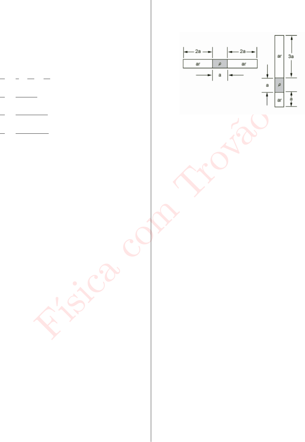 Fís ica com Tr ovã o 1. (ITA - 1971)Dois recipientes de volumes V1 e V2 contêm a mesma quantidade de um mesmo gás a pressões e tem- peraturas absolutas p1 e p2 , T1 e T2 , respectivamente. Os dois recipientes são ligados entre si por uma torneira, que em dado momento é aberta, oferecendo ao gás o volume V1 + V2 . Supondo que os dois recipientes constituam um sistema isolado, mostre que, após o novo equilíbrio, com temperatura e pressão T e p: (a) T p = 1 2 ( T1 p1 + T2 p2 ) (b) T p = T1 + T2 p1 + p2 (c) T p = T1 + T2 (p1 + p2)/2 (d) T p = (T1 + T2)/2 p1 + p2 (e) nenhuma das expressões acima é correta. 2. (ITA - 1972) A pressão do vapor do éter etílico é de 760 cmHg à temperatura de 35°C. Colocando-se certa quanti- dade desse líquido na câmara evacuada de um barômetro de mercúrio de 1,00 m de comprimento e elevando-se a temperatura ambiente a 35°C, nota-se que a coluna de mercúrio: (a) sobe de 24 cm. (b) permanece inalterada. (c) desce a 24 cm do nível zero. (d) desce a zero. (e) desce a uma altura que é função da quantidade de éter introduzida. 3. (ITA - 1974) A umidade relativa num ambiente gasoso (atmosfera, por exemplo) é definida como: (a) relação entre a pressão de vapor de água existente e a pressão ambiente. (b) relação entre o volume ocupado pelo vapor de água e o volume total do ambiente. (c) relação entre a pressão de vapor de água existente à temperatura ambiente e a pressão de vapor de água a 0 °C. (d) relação entre a pressão de vapor de água existente e a pressão de vapor saturante à mesma temperatura. (e) nenhuma das afirmações acima é verdadeira. 4. (ITA - 1986) Um tubo capilar de comprimento 5a é fechado em ambas as extremidades. Ele contém ar seco que preenche o espaço no tubo não ocupado por uma col- una de mercúrio de massa específica ρ e comprimento a. Quando o tubo está na posição horizontal, as colunas de ar seco medem 2a cada. Levando-se lentamente o tubo à posição vertical, as colunas de ar têm comprimentos a e 3a. Nessas condições, a pressão no tubo capilar, quando em posição horizontal, é: (a) 3gρa/4 (b) 2gρa/5 (c) 2gρa/3 (d) 4gρa/3 (e) 4gρa/5 5. (ITA - 1986)Um reservatório de 30 litros contém gás nitrogênio diatômico, à temperatura ambiente de 20 °C. Seu medidor de pressão indica uma pressão de 3,00 at- mosferas. A válvula do reservatório é aberta momen- taneamente e uma certa quantidade de gás escapa para o meio ambiente. Fechada a válvula, o gás atinge nova- mente a temperatura ambiente. O medidor de pressão do reservatório indica agora uma pressão de 2,40 atmos- feras. Quantos gramas de nitrogênio, aproximadamente, escaparam? (a) 10,5 g. (b) 31 g. (c) 15 g. (d) 3 g. (e) 21 g. Observações: 1. O peso atômico do nitrogênio é igual a 14. 2. Se necessário, utilizar os seguintes valores para: Constante universal para os gases: 8,31 joules/mol · K ou 0,082 litros · atm/mol · K. Número de Avogadro: 6,02 · 1023 moléculas/mol. 6. (ITA - 1986) Uma pessoa respira por minuto 8 litros de ar a 18 °C e o rejeita a 37 °C. Admitindo que o ar se comporta como um gás diatômico de massa molecular equivalente a 29, calcular a quantidade aproximada de calor fornecida pelo aquecimento do ar em 24 horas. (a) 2,69 kJ. Fís ica com Tr ovã o (b) 195 kJ. (c) 272 kJ. (d) 552 kJ. (e) nenhum dos valores acima. Observações: 1. Desprezar aqui toda mudança de composição entre o ar inspirado e o ar expirado e admitir a pressão constante e igual a 1 atm. 2. A massa específica do ar a 18°C sob pressão de 1 atm vale 1,24 kg · m−3 . 3. Se necessário, utilizar os seguintes valores para: Constante universal dos gases: 8,31 joules/mol · K. Vol- ume de um mol para gás ideal: 22,4 litros(CNTP). Equiv- alente mecânico do calor: 4,18 joules/caloria. 7. (ITA - 1988)Calcular a massa de hélio (massa molar 4,0), contida num balão, sabendo-se que o gás ocupa um volume igual a 5,0 m3 e está a uma temperatura de -23 °C e a uma pressão de 30 cmHg. (a) 1,86 g. (b) 46 g. (c) 96 g. (d) 186 g. (e) 385 g. 8. (ITA - 1991)Um recipiente continha inicialmente 10,0 kg de gás sob pressão de 10 · 106 N/m2 . Uma quantidade m de gás saiu do recipiente sem que a temperatura variasse. Determine m sabendo que a pressão caiu para 2,5 · 106 N/m2. (a) 2,5 kg. (b) 5,0 kg. (c) 7,5 kg. (d) 4,0 kg. (e) nenhuma das anteriores. 9. (ITA - 1993)Dois balões de vidro de volumes iguais es- tão ligados por meio de um tubo de volume desprezível e ambos contêm hidrogênio a 0 °C. Eles estão a uma pressão de 1,013 · 105 Pa. Qual será a pressão do gás se um dos bulbos for imerso em água a 100 °C e outro for mantido a -40 °C? (a) a pressão permanece a mesma. (b) 1,06 · 105 Pa. (c) 2,32 · 105 Pa. (d) 1,25 · 105 Pa. (e) 1,20 · 105 Pa. 10. (ITA - 1996)Considere as seguintes afirmativas: I. Um copo de água gelada apresenta gotículas de água em sua volta porque a temperatura da parede do copo é menor que a temperatura de orvalho do ar ambiente. II. A névoa (chamada por alguns de vapor) que sai do bico de uma chaleira com água quente é tanto mais perceptível quanto menor for a temperatura ambiente. III. Ao se fechar um freezer, se a sua vedação fosse per- feita, não permitindo a entrada e saída de ar do seu in- terior, a pressão interna ficaria inferior à pressão do ar ambiente. (a) todas são corretas. (b) somente I e II são corretas. (c) somente II e III são corretas. (d) somente I e III são corretas. (e) nenhuma delas é correta. 11. (ITA - 1996)Uma lâmpada elétrica de filamento contém certa quantidade de um gás inerte. Quando a lâmpada está funcionando, o gás apresenta uma temperatura de 125 °C e a sua pressão é igual à pressão atmosférica. I. Supondo que o volume da lâmpada varie de forma apre- ciável, a pressão do gás, à temperatura de 25 °C, é de aproximadamente ¾ da pressão atmosférica. II. A presença do gás inerte (no lugar do vácuo) ajuda a
