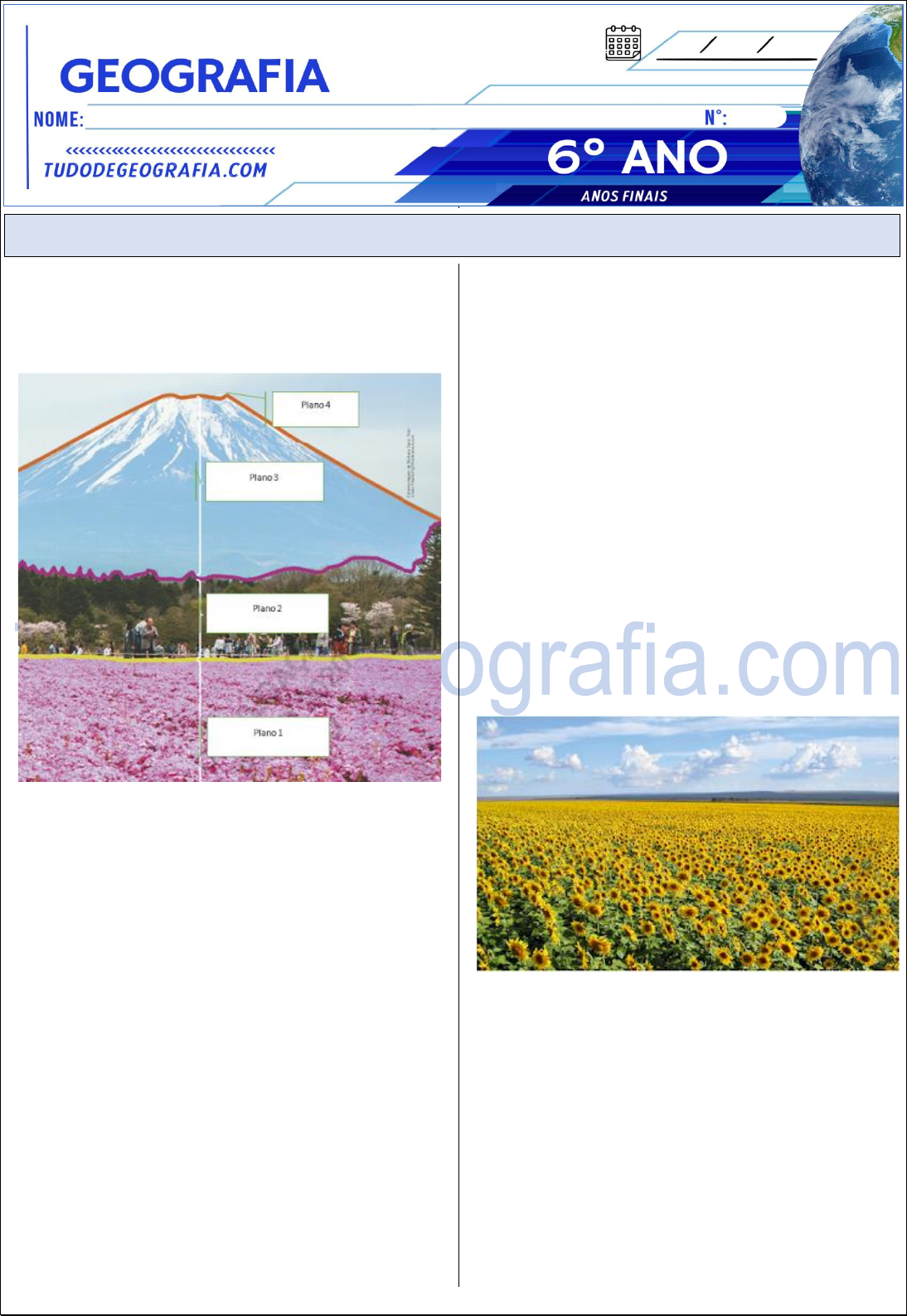tudodegeografia.com / Youtube: diegojulioconrado / PROF. DIEGO ARAGÃO 1- Observe a imagem e descreva que elementos da paisagem você observa em cada plano? ______________________________________ ______________________________________ ______________________________________ ______________________________________ ______________________________________ 2- Escolha um lugar que você frequenta em seu dia a dia. Elabore um texto descrevendo, no caderno, as características desse lugar e o que você costuma fazer nele. __________________________________________ __________________________________________ __________________________________________ __________________________________________ __________________________________________ __________________________________________ 3- Em sua opinião, é importante estudar as paisagens? Por quê? __________________________________________ __________________________________________ __________________________________________ 4- Com base no que você estudou, o que torna as paisagens únicas? __________________________________________ __________________________________________ __________________________________________ 5- Como é a paisagem do lugar onde você vive? Descreva os elementos culturais e naturais que nela contém. __________________________________________ __________________________________________ __________________________________________ 6- Que argumento você utilizaria para explicar a uma pessoa que a imagem abaixo não retrata uma paisagem natural e sim uma paisagem cultural? ______________________________________ ______________________________________ ______________________________________ ATIVIDADE 7 Objeto de Aprendizagem: Conceitos Geográficos Habilidades da BNCC: EF06GE01, EF06GE02, EF06GE06, EF06GE07, EF06GE09 e EF06GE11 tudodegeografia.com / Youtube: diegojulioconrado / PROF. DIEGO ARAGÃO 1- Plano 1: Canteiro de flores. Os elementos são naturais, porém, a paisagem é cultural. Plano 2: notamos a presença de pessoas e vegetação. Plano 3: Uma montanha e seu pico coberto por neve. Plano 4: O céu, a linha do horizonte. 2- Resposta pessoal. 3- Com o estudo das paisagens podemos compreender fenômenos naturais, sociais e as transformações que ocorreram nos lugares onde vivemos e em outros lugares do mundo. É possível outra resposta com a mesma linha de raciocínio. 4- Resposta pessoal. 5- Resposta pessoal. 6- Apesar os elementos que a formem sejam naturais, eles foram cultivados pelo trabalho humano, ou seja, resultado do trabalho humano e, por isso, constituem uma paisagem cultural. GABARITO