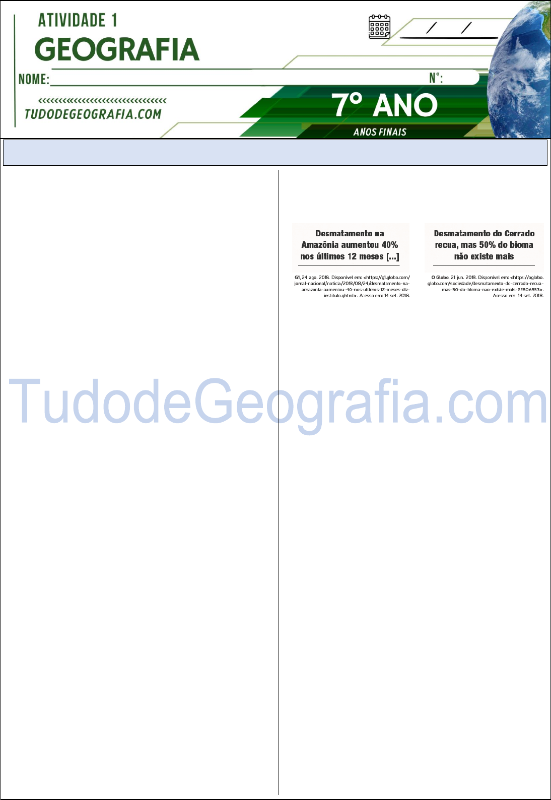 tudodegeografia.com / Youtube: diegojulioconrado / PROF. DIEGO ARAGÃO 1- De acordo com o que você estudou, defina no caderno o que é uma região. ______________________________________ ______________________________________ 2- Retome a proposta de regionalização do IBGE e indique em qual região está inserido o estado onde você mora. ______________________________________ 3- Descreva no caderno uma regionalização que você conhece, por exemplo, próximo ao lugar onde você mora, ou que envolva o seu município. ______________________________________ ______________________________________ ______________________________________ 4- As afirmações a seguir apresentam algumas informações incorretas sobre as regiões geoeconômicas. Identifique- as e reescreva-as corretamente no caderno. I- A divisão regional do território brasileiro em regiões geoeconômicas leva em consideração os limites político- administrativos dos estados. ______________________________________ ______________________________________ II- A região Amazônica possui uma ampla rede de serviços e a maior concentração industrial entre os três grandes complexos regionais. ______________________________________ ______________________________________ 5- Leia atentamente as manchetes de jornal abaixo. a) As manchetes acima tratam de um assunto em comum. Qual é esse assunto? ______________________________________ ______________________________________ b) De acordo com o que você estudou, descreva as principais causas da devastação que vem ocorrendo com cada uma das formações vegetais descritas nas manchetes. ______________________________________ ______________________________________ ______________________________________ 6- Leia com atenção o texto abaixo. Em seguida, responda às questões no caderno. A região do Vale do Paraíba A região do Vale do Paraíba está localizada entre a Serra do Mar e a Serra da Mantiqueira, ao longo do curso do rio Paraíba do Sul, que nasce no estado de São Paulo e tem sua foz localizada no estado do Rio de Janeiro. No século XVIII, essa região foi ocupada por engenhos de produção de açúcar e lavouras de subsistência. No século XIX, ela se tornou um grande polo agrícola de café em nosso país. Atualmente, essa região é cortada pela Rodovia Presidente Dutra, uma das mais movimentadas do país e que liga as duas maiores cidades Objeto de Aprendizagem: Regiões Brasileiras Habilidades da BNCC: EF07GE02 / EF07GE03 / EF07GE05 / EF07GE06 / EF07GE09 / EF07GE11 ATIVIDADE 1 tudodegeografia.com / Youtube: diegojulioconrado / PROF. DIEGO ARAGÃO brasileiras, São Paulo e Rio de Janeiro. A região do Vale do Paraíba é considerada uma região de grande importância econômica em nosso país, abrigando um grande número de indústrias e municípios importantes, como São José dos Campos, Taubaté e Volta Redonda. a) Qual região está sendo tratada no texto? ______________________________________ b) Quais são as características da região do Vale do Paraíba com relação: • à localização geográfica? • aos aspectos históricos? • aos aspectos econômicos atuais? ______________________________________ ______________________________________ ______________________________________ ______________________________________ ______________________________________ 7- Encontre no caça palavras algumas características que simbolizam o Brasil. tudodegeografia.com / Youtube: diegojulioconrado / PROF. DIEGO ARAGÃO 1ª QUESTÃO Resposta: Região é uma porção da superfície terrestre que apresenta características semelhantes e que, por isso, se diferencia das áreas vizinhas. 2ª QUESTÃO Resposta pessoal. 3ª QUESTÃO Resposta pessoal. 4ª QUESTÃO I- A divisão regional do território brasileiro em regiões geoeconômicas não leva em consideração os limites político-administrativos dos estados. II- A região Centro-Sul possui uma ampla rede de serviços e a maior concentração industrial entre os três grandes complexos regionais. 5ª QUESTÃO a) O desmatamento das formações vegetais naturais do nosso país. b) O avanço das atividades agropecuárias e a fronteira agrícola nas regiões Norte e Centro- Oeste; o avanço da atividade industrial e extrativista, com ações de impacto destrutivo, como desmatamento e queimadas, assim como o crescimento das cidades. 6ª QUESTÃO a) A região do Vale do Paraíba b) Está localizada entre a Serra do Mar e a Serra da Mantiqueira, ao longo do curso do Rio Paraíba do Sul. No século XVIII, essa região foi ocupada por engenhos de produção de açúcar e lavouras de subsistência. No século XIX, a região tornou-se um grande polo agrícola de café em nosso país. Abriga um grande número de indústrias e municípios importantes, como São José dos Campos, Taubaté e Volta Redonda. 7ª QUESTÃO GABARITO tudodegeografia.com / Youtube: diegojulioconrado / PROF. DIEGO ARAGÃO