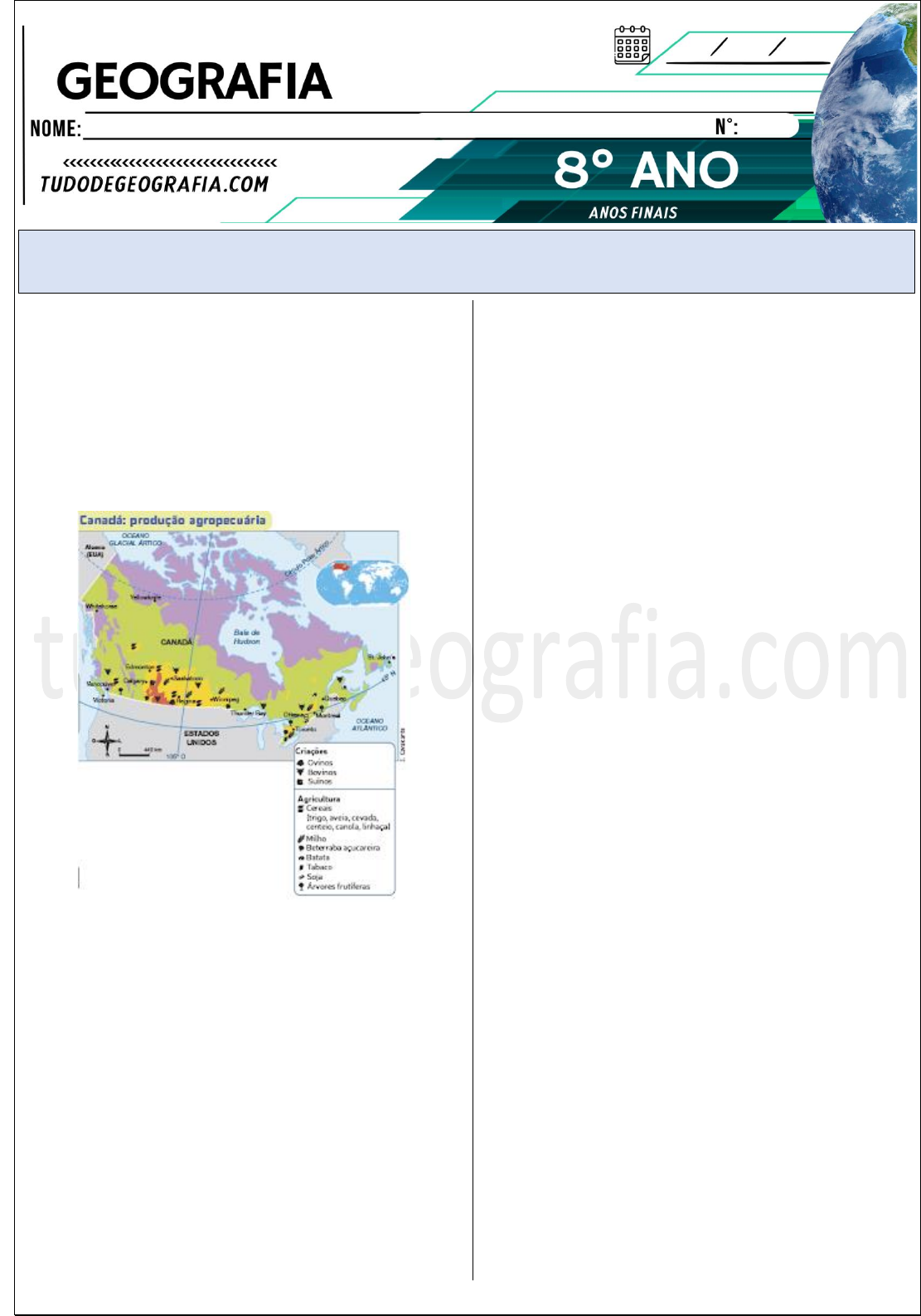 tudodegeografia.com / Youtube: diegojulioconrado / PROF. DIEGO ARAGÃO 1- Porque se pode afirmar que o Canadá é rico em recursos naturais? ______________________________________ ______________________________________ ______________________________________ 2- Observe o mapa abaixo. Quais os principais produtos agrícolas do Canadá? ______________________________________ ______________________________________ 3- Por que o setor agrícola canadense é marcado pela alta produtividade? ______________________________________ ______________________________________ ______________________________________ ______________________________________ 4- Descreva como as indústrias estão distribuídas pelo território canadense. ______________________________________ ______________________________________ ______________________________________ 5- Como se caracteriza o comércio canadense em relação aos produtos exportados? ______________________________________ ______________________________________ ______________________________________ ______________________________________ Objeto de Aprendizagem: Aspectos Gerais da América do Norte Anglo Saxônica – Canadá Habilidades da BNCC: EF08GE01 / EF08GE03 / EF08GE06 / EF08GE07 / EF08GE08 / EF08GE09 / EF08GE12 / EF08GE13 / EF08GE14 / EF08GE20 ATIVIDADE 13 tudodegeografia.com / Youtube: diegojulioconrado / PROF. DIEGO ARAGÃO 1- Com seu extenso território, o Canadá é rico em recursos naturais. O setor energético do país é impulsionado pelas reservas de gás natural, petróleo, carvão, além de abundantes fontes de urânio, zinco, cobre, ferro e madeira. Tal riqueza natural proporciona ao país um amplo quadro de exportações, o que fortalece sua balança comercial. O petróleo bruto e o gás natural são os principais produtos de exportação do Canadá no setor energético, sendo os Estados Unidos seu único comprador. A produção de carvão também tem crescido e atingido altos níveis, sendo mais da metade de sua produção industrial destinada à exportação, especialmente ao Japão, mas também a outros mercados, como Brasil, México e China. 2- Embora o trigo seja o principal produto cultivado e o mais exportado do país, existem extensas plantações de milho, aveia, cevada, centeio, canola e linhaça, além da criação de gado leiteiro e de corte. 3- O setor agropecuário canadense é marcado pela alta produtividade, resultado de elevados investimentos em tecnologias de produção, maquinários eficientes, pesquisas e programas que buscam beneficiar esse setor da economia. 4- Nota-se uma grande concentração industrial na região de Ottawa, Toronto, Montreal e Quebec, especialmente nos arredores dos Grandes Lagos, na região sudeste. Também estão espalhadas, em menor concentração, por outras regiões do país. 5- O comércio exterior canadense ocupa um espaço cada vez maior na economia nacional. Os principais produtos exportados são: veículos e peças automotivas, máquinas industriais, produtos de alta tecnologia, como aeronaves, eletroeletrônicos, equipamentos médicos, ópticos e de telecomunicações, carvão, óleo, petróleo, gás natural, madeira e celulose, metais e produtos agrícolas. GABARITO