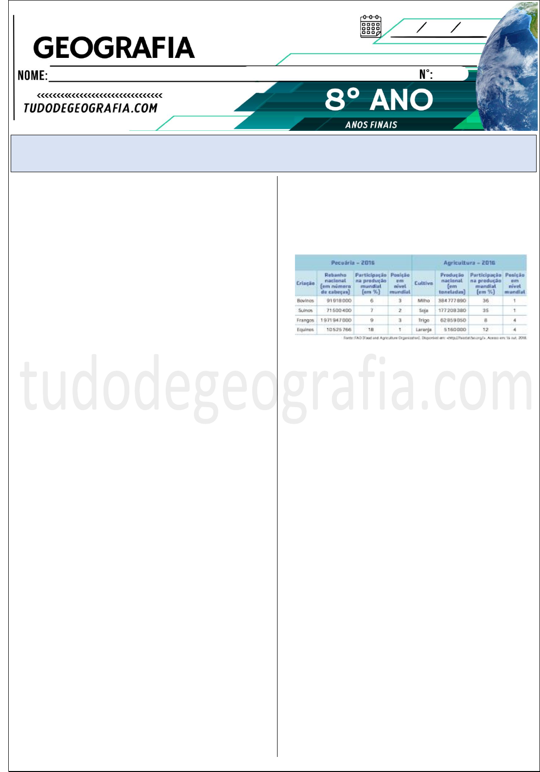 tudodegeografia.com / Youtube: diegojulioconrado / PROF. DIEGO ARAGÃO 1- 1- O subsolo dos Estados Unidos é muito rico em recursos minerais, com importantes reservas de carvão, urânio, cobre, zinco, ferro e prata. Mas o consumo desses minerais é bastante elevado. Que estratégias os EUA tem adotado para suprir sua demanda por recursos minerais? ______________________________________ ______________________________________ ______________________________________ ______________________________________ 2- Leia o texto. Subsídios Agrícolas As práticas protecionistas executadas por países desenvolvidos, como os Estados Unidos, tornaram-se um assunto muito discutido na atualidade. Essas práticas obrigam muitos países, sobretudo os subdesenvolvidos, a participarem em situação de desvantagem no comércio mundial. Uma das práticas de protecionismo se refere aos subsídios agrícolas que vários países desenvolvidos concedem a seus agricultores. Esses subsídios consistem no pagamento, por parte do governo, de uma parte do preço final dos produtos agropecuários aos produtores. Esses produtos passam, então, a ser negociados no mercado internacional a um preço menor do que o custo de sua produção, e, dessa maneira, concorrem com grande vantagem sobre os produtos de países subdesenvolvidos. Com base no texto, você sabe o que são subsídios? ______________________________________ ______________________________________ 3- Observe o gráfico s obre a produção agropecuária estadunidense em 2016 e responda: a) Qual o gênero agrícola mais produzido? ______________________________________ b) o que é mais produzido na pecuária? ______________________________________ 4- Caracterize a agropecuária estadunidense. ______________________________________ ______________________________________ ______________________________________ ______________________________________ 5- A agropecuária estadunidense ocupa quase metade de seu território e encontra-se organizada em regiões denominadas belts. Você sabe o que são belts? ______________________________________ ______________________________________ 6- Como se caracterizam os belts? ______________________________________ ______________________________________ ______________________________________ ______________________________________ Objeto de Aprendizagem: Aspectos Gerais da América do Norte Anglo Saxônica – Economia dos EUA Habilidades da BNCC: EF08GE01 / EF08GE03 / EF08GE06 / EF08GE07 / EF08GE08 / EF08GE09 / EF08GE12 / EF08GE13 / EF08GE14 / EF08GE20 ATIVIDADE 14 tudodegeografia.com / Youtube: diegojulioconrado / PROF. DIEGO ARAGÃO 1- Para suprir a demanda nacional, assim como ocorre com suas demais riquezas minerais e matérias-primas, o governo estadunidense passou a importar grandes quantidades desses recursos energéticos de outros países, sobretudo daqueles onde os preços são menores. Em 2017, por exemplo, os Estados Unidos importaram cerca de 13 milhões de barris de petróleo por dia. 2- Resposta pessoal. 3- a) Milho b) Frangos. 4- A produção agropecuária dos Estados Unidos está entre as maiores do mundo. A elevada produtividade agropecuária do país está atrelada ao emprego de modernas técnicas de produção, como inseminação artificial, uso intensivo de fertilizantes, agrotóxicos e sementes selecionadas. 5- Em português significa cinturões. Os belts correspondem a áreas especializadas em determinado tipo de cultivo ou criação. 6- Criação de um belt leva em consideração as condições climáticas, o tipo de relevo e o mercado consumidor das regiões onde será instalado. Embora os belts apresentem elevada produtividade depois de estabelecidos, em várias regiões, eles estão associados à ocorrência de problemas de desgaste do solo em razão, sobretudo, do desenvolvimento das monoculturas. GABARITO