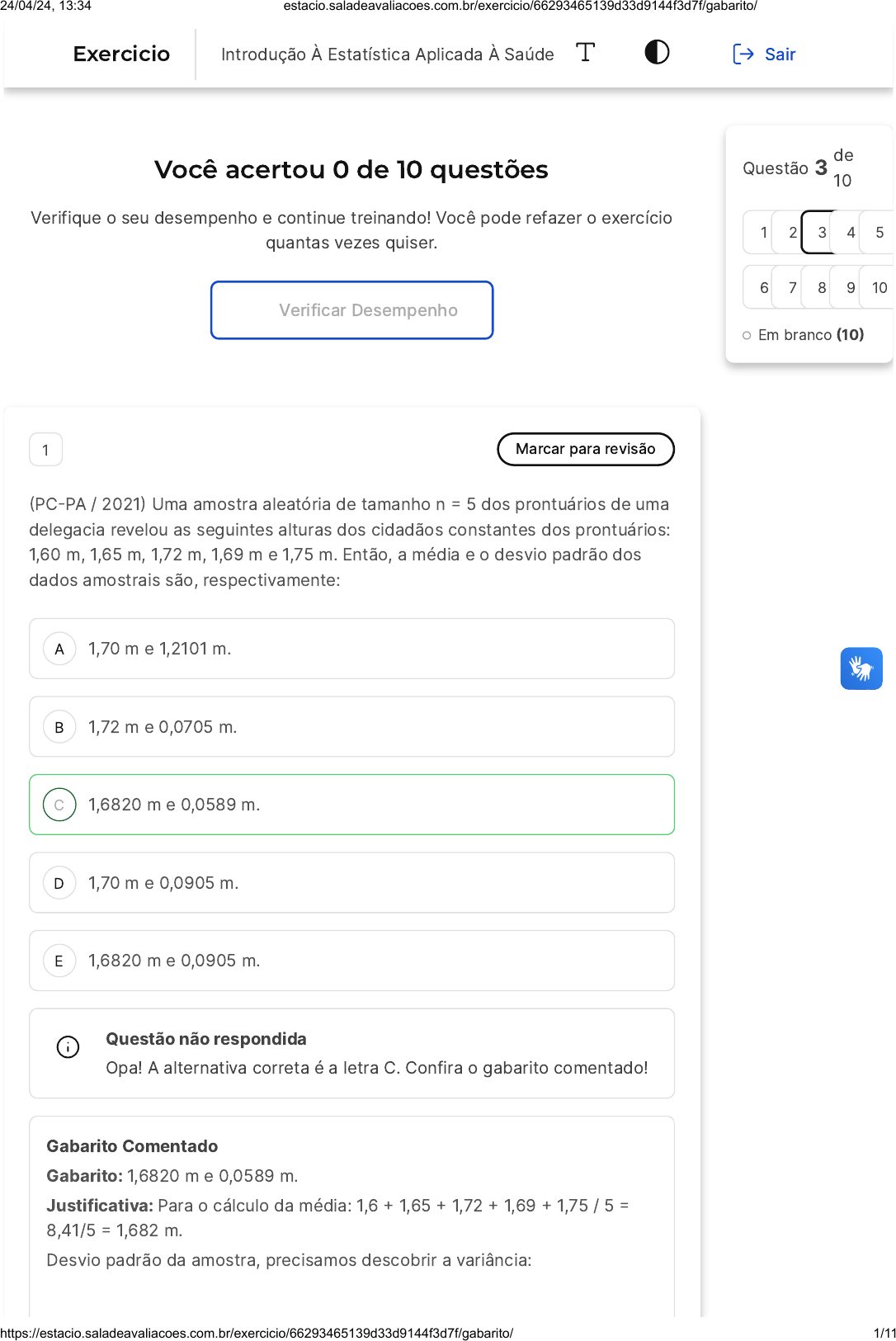Você acertou 0 de 10 questões Verifique o seu desempenho e continue treinando! Você pode refazer o exercício quantas vezes quiser. Verificar Desempenho A B C D E 1 Marcar para revisão �PC�PA / 2021� Uma amostra aleatória de tamanho n � 5 dos prontuários de uma delegacia revelou as seguintes alturas dos cidadãos constantes dos prontuários: 1,60 m, 1,65 m, 1,72 m, 1,69 m e 1,75 m. Então, a média e o desvio padrão dos dados amostrais são, respectivamente: 1,70 m e 1,2101 m. 1,72 m e 0,0705 m. 1,6820 m e 0,0589 m. 1,70 m e 0,0905 m. 1,6820 m e 0,0905 m. Questão não respondida Opa! A alternativa correta é a letra C. Confira o gabarito comentado! Gabarito Comentado Gabarito: 1,6820 m e 0,0589 m. Justificativa: Para o cálculo da média: 1,6 � 1,65 � 1,72 � 1,69 � 1,75 / 5 � 8,41/5 � 1,682 m. Desvio padrão da amostra, precisamos descobrir a variância: Questão 3 de 10 Em branco �10� 1 2 3 4 5 6 7 8 9 10 Exercicio Introdução À Estatística Aplicada À Saúde Sair 24/04/24, 13:34 estacio.saladeavaliacoes.com.br/exercicio/66293465139d33d9144f3d7f/gabarito/ https://estacio.saladeavaliacoes.com.br/exercicio/66293465139d33d9144f3d7f/gabarito/ 1/11 A B C D E Desvio padrão: S = √0, 00347 = 0, 0589 2 Marcar para revisão (adaptada CESPE / CEBRASPE � 2021 � SEDUC�AL � Professor � Matemática) Considere que, em uma turma de matemática, o professor tenha distribuído as notas da primeira avaliação dos alunos conforme a tabela apresentada a seguir: É correto afirmar que a média das notas dessa turma na primeira avaliação foi superior há: 5 4 3 2 1 Questão não respondida Opa! A alternativa correta é a letra A. Confira o gabarito comentado! Gabarito Comentado A média para dados agrupados é dado por: 24/04/24, 13:34 estacio.saladeavaliacoes.com.br/exercicio/66293465139d33d9144f3d7f/gabarito/ https://estacio.saladeavaliacoes.com.br/exercicio/66293465139d33d9144f3d7f/gabarito/ 2/11 A B C D E Assim, para calcular a média de uma frequência precisamos calcular o produto �Xi.FI�, ou seja, a frequência X Nota. A partir desse cálculo conseguimos calcular a média que é: 210 / 40 � 5,25, ou seja, superior a 5. 3 Marcar para revisão �SEFAZ/AP / 2010 � adaptada) Os dados a seguir são as quantidades de empregados de cinco pequenas empresas: 6, 5, 8, 5, 6. A Considerando que as empresas representam nossa população, a variância da quantidade de empregados dessas cinco empresas é igual a: 0,8 1,2 1,6 2,0 2,4 Questão não respondida Opa! A alternativa correta é a letra B. Confira o gabarito comentado! Gabarito Comentado Gabarito: 1,2 Justificativa: Para calcular a variância primeiro precisamos achar a média aritmética, na questão temos um conjunto de dados igual a 6, 5, 8, 5, 6. Total de empresas: 07 24/04/24, 13:34 estacio.saladeavaliacoes.com.br/exercicio/66293465139d33d9144f3d7f/gabarito/ https://estacio.saladeavaliacoes.com.br/exercicio/66293465139d33d9144f3d7f/gabarito/ 3/11 A B C D E Média: 6 � 5 � 8 � 5 � 6 /5 � 6. O cálculo da variância para população é dado pela fórmula: Então: 4 Marcar para revisão Variáveis são características de interesse em um estudo qualquer. Elas podem ser classificadas em variáveis quantitativas ou qualitativas, que por sua vez, são classificadas em quantitativas discretas ou contínuas e qualitativas nominais ou ordinais. Durante um estudo epidemiológico, foi feito um levantamento do peso dos bebês nascidos durante o ano de 2022, para apurar onde o atendimento pré-natal não está sendo feito da maneira adequada ou se há algum empecilho que dificulte o acesso das gestantes para tal naquela situação específica. Como é classificada a variável peso das crianças ao nascer? Quantitativa discreta Quantitativa contínua Qualitativa nominal Qualitativa ordinal Qualitativa contínua Questão não respondida Opa! A alternativa correta é a letra B. Confira o gabarito comentado! Gabarito Comentado O enunciado da questão se refere à classificação da variável "peso dos bebês ao nascer". Esta variável assume valores numéricos, o que a caracteriza como quantitativa. No entanto, o peso de um bebê não é algo 24/04/24, 13:34 estacio.saladeavaliacoes.com.br/exercicio/66293465139d33d9144f3d7f/gabarito/ https://estacio.saladeavaliacoes.com.br/exercicio/66293465139d33d9144f3d7f/gabarito/ 4/11 A B C D E que possa ser contado, mas sim medido, o que a classifica como uma variável quantitativa contínua. Em contraste, uma variável quantitativa discreta é aquela que pode ser contada, como o número de filhos ou o número de eleitores. Já as variáveis qualitativas são aquelas que não assumem valores numéricos, sendo classificadas como nominais quando não indicam ordem (por exemplo, sexo, estado civil) e ordinais quando indicam ordem (por exemplo, grau de instrução, faixa etária). 5 Marcar para revisão �UFSC / 2009� Dadas as informações abaixo: A partir dos dados apresentados na tabela, analise as afirmativas a seguir e assinale a alternativa CORRETA. O desvio padrão de X é menor do que o desvio padrão de Y. A mediana de X é maior do que a mediana de Y. As três séries X, Y e Z possuem a mesma variabilidade. O coeficiente de variação de X é maior do que o coeficiente de variação de Y. A moda de Z é maior do que a média de Z. Questão não respondida Opa! A alternativa correta é a letra A. Confira o gabarito comentado! Gabarito Comentado 24/04/24, 13:34 estacio.saladeavaliacoes.com.br/exercicio/66293465139d33d9144f3d7f/gabarito/ https://estacio.saladeavaliacoes.com.br/exercicio/66293465139d33d9144f3d7f/gabarito/ 5/11 Gabarito: O desvio padrão de X é menor do que o desvio padrão de Y. Justificativa: De acordo com a tabela os grupos não apresentam a mesma variabilidade, sendo , e . Além disso, pelos dados na tabela: X� 1, 2, 3 ,4, 5, 6, 7, 8, 9 Y� 1, 1, 4, 5, 5, 5, 6, 9, 9 Z� 3, 3, 5, 5, 5, 5, 5, 7, 7 Vemos que as medianas são iguais ( , e 