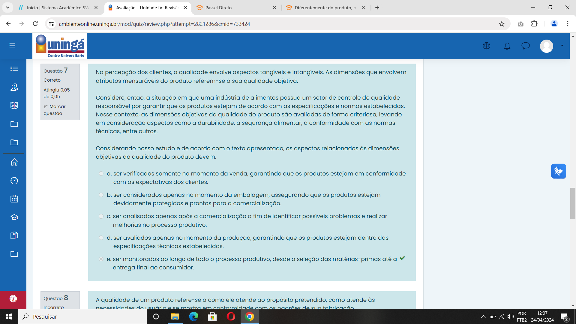 a. ser verificados somente no momento da venda, garantindo que os produtos estejam em conformidade com as expectativas dos clientes. b. ser considerados apenas no momento da embalagem, assegurando que os produtos estejam devidamente protegidos e prontos para a comercialização. c. ser analisados apenas após a comercialização a fim de identificar possíveis problemas e realizar melhorias no processo produtivo. d. ser avaliados apenas no momento da produção, garantindo que os produtos estejam dentro das especificações técnicas estabelecidas. e. ser monitorados ao longo de todo o processo produtivo, desde a seleção das matérias-primas até a entrega final ao consumidor.