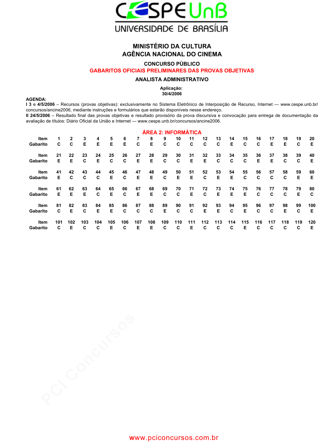 pcimarkpci MjgwNDowZDQxOmU2ZTU6NzIwMDpjNTc5OjZmZjI6OTgwNTo3N2I4:V2VkLCAyNCBBcHIgMjAyNCAxMzoyNToyMSAtMDMwMA== www.pciconcursos.com.br 30/4/2006 Aplicação: MINISTÉRIO DA CULTURA AGÊNCIA NACIONAL DO CINEMA CONCURSO PÚBLICO GABARITOS OFICIAIS PRELIMINARES DAS PROVAS OBJETIVAS ANALISTA ADMINISTRATIVO I 3 e 4/5/2006 – Recursos (provas objetivas): exclusivamente no Sistema Eletrônico de Interposição de Recurso, Internet — www.cespe.unb.br/ concursos/ancine2006, mediante instruções e formulários que estarão disponíveis nesse endereço. II 24/5/2006 – Resultado final das provas objetivas e resultado provisório da prova discursiva e convocação para entrega de documentação da avaliação de títulos: Diário Oficial da União e Internet — www.cespe.unb.br/concursos/ancine2006. AGENDA: 1 2 3 4 5 6 7 8 9 10 11 12 13 14 15 16 17 18 19 20 C C E E E E C E C C C C C E C C E E C E 21 22 23 24 25 26 27 28 29 30 31 32 33 34 35 36 37 38 39 40 E E C E C C E E C C E E C C C E E C C E 41 42 43 44 45 46 47 48 49 50 51 52 53 54 55 56 57 58 59 60 E C C C E C E E C E E C E E C C C C E E 61 62 63 64 65 66 67 68 69 70 71 72 73 74 75 76 77 78 79 80 E E E C E C E E C C E C E E E C C C E C 81 82 83 84 85 86 87 88 89 90 91 92 93 94 95 96 97 98 99 100 C E C E E C C C E C C E E C E C C E C E 101 102 103 104 105 106 107 108 109 110 111 112 113 114 115 116 117 118 119 120 C E C C E C E E C C E C C C E C C C C E 0 0 0 0 0 0 0 0 0 0 0 0 0 0 0 0 0 0 0 0 0 0 0 0 0 0 0 0 0 0 0 0 0 0 0 0 0 0 0 0 0 0 0 0 0 0 0 0 0 0 0 0 0 0 0 0 0 0 0 0 0 0 0 0 0 0 0 0 0 0 0 0 0 0 0 0 0 0 0 0 0 0 0 0 0 0 0 0 0 0 0 0 0 0 0 0 0 0 0 0 0 0 0 0 0 0 0 0 0 0 0 0 0 0 0 0 0 0 0 0 0 0 0 0 0 0 0 0 0 0 0 0 0 0 0 0 0 0 0 0 0 0 0 0 0 0 0 0 0 0 0 0 0 0 0 0 0 0 0 0 0 0 0 0 0 0 0 0 0 0 0 0 0 0 0 0 0 0 0 0 0 Item Gabarito Item Gabarito ÁREA 2: INFORMÁTICA Item Gabarito Item Gabarito Item Gabarito Item Gabarito www.pciconcursos.com.br www.pciconcursos.com.br www.pciconcursos.com.br