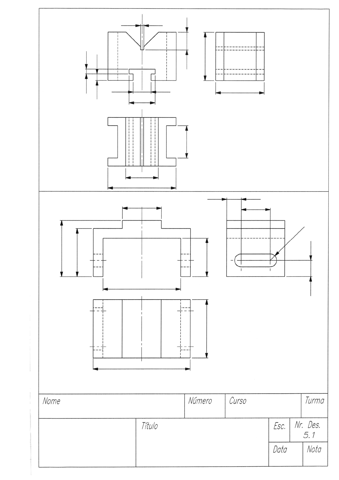 Questão 4/5 - Desenho Técnico Ler em voz alta Devido à dificuldade de visualização do desenho nas três vistas ortogonais, podemos fazer a peça em 3D,