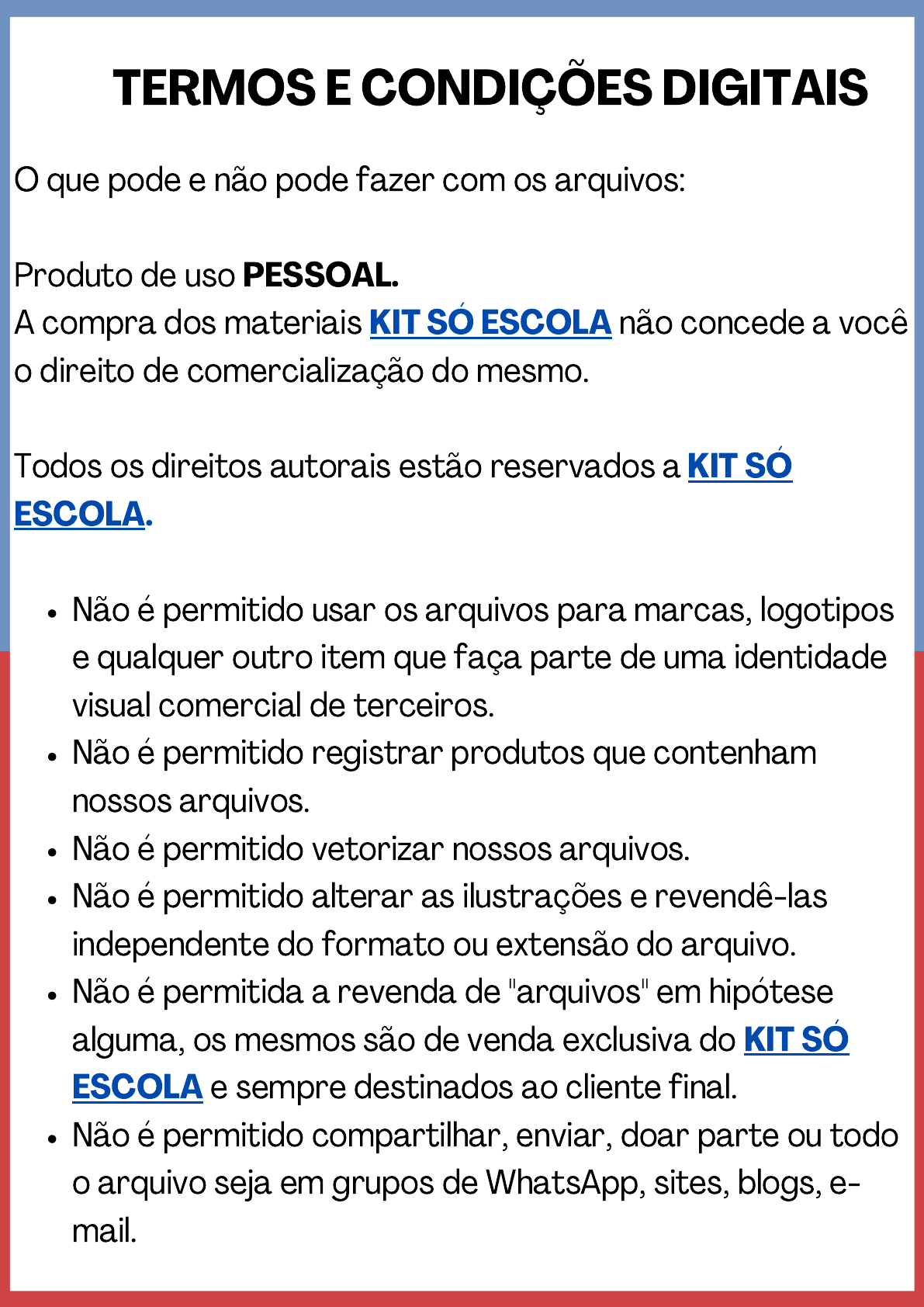 Não é permitido usar os arquivos para marcas, logotipos e qualquer outro item que faça parte de uma identidade visual comercial de terceiros. Não é permitido registrar produtos que contenham nossos arquivos. Não é permitido vetorizar nossos arquivos. Não é permitido alterar as ilustrações e revendê-las independente do formato ou extensão do arquivo. Não é permitida a revenda de "arquivos" em hipótese alguma, os mesmos são de venda exclusiva do KIT SÓ ESCOLA e sempre destinados ao cliente final. Não é permitido compartilhar, enviar, doar parte ou todo o arquivo seja em grupos de WhatsApp, sites, blogs, e- mail. O que pode e não pode fazer com os arquivos: Produto de uso PESSOAL. A compra dos materiais KIT SÓ ESCOLA não concede a você o direito de comercialização do mesmo. Todos os direitos autorais estão reservados a KIT SÓ ESCOLA. TERMOS E CONDIÇÕES DIGITAIS https://kitsoescola.com/loja/ https://kitsoescola.com/loja/ https://kitsoescola.com/loja/ https://kitsoescola.com/loja/
