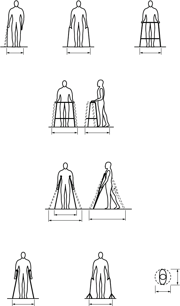 4.1 Pessoas em pé A Figura 1 apresenta dimensões referenciais para deslocamento de pessoas em pé. Dimensões em metros 0,75 0,90 0,90 a) Uma bengala b) Duas bengalas c) Andador com rodas 0,85 0,75 d) Andador rígido – Vistas frontal e lateral 0,95 1,20 1,20 e) Muletas – Vistas frontal e lateral 0,90 0,90 0,60 0, 60 f) Muletas tipo canadense g) Apoio de tripé h) Sem órtese 7 ABNT NBR 9050:2015 © ABNT 2015 - Todos os direitos reservados