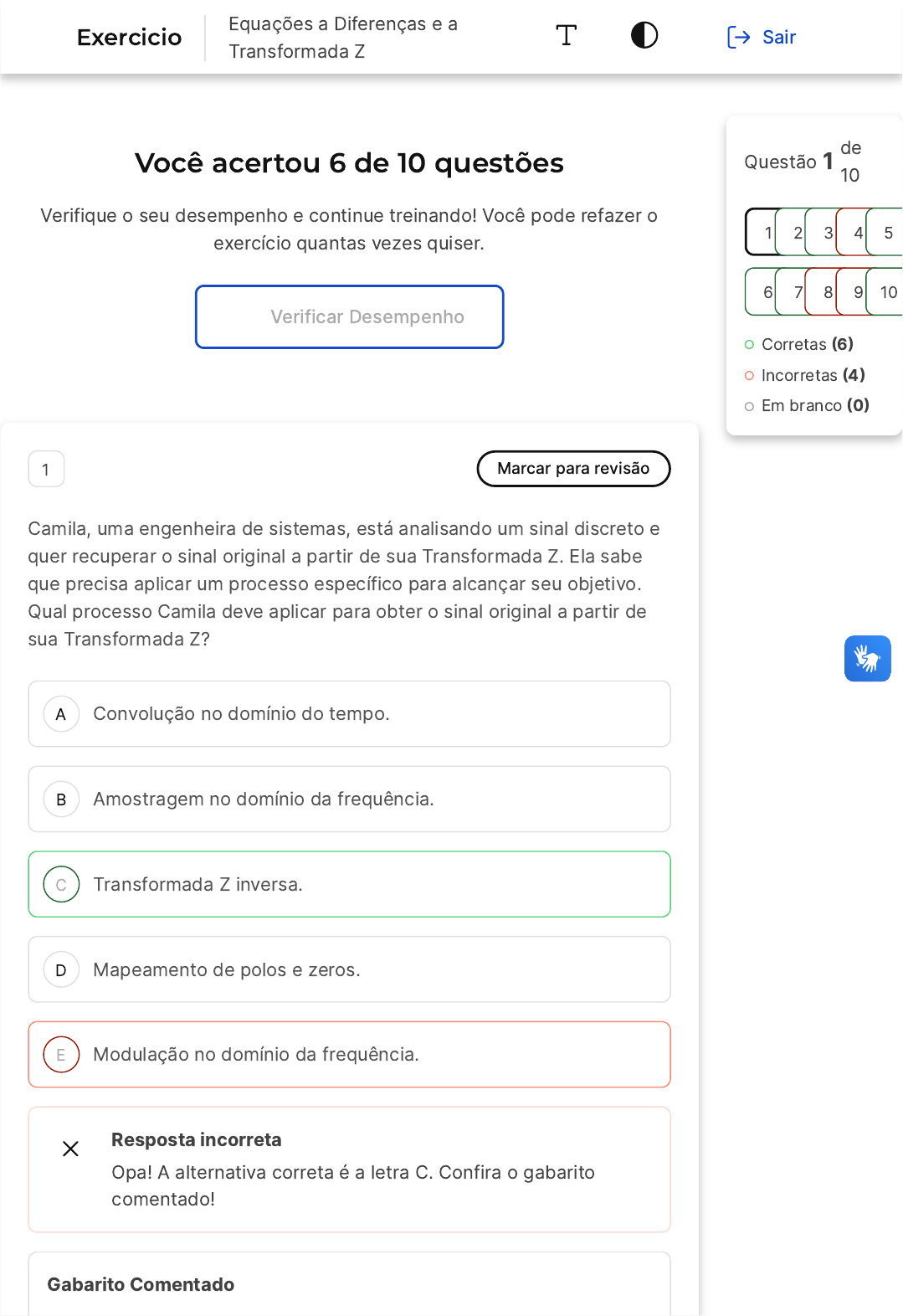 tempo. A afirmativa II é incorreta, visto que a Transformada Z inversa