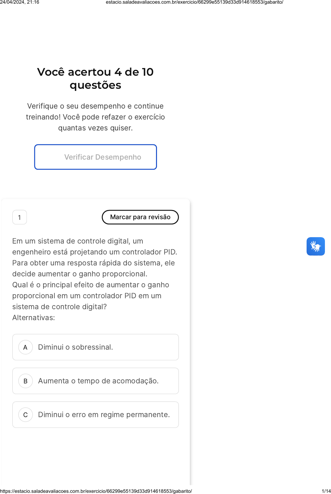 Você acertou 4 de 10 questões Verifique o seu desempenho e continue treinando! Você pode refazer o exercício quantas vezes quiser. Verificar Desempenho A B C 1 Marcar para revisão Em um sistema de controle digital, um engenheiro está projetando um controlador PID. Para obter uma resposta rápida do sistema, ele decide aumentar o ganho proporcional. Qual é o principal efeito de aumentar o ganho proporcional em um controlador PID em um sistema de controle digital? Alternativas: Diminui o sobressinal. Aumenta o tempo de acomodação. Diminui o erro em regime permanente. 24/04/2024, 21:16 estacio.saladeavaliacoes.com.br/exercicio/66299e55139d33d914618553/gabarito/ https://estacio.saladeavaliacoes.com.br/exercicio/66299e55139d33d914618553/gabarito/ 1/14 D E Aumenta a rapidez da resposta do sistema. Reduz a frequência de oscilações do sistema. Resposta correta Parabéns, você selecionou a alternativa correta. Confira o gabarito comentado! Gabarito Comentado Ao aumentar o ganho proporcional em um controlador PID, o principal efeito observado é o aumento da rapidez da resposta do sistema. Isso ocorre porque um maior ganho proporcional intensifica a ação de controle em resposta a um erro, levando a uma resposta mais rápida. No entanto, isso pode também aumentar o risco de oscilações e afetar a estabilidade do sistema. 2 Marcar para revisão Uma equipe está desenvolvendo um controlador PID para um sistema de regulação de pressão em um processo industrial. Após algumas análises, eles decidem usar o segundo método de Ziegler-Nichols para a sintonia do controlador. Durante o teste, eles ajustam o ganho proporcional até que o sistema comece a oscilar. Qual parâmetro a equipe deve observar atentamente para aplicar corretamente o segundo método de Ziegler-Nichols? 24/04/2024, 21:16 estacio.saladeavaliacoes.com.br/exercicio/66299e55139d33d914618553/gabarito/ https://estacio.saladeavaliacoes.com.br/exercicio/66299e55139d33d914618553/gabarito/ 2/14 A B C D E Alternativas: Tempo de resposta do sistema ao ganho proporcional ajustado. Frequência de oscilação no ponto crítico. Amplitude das oscilações no ponto crítico. Tempo de atraso do sistema antes do início da oscilação. Ganho integral necessário para estabilizar as oscilações. Resposta incorreta Opa! A alternativa correta é a letra C. Confira o gabarito comentado! Gabarito Comentado Ao aplicar o segundo método de Ziegler- Nichols, é crucial observar a amplitude das oscilações quando o sistema atinge o ponto crítico com um ganho proporcional específico. Esta observação, junto com o período de oscilação, ajuda a definir os parâmetros apropriados do controlador PID para garantir um controle eficaz e estável do sistema. 3 Marcar para revisão 24/04/2024, 21:16 estacio.saladeavaliacoes.com.br/exercicio/66299e55139d33d914618553/gabarito/ https://estacio.saladeavaliacoes.com.br/exercicio/66299e55139d33d914618553/gabarito/ 3/14 A B C D E Uma estação de tratamento de água implementou um controlador PID digital para regular o fluxo de água. Este controlador precisa ajustar o fluxo de água de acordo com a demanda variável ao longo do dia, mantendo um fluxo constante apesar das flutuações de demanda. Considerando o texto, analise as afirmativas abaixo: I. A função de transferência do controlador PID é essencial para definir sua resposta dinâmica. II. A conversão da função de transferência em uma equação de diferença é desnecessária para controladores digitais. III. O método de Euler é um dos métodos utilizados para discretizar a equação do controlador PID. É correto o que se afirma em: Apenas I e II. Apenas II e III. Apenas I. Apenas I e III. Apenas III. Resposta incorreta Opa! A alternativa correta é a letra D. Confira o gabarito comentado! Gabarito Comentado A afirmativa I é correta, pois a função de transferência do controlador PID é 24/04/2024, 21:16 estacio.saladeavaliacoes.com.br/exercicio/66299e55139d33d914618553/gabarito/ https://estacio.saladeavaliacoes.com.br/exercicio/66299e55139d33d914618553/gabarito/ 4/14 A B C D E fundamental para entender como o controlador responde a diferentes entradas. A afirmativa II é incorreta, pois a conversão da função de transferência em uma equação de diferença é um passo crucial na implementação de controladores PID em sistemas digitais. A afirmativa III está correta, destacando que o método de Euler é uma técnica comum para a discretização de controladores PID em sua forma digital. 4 Marcar para revisão Um engenheiro realizou o teste pelo 1º método de Ziegler-Nichols, em uma planta industrial, para ajuste de um controlador PID. Neste teste, foram levantados os valores dos seguintes parâmetros: � Constante de tempo: T�10 s; e � Atraso L�2,5 s. Qual deverá ser a função de transferência do controlador PID ajustado? HPID(s) = 7, 2(1 + + 0, 5s)1 5s HPID(s) = 1, 8(1 + + 4s)1 6s HPID(s) = 4, 8(1 + + 1, 5s)1 6s HPID(s) = 4, 8(1 + + 1, 25s) 0,2 s HPID(s) = 9, 6(1 + + 2s)1 5s 24/04/2024, 21:16 estacio.saladeavaliacoes.com.br/exercicio/66299e55139d33d914618553/gabarito/ https://estacio.saladeavaliacoes.com.br/exercicio/66299e55139d33d914618553/gabarito/ 5/14 Resposta incorreta Opa! A alternativa correta é a letra D. Confira o gabarito comentado! Gabarito Comentado A questão se refere ao ajuste de um controlador PID utilizando o 1º método de Ziegler-Nichols. Neste método, a função de transferência do controlador PID é determinada a partir dos parâmetros levantados no teste, que são a constante de tempo �T� e o atraso �L�. No caso apresentado, os valores de T e L são, respectivamente, 10 s e 2,5 s. Utilizando esses valores na fórmula do método de Ziegler-Nichols para o controlador PID, obtemos a função de transferência , que corresponde à alternativa D. Portanto, a alternativa D é a correta. HPID(s) = 4, 8(1 + + 1, 25s) 0,2 s 5 Marcar para revisão Um engenheiro está projetando um sistema 